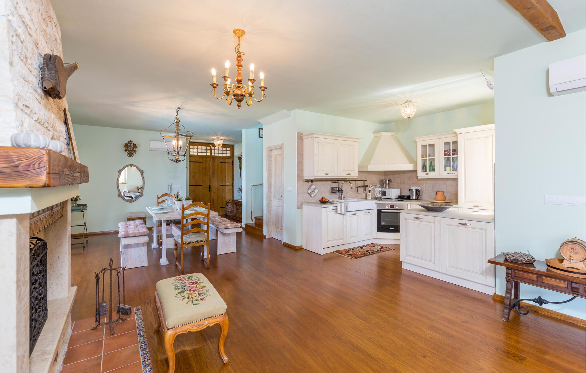 Mitten in der ländlichen Idylle Istriens erwartet Sie dieses komfortable Natursteinhaus mit lichtdurchfluteten, liebevoll eingerichteten Räumlichkeiten. Bereiten Sie in der voll ausgestatteten Landhausküche köstliche Mahlzeiten zu, genießen Sie gemütliche Spieleabende auf der komfortablen Couch oder plaudern Sie am großzügigen Esstisch bei einem Glas kroatischen Weins.