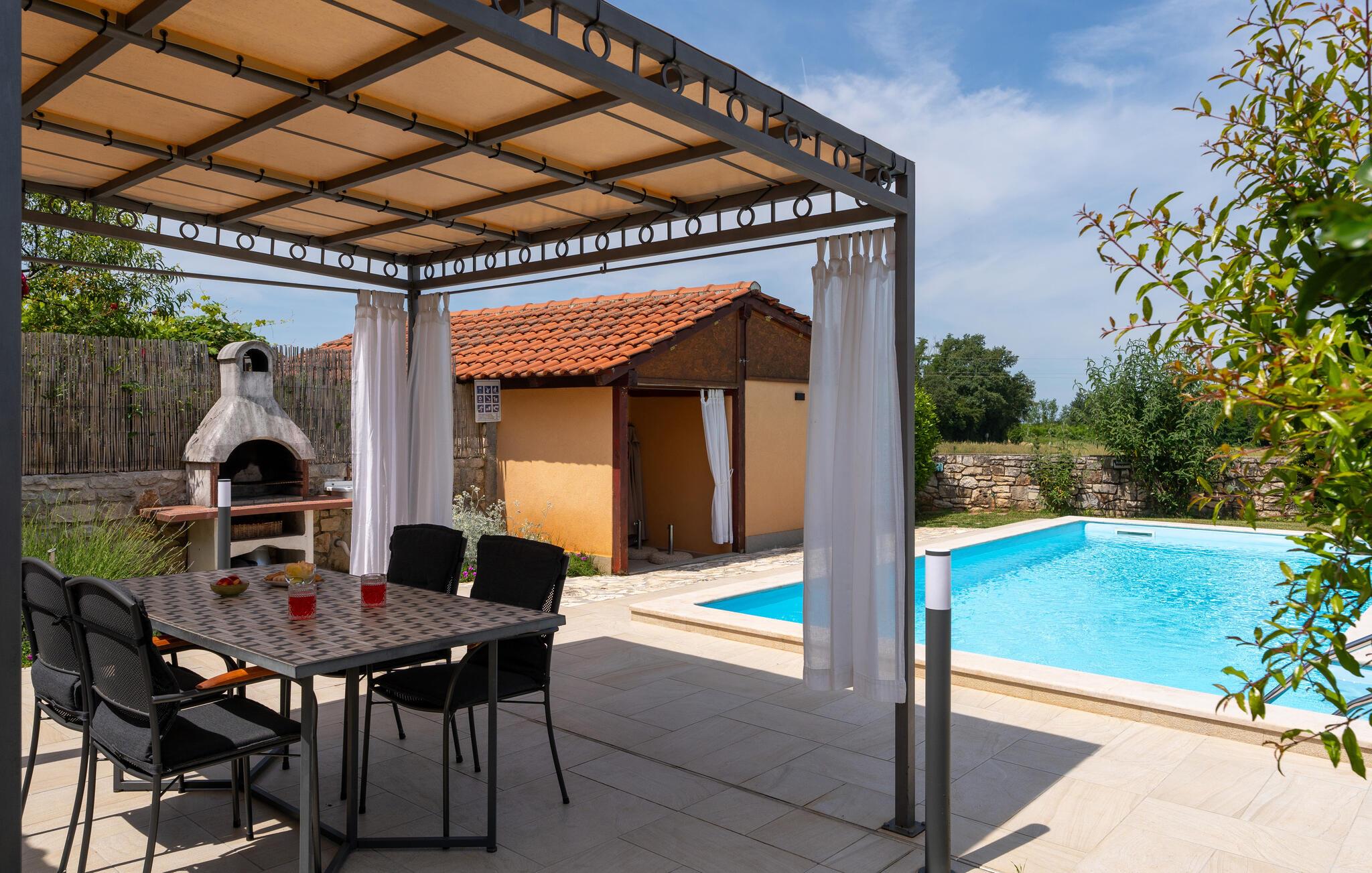 Das Haus wurde 2016 renoviert, mit meistens neuen Möbeln eingerichtet und verfügt über ein schönes Grundstück mit privatem Pool, Grillkamin, zwei Terrassen mit Esstisch für Mahlzeiten im Freien und zwei Parkplätze. Nur wenige Minuten Autofahrt entfernt befindet sich ein Geschäft, Pizzeria, typische Taverne, Geldautomat, Café und andere Angebote.