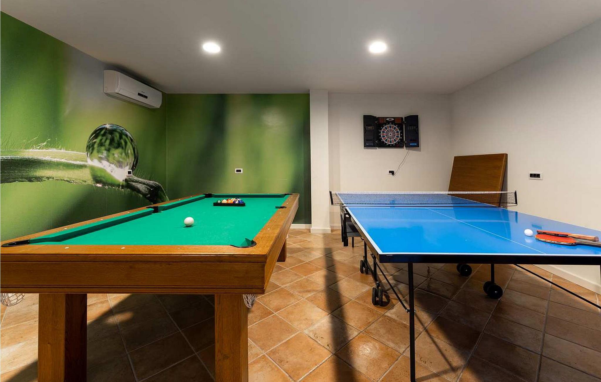Der Außenbereich eignet sich perfekt zum Essen und für Unterhaltung und verfügt über einen überdachten Essbereich mit Fernseher, einen Grillkamin und einen großen Kinderspielbereich. Ein Billardtisch und eine Tischtennisplatte im Inneren sorgen dafür, dass die Gäste aktiv bleiben.