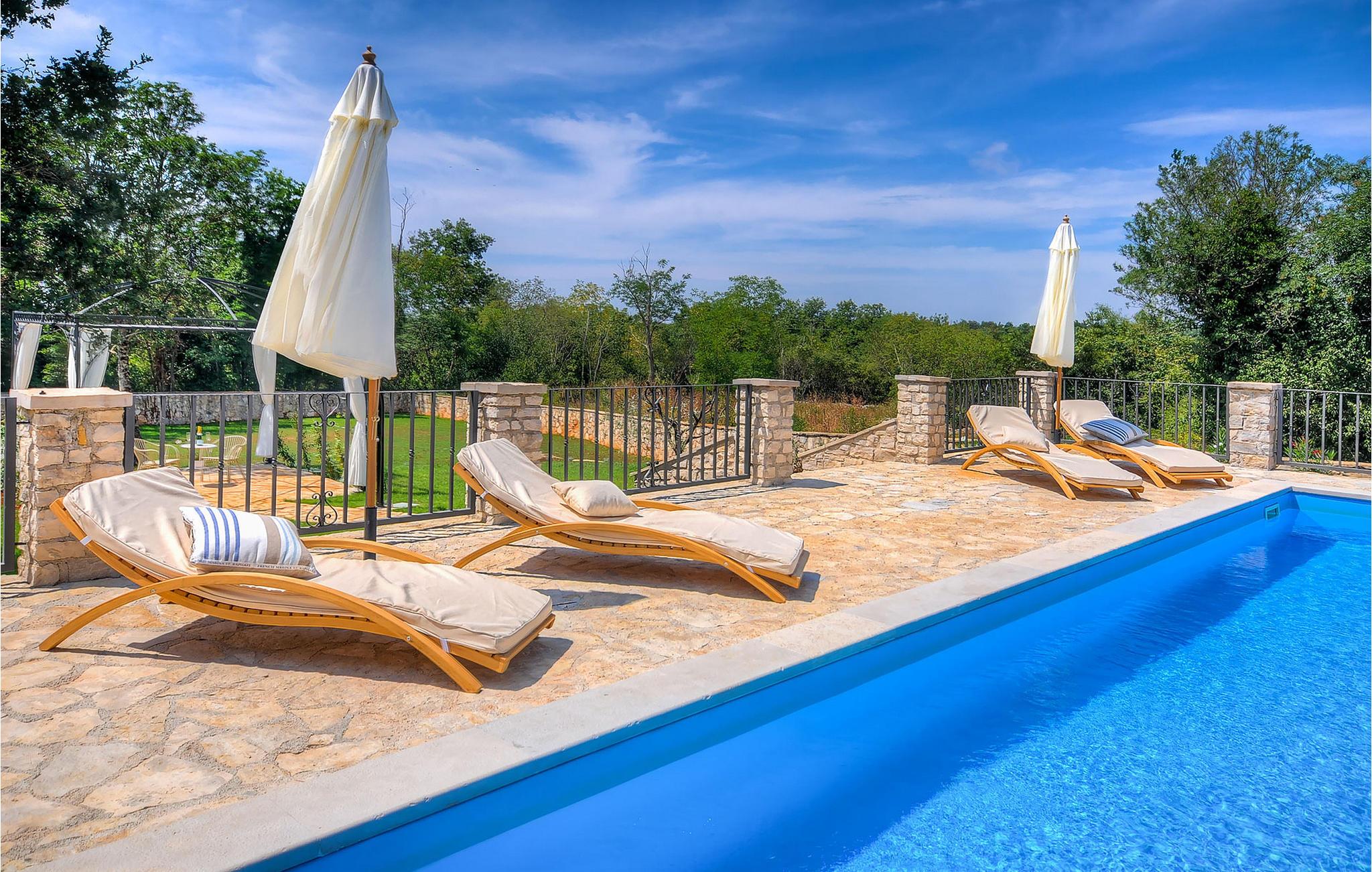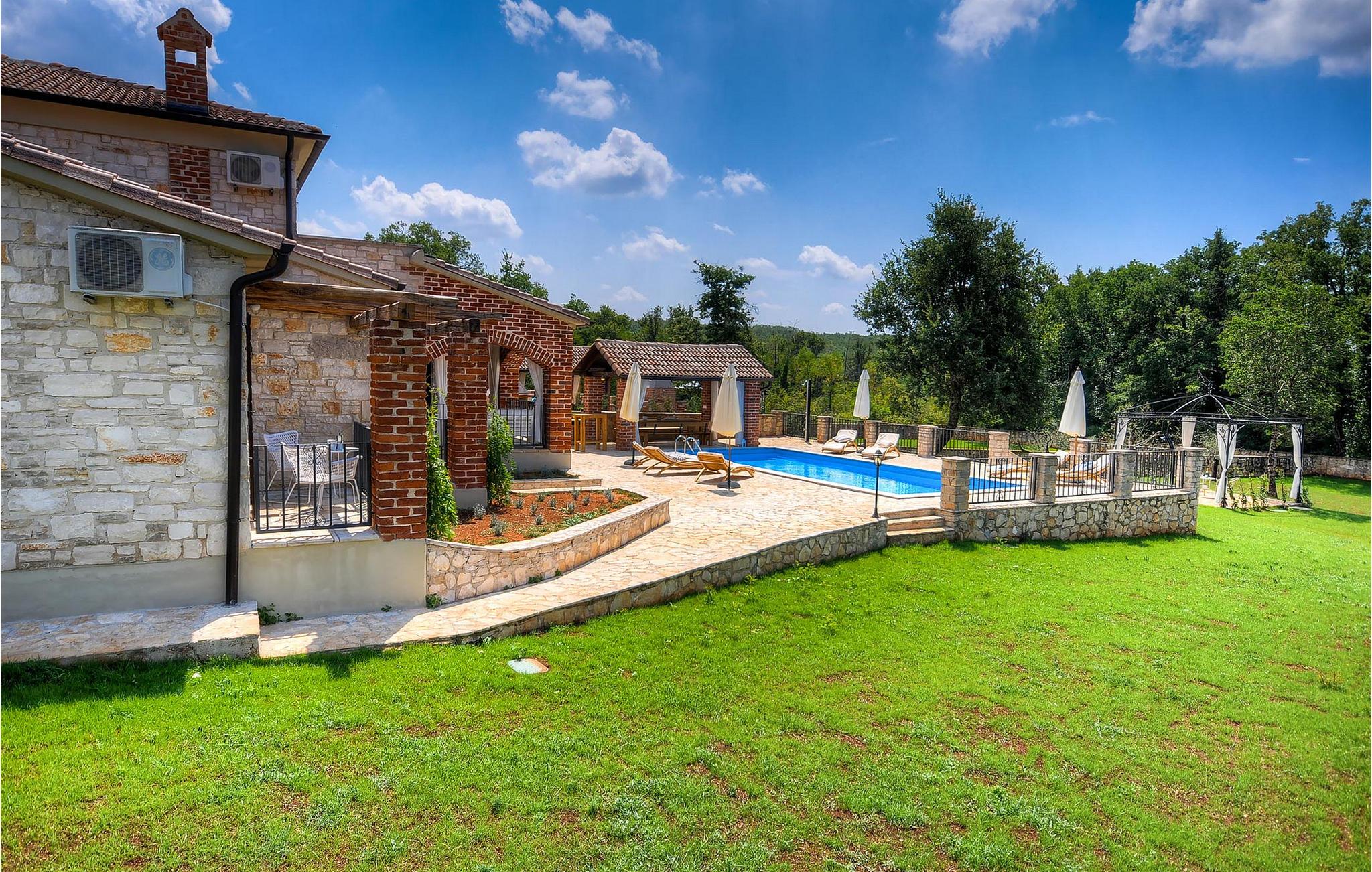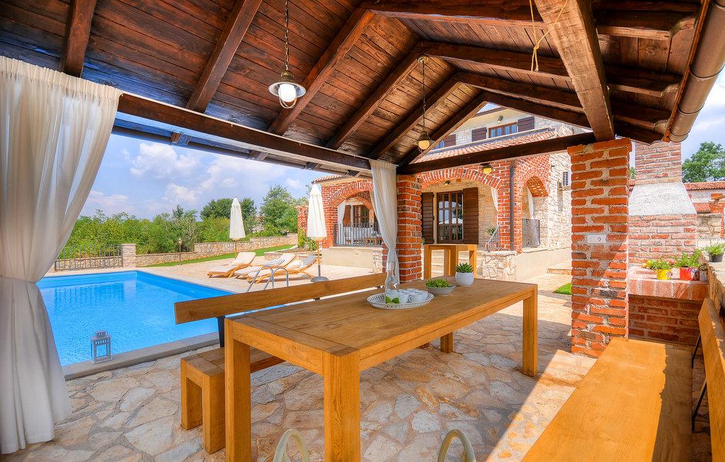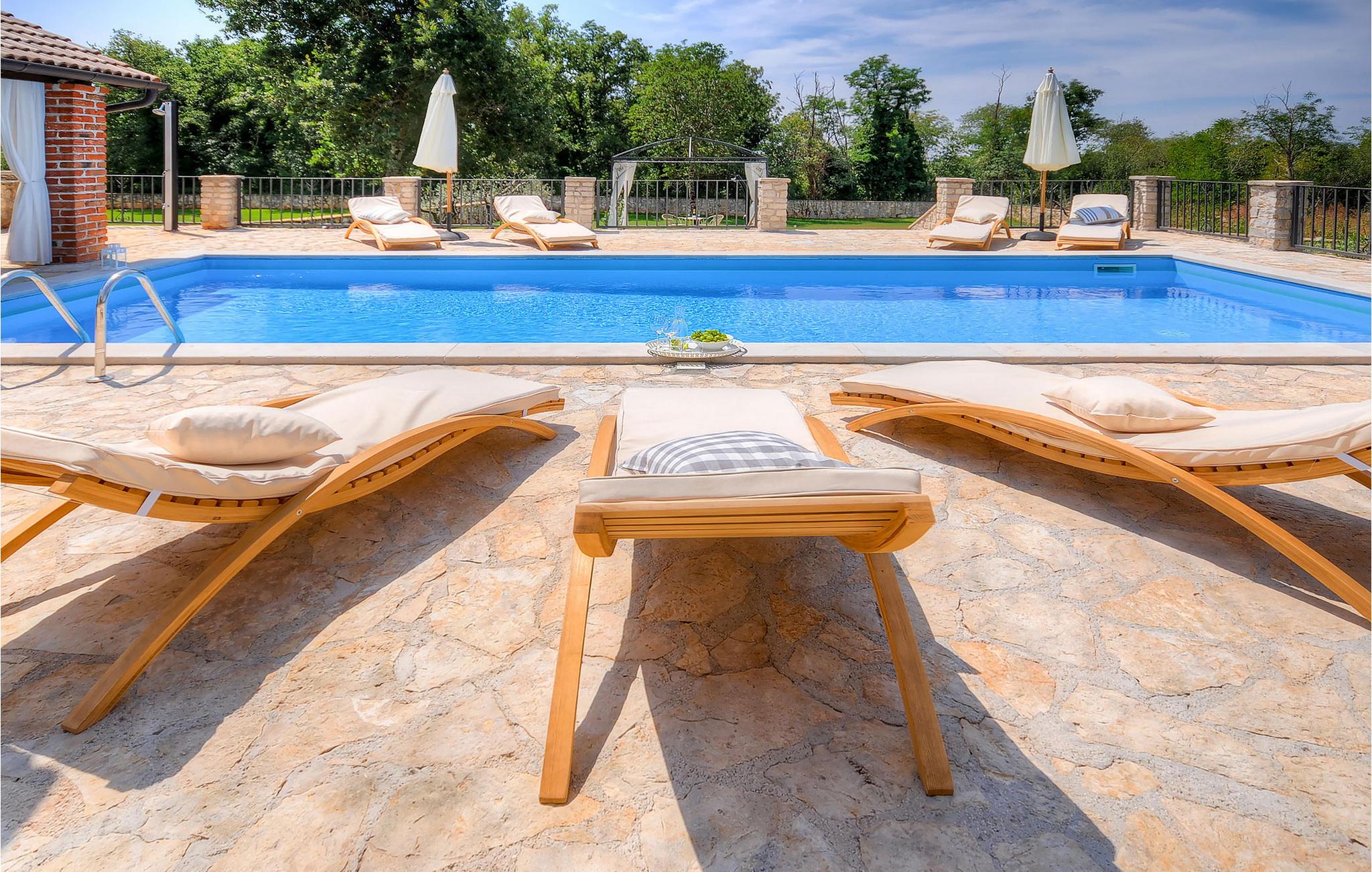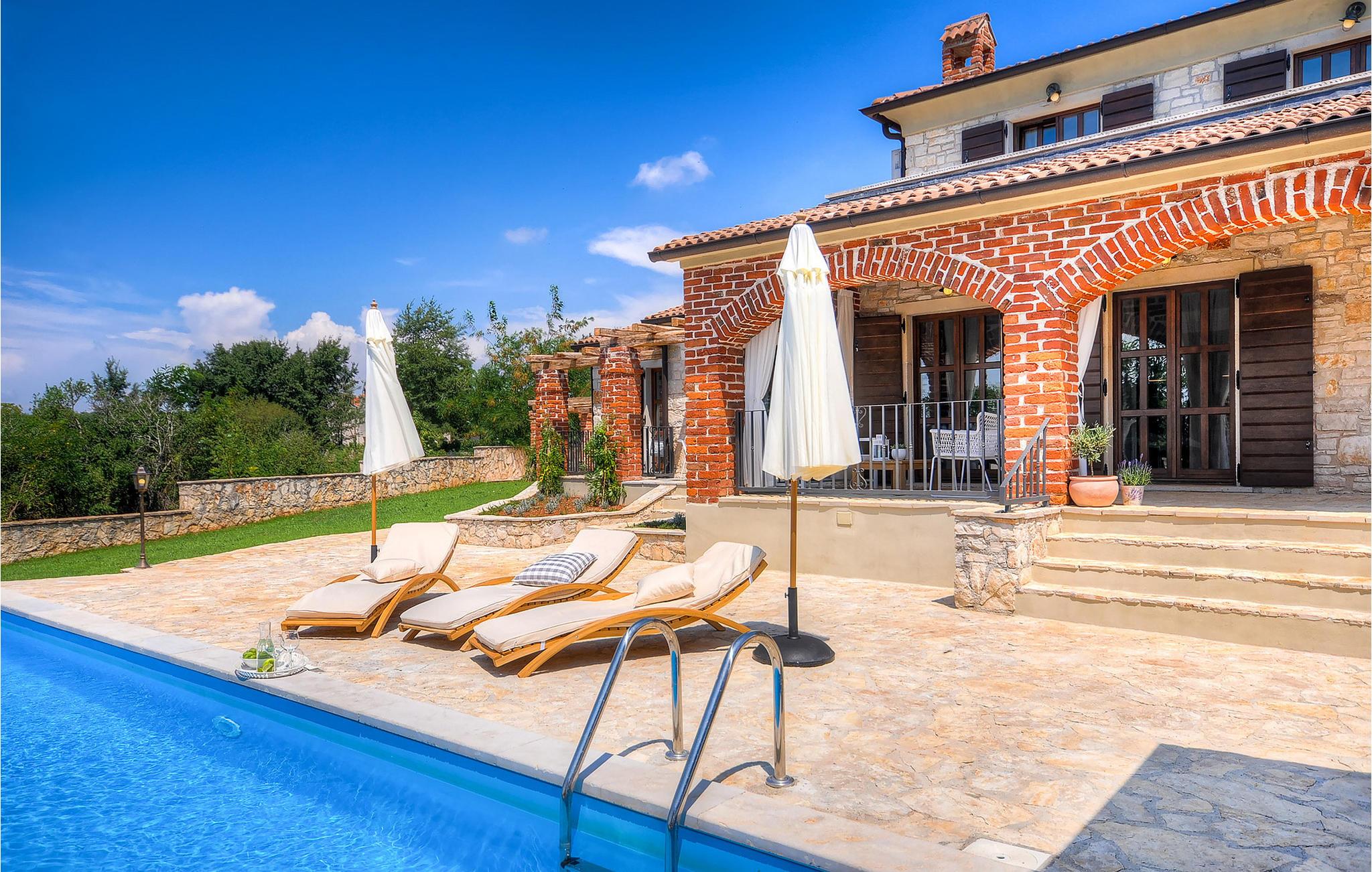 Die wunderschöne Villa Oxalis, benannt nach der Blumenart, bietet einen angenehmen Urlaub für bis zu 8 Personen. Im Erdgeschoss befindet sich der offen konzipierte Wohn- und Essbereich sowie die voll ausgestattete Küche. Die gesamte rustikale Einrichtung mit Kamin im Wohnzimmer verleiht dem offenen Raum eine gemütliche und warme Atmosphäre, in der man sich nur wohl fühlen kann. Zwei bequeme Schlafzimmer, ein Badezimmer und eine Toilette befinden sich ebenfalls auf dieser Etage. Eine Treppe führt Sie zu den weiteren zwei Schlafzimmern, beide mit eigenem Badezimmer. In der gesamten Villa werden Ihnen die liebevollen Details auffallen. Der Außenbereich umfasst einen komplett eingezäunten grünen Garten. Aus dem Pool können Sie den herrlichen Ausblick in die Natur genießen und danach rund um den Pool auf den Liegen entspannen. Auf der Terrasse befindet sich der Essbereich mit Holzkohlgrill, der dazu einlädt, leckere Gerichte zuzubereiten. Die Villa Oxalis ist klimatisiert und verfügt über Internetzugang sowie private Parkplätze für 4 Autos. Sie bietet einfach alles für einen erholsamen Urlaub in Istrien. Višnjan ist ein kleiner Ort in Istrien, 13 Kilometer östlich von Porec entfernt. Im pittoresken Višnjan gibt es ein weltberühmtes astronomisches Observatorium, welches langjährige internationale Sommerprogramme für Jugendliche im Bereich Astronomie, Archäologie, Meeresbiologie und Ähnliches bietet. Višnjan ist auch bekannt für seinen Olivenanbau und auch einer der letzten Orte des istrischen autochthonen Rindes Boškarin.
