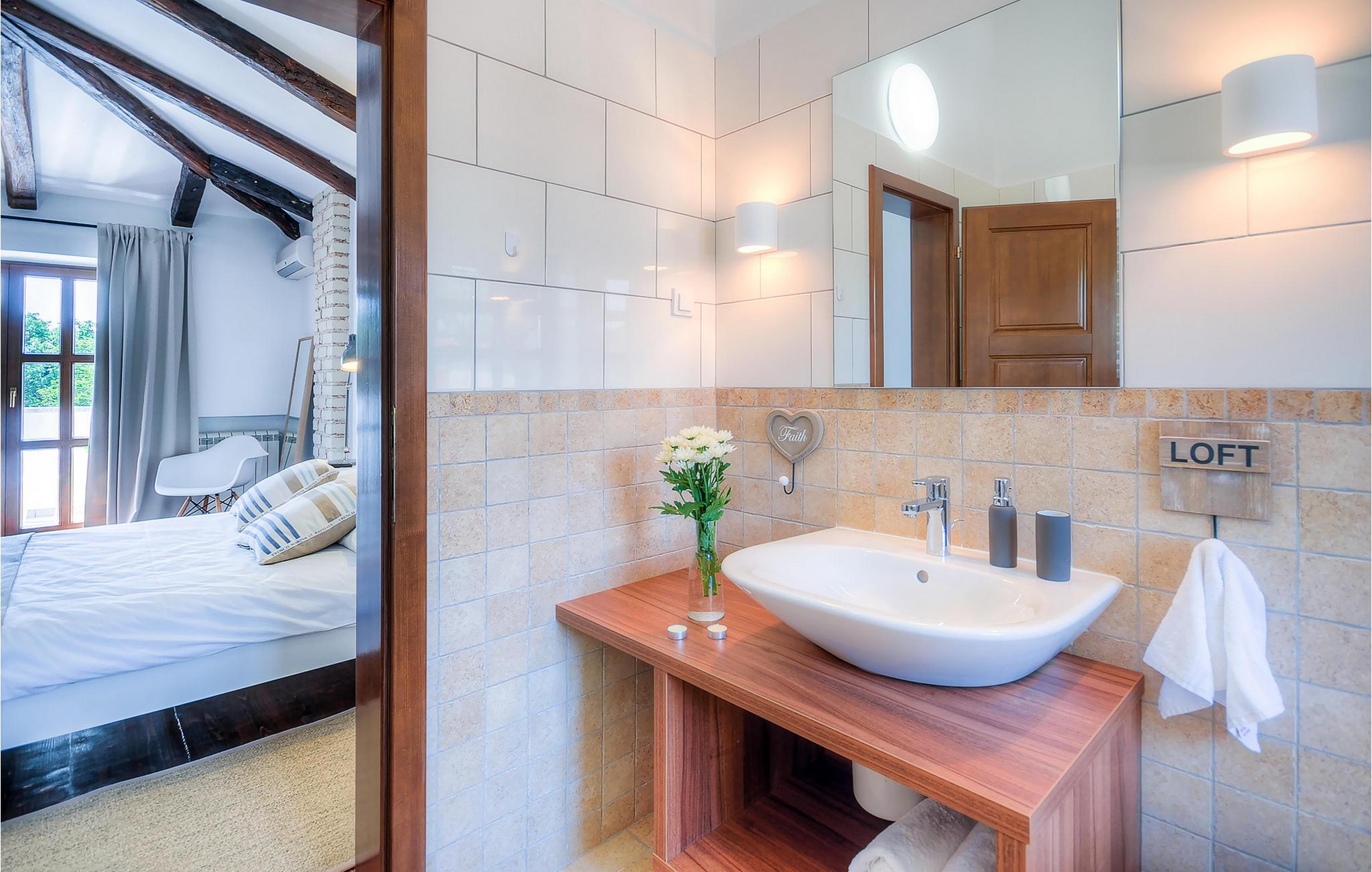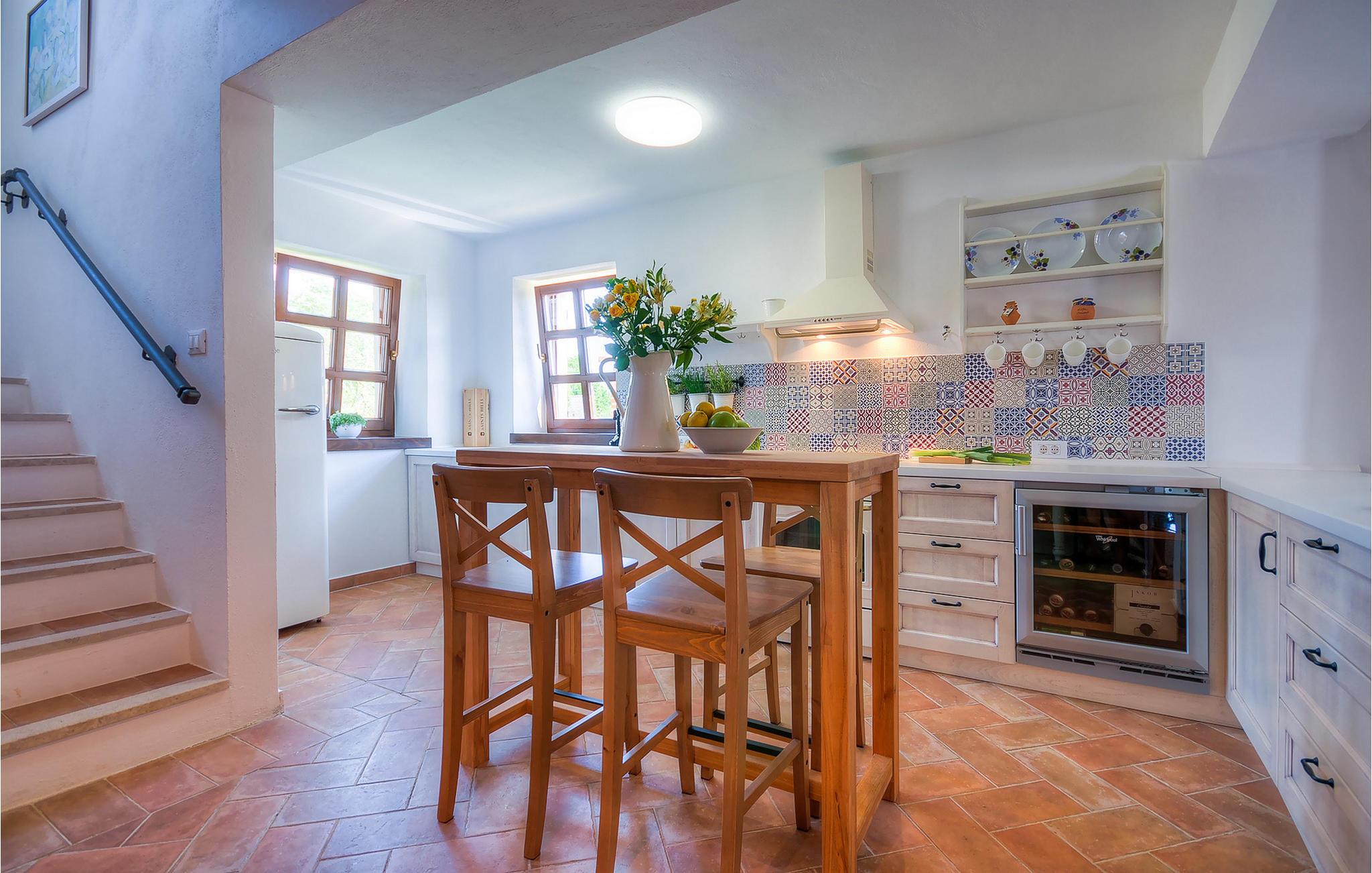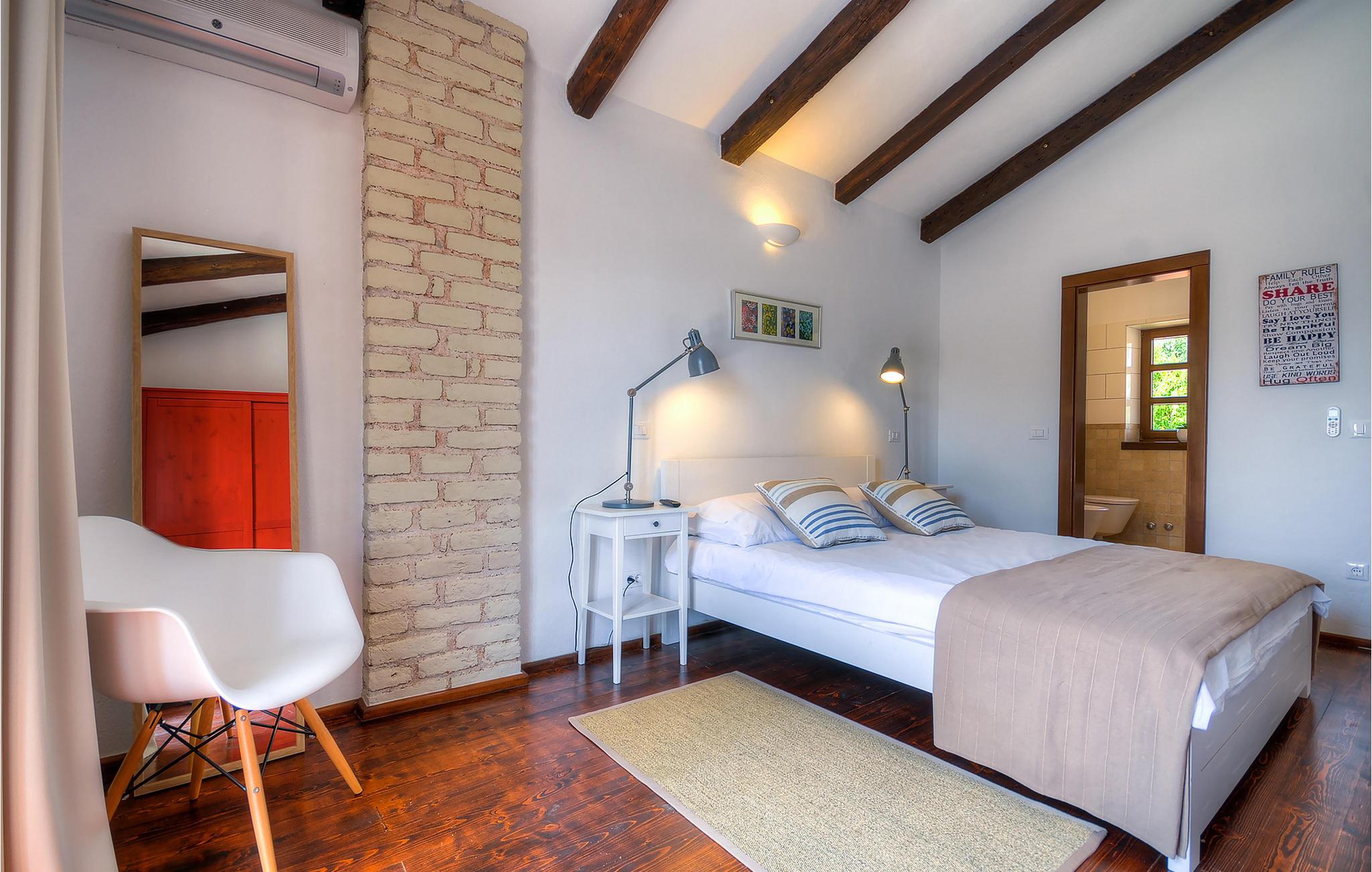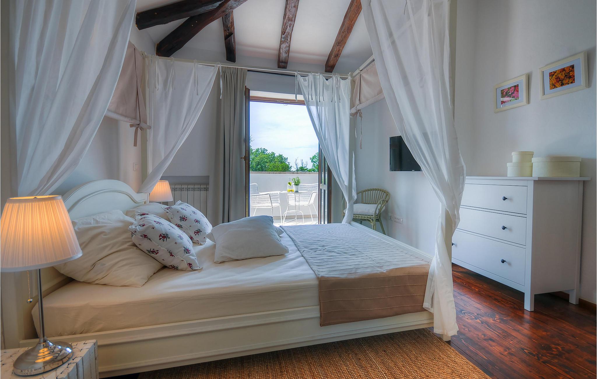 Die wunderschöne Villa Oxalis, benannt nach der Blumenart, bietet einen angenehmen Urlaub für bis zu 8 Personen. Im Erdgeschoss befindet sich der offen konzipierte Wohn- und Essbereich sowie die voll ausgestattete Küche. Die gesamte rustikale Einrichtung mit Kamin im Wohnzimmer verleiht dem offenen Raum eine gemütliche und warme Atmosphäre, in der man sich nur wohl fühlen kann. Zwei bequeme Schlafzimmer, ein Badezimmer und eine Toilette befinden sich ebenfalls auf dieser Etage. Eine Treppe führt Sie zu den weiteren zwei Schlafzimmern, beide mit eigenem Badezimmer. In der gesamten Villa werden Ihnen die liebevollen Details auffallen. Der Außenbereich umfasst einen komplett eingezäunten grünen Garten. Aus dem Pool können Sie den herrlichen Ausblick in die Natur genießen und danach rund um den Pool auf den Liegen entspannen. Auf der Terrasse befindet sich der Essbereich mit Holzkohlgrill, der dazu einlädt, leckere Gerichte zuzubereiten. Die Villa Oxalis ist klimatisiert und verfügt über Internetzugang sowie private Parkplätze für 4 Autos. Sie bietet einfach alles für einen erholsamen Urlaub in Istrien. Višnjan ist ein kleiner Ort in Istrien, 13 Kilometer östlich von Porec entfernt. Im pittoresken Višnjan gibt es ein weltberühmtes astronomisches Observatorium, welches langjährige internationale Sommerprogramme für Jugendliche im Bereich Astronomie, Archäologie, Meeresbiologie und Ähnliches bietet. Višnjan ist auch bekannt für seinen Olivenanbau und auch einer der letzten Orte des istrischen autochthonen Rindes Boškarin.