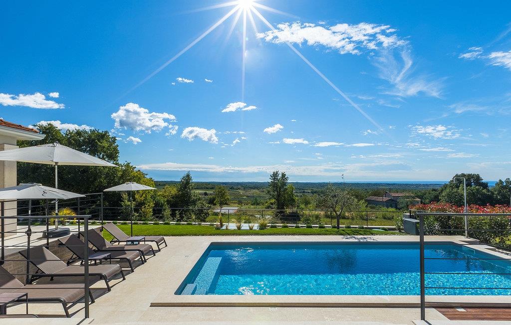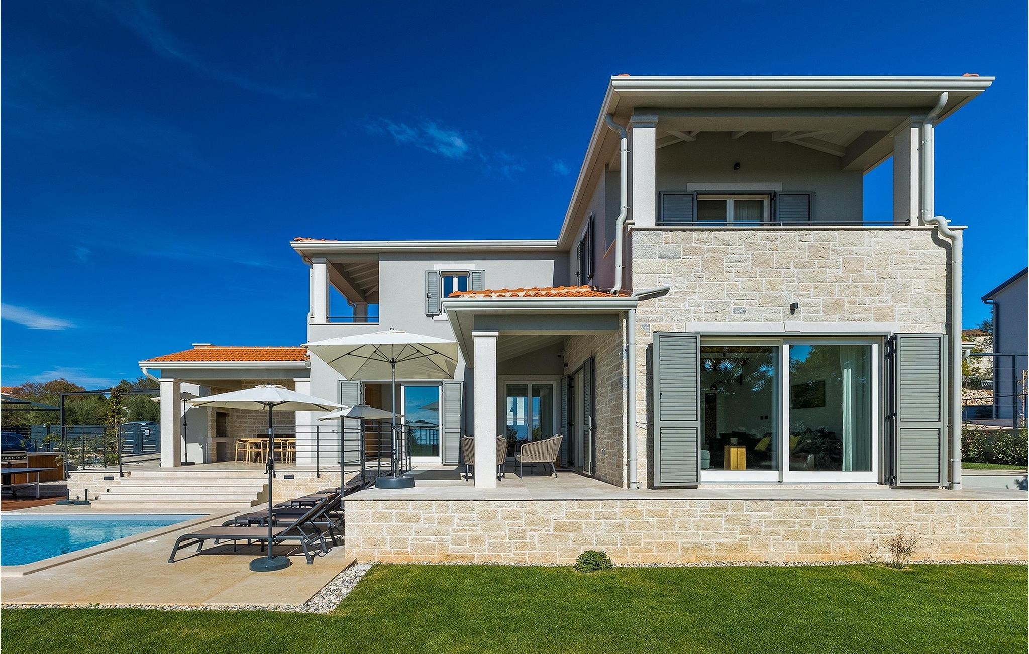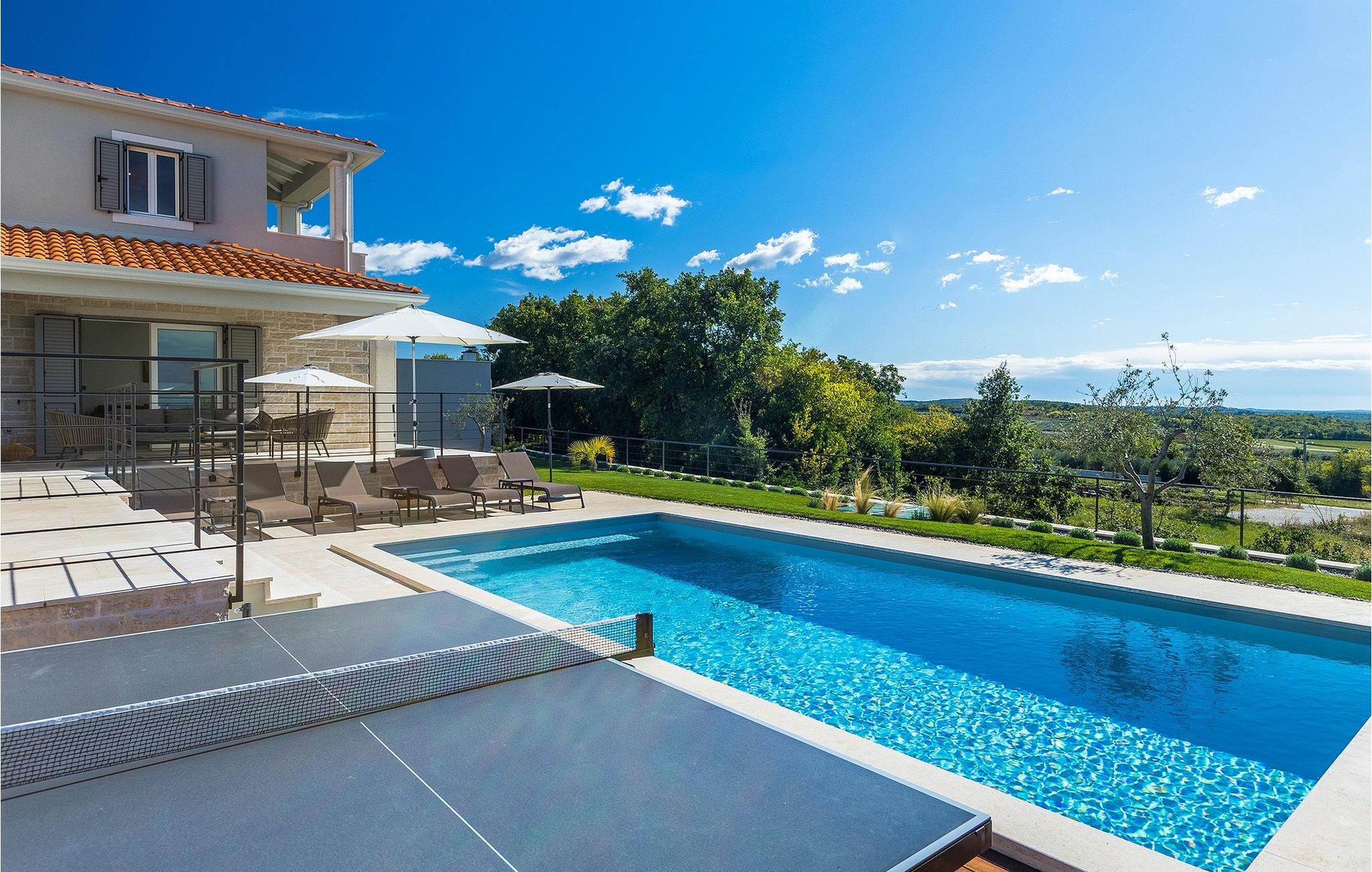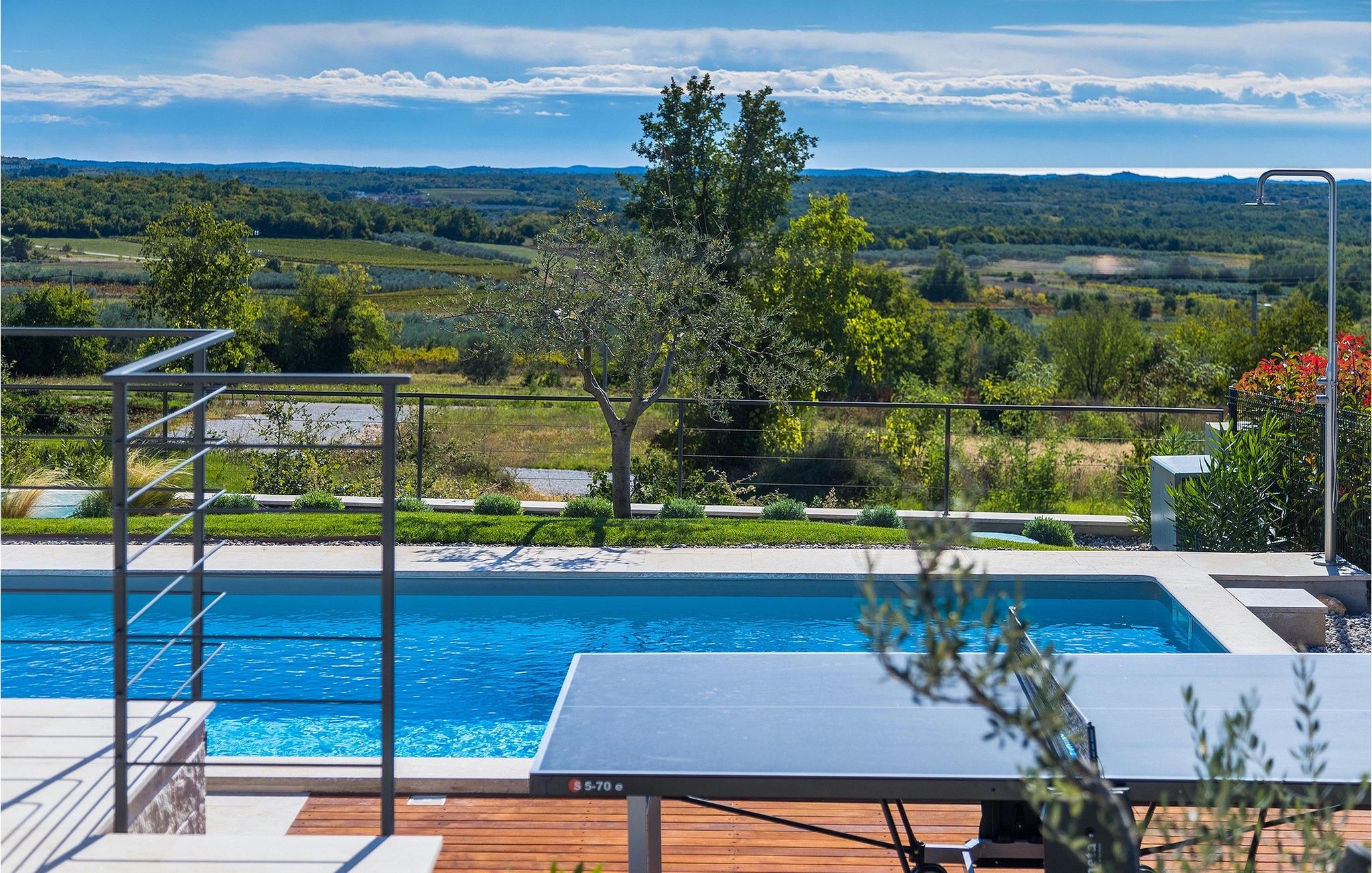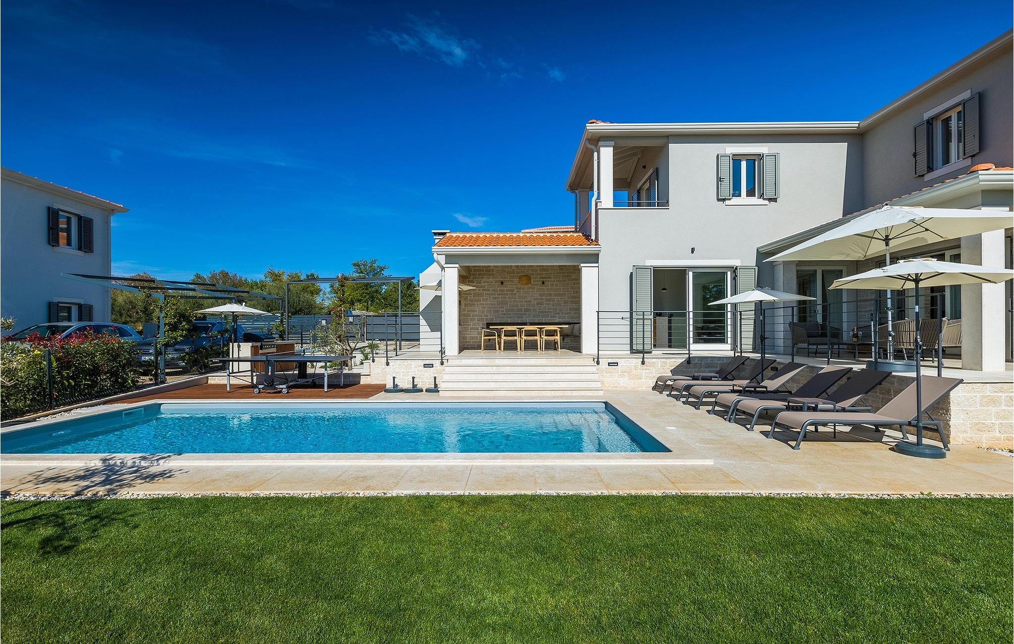 Das Erdgeschoss öffnet sich zur großen Terrasse mit überdachtem Freisitz mit großem Esstisch und offenem Kamin für kühlere Abende. Hier können Sie sich im Pool abkühlen, sich in der überdachten Lounge entspannen oder eine Runde Tischtennis spielen. Zeigen Sie Ihre Grillkenntnisse am Gasgrill der Outdoorküche, die sich direkt neben dem überdachten Freisitz befindet, und genießen Sie die zubereiteten Gerichte im Freien. Im ersten Stock befinden sich die restlichen Schlafzimmer, zwei mit Doppelbett und jeweils einem überdachten Balkon und eins mit zwei Einzelbetten. Eines der Doppelbettzimmer verfügt über ensuite Bad, und die anderen zwei Zimmer teilen sich das Badezimmer. Auch von den Schlafzimmern aus können Sie den schönen Meerblick genießen. Im gesamten Erdgeschoss und in den Badezimmern gibt es Fußbodenheizung für die kühlere Jahreszeit. Villa Regina ist die beste Wahl für einen unvergesslichen Urlaub mit Familie und Freunden. Buchen Sie Villa Regina und genießen Sie das Umland von PorecVilla Regina liegt im ruhigen Dorf Markovac, welches zum charmanten Ort Visnjan gehört. Auf einem Hügel gelegen, bietet Ihnen Visnjan spektakuläre Meerblicke. Wenn Sie einen ungestörten Blick in die Sterne werfen wollen, müssen Sie unbedingt das Observatorium in Visnjan besuchen. Bummeln Sie durch die verwinkelten Gassen aus Kopfsteinpflaster und genießen Sie das reiche Kulturerbe dieser Stadt. Obendrein lassen sich in den Restaurants der Altstadt herrliche Speisen nach traditioneller Rezeptur schmecken. Sehr empfehlenswert ist ein Ausflug zu der historischen mittelalterlichen Stadt Porec, die nur eine kurze Fahrt von der Villa entfernt ist. Die UNESCO-gelistete Euphrasius-Basilika, der historische Stadtkern von Porec, zahlreiche attraktive Strände sowie ausgezeichnete Restaurants sind nur einige der Gründe dafür, dass Porec eines der touristischen Hauptziele Istriens ist. Wenn Sie eher ruhigere Orte bevorzugen, ist die Stadt Novigrad ein Muss für Sie. Das Fischerstädtchen verzaubert alle Besucher mit seinen Stadtmauern und Türmen. Novigrad ist auch für sein reiches gastronomisches Angebot bekannt. Alle Fahrradliebhaber kommen in dieser Villa auf jeden Fall auf ihre Kosten, da die Villa nur 30m von dem berühmten Radweg Parenzana entfernt ist.
