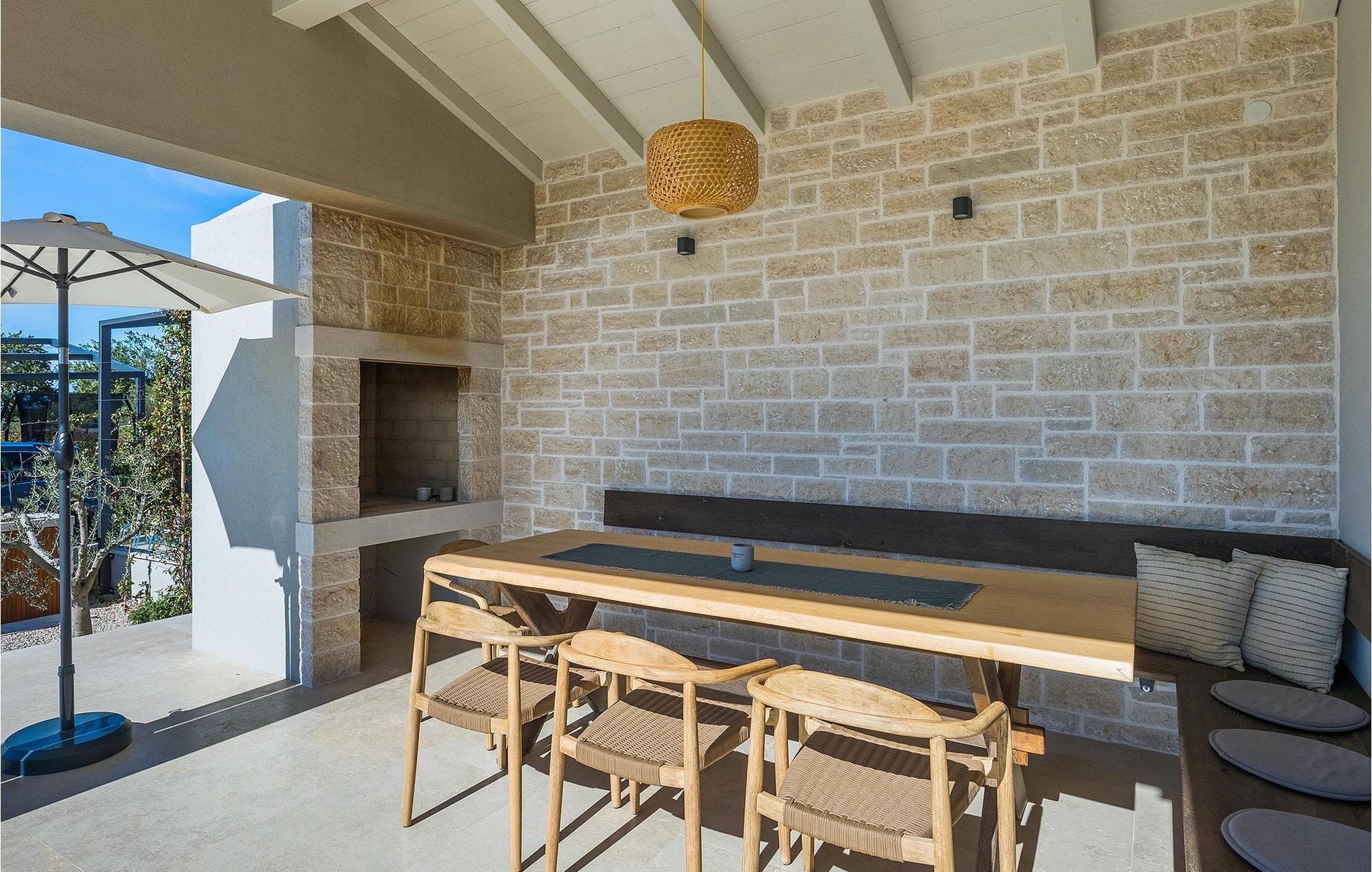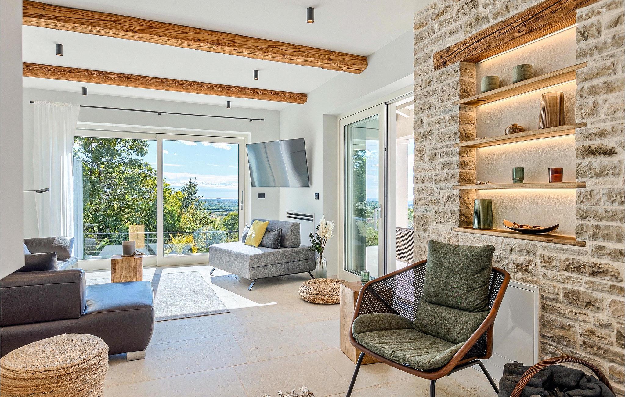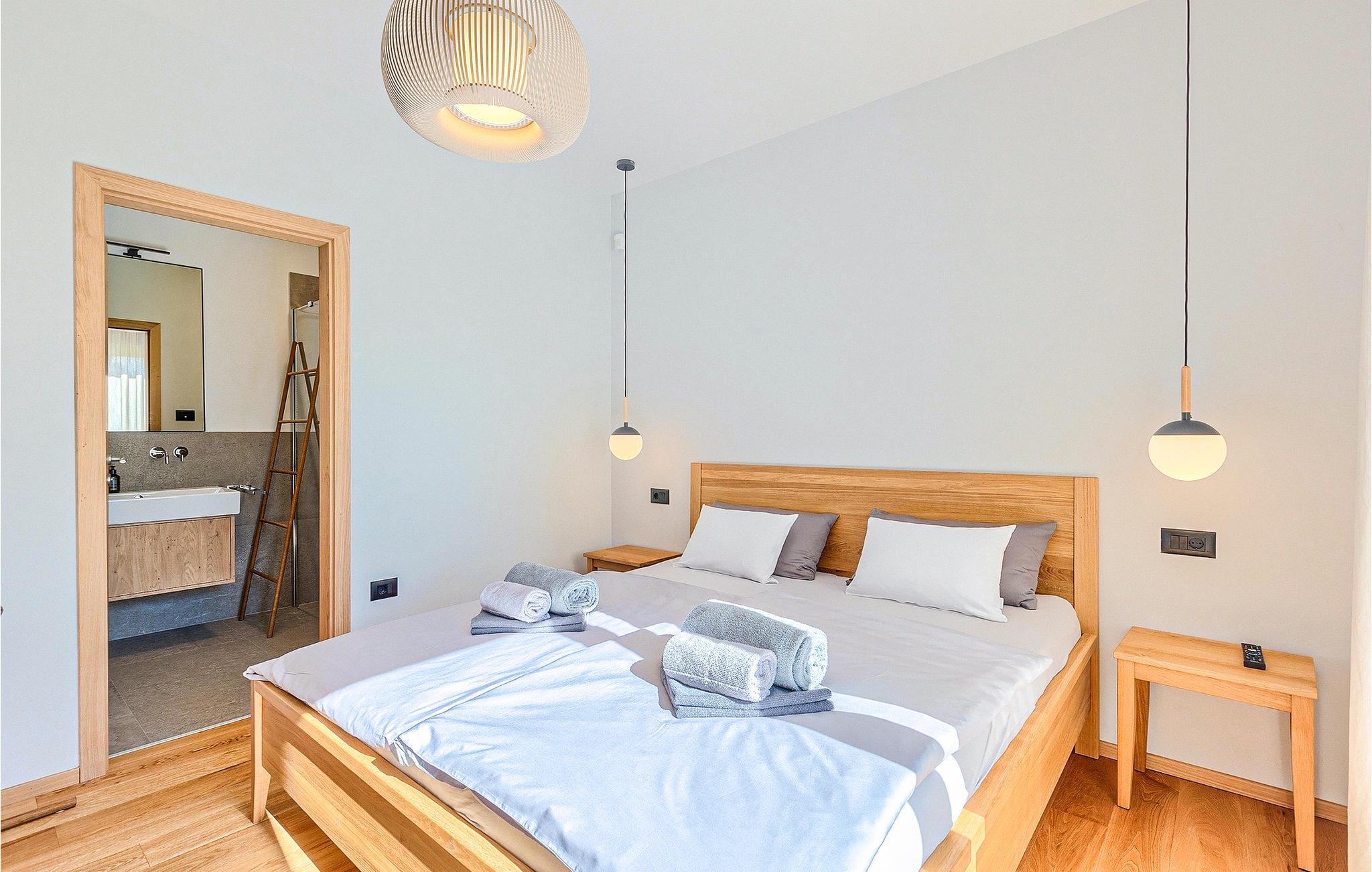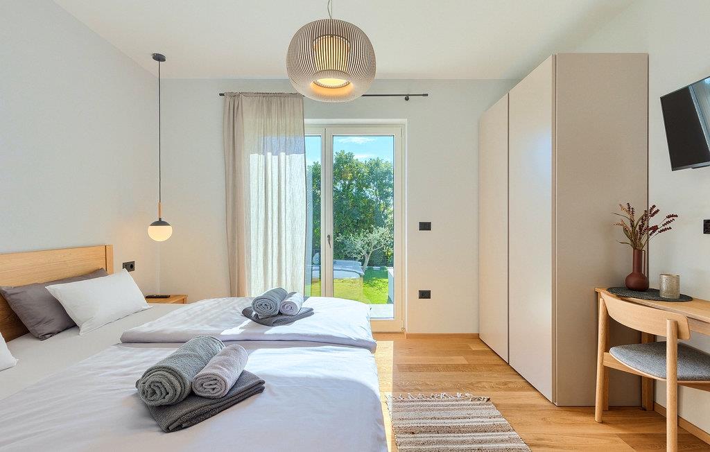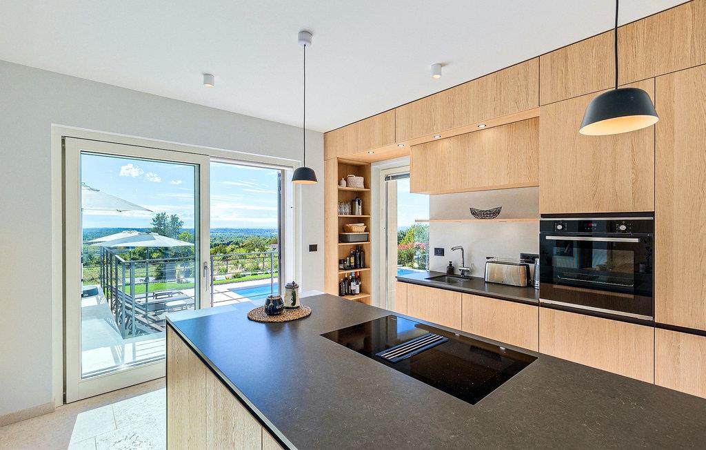 Das Erdgeschoss öffnet sich zur großen Terrasse mit überdachtem Freisitz mit großem Esstisch und offenem Kamin für kühlere Abende. Hier können Sie sich im Pool abkühlen, sich in der überdachten Lounge entspannen oder eine Runde Tischtennis spielen. Zeigen Sie Ihre Grillkenntnisse am Gasgrill der Outdoorküche, die sich direkt neben dem überdachten Freisitz befindet, und genießen Sie die zubereiteten Gerichte im Freien. Im ersten Stock befinden sich die restlichen Schlafzimmer, zwei mit Doppelbett und jeweils einem überdachten Balkon und eins mit zwei Einzelbetten. Eines der Doppelbettzimmer verfügt über ensuite Bad, und die anderen zwei Zimmer teilen sich das Badezimmer. Auch von den Schlafzimmern aus können Sie den schönen Meerblick genießen. Im gesamten Erdgeschoss und in den Badezimmern gibt es Fußbodenheizung für die kühlere Jahreszeit. Villa Regina ist die beste Wahl für einen unvergesslichen Urlaub mit Familie und Freunden. Buchen Sie Villa Regina und genießen Sie das Umland von PorecVilla Regina liegt im ruhigen Dorf Markovac, welches zum charmanten Ort Visnjan gehört. Auf einem Hügel gelegen, bietet Ihnen Visnjan spektakuläre Meerblicke. Wenn Sie einen ungestörten Blick in die Sterne werfen wollen, müssen Sie unbedingt das Observatorium in Visnjan besuchen. Bummeln Sie durch die verwinkelten Gassen aus Kopfsteinpflaster und genießen Sie das reiche Kulturerbe dieser Stadt. Obendrein lassen sich in den Restaurants der Altstadt herrliche Speisen nach traditioneller Rezeptur schmecken. Sehr empfehlenswert ist ein Ausflug zu der historischen mittelalterlichen Stadt Porec, die nur eine kurze Fahrt von der Villa entfernt ist. Die UNESCO-gelistete Euphrasius-Basilika, der historische Stadtkern von Porec, zahlreiche attraktive Strände sowie ausgezeichnete Restaurants sind nur einige der Gründe dafür, dass Porec eines der touristischen Hauptziele Istriens ist. Wenn Sie eher ruhigere Orte bevorzugen, ist die Stadt Novigrad ein Muss für Sie. Das Fischerstädtchen verzaubert alle Besucher mit seinen Stadtmauern und Türmen. Novigrad ist auch für sein reiches gastronomisches Angebot bekannt. Alle Fahrradliebhaber kommen in dieser Villa auf jeden Fall auf ihre Kosten, da die Villa nur 30m von dem berühmten Radweg Parenzana entfernt ist.