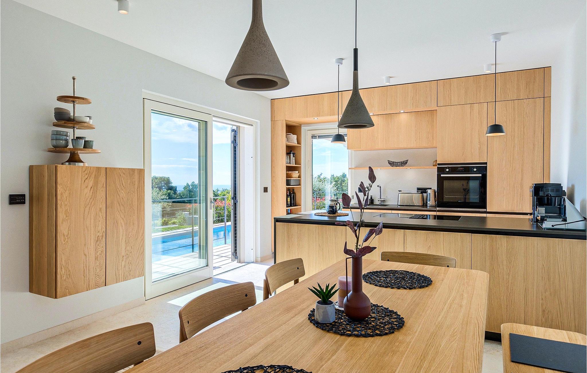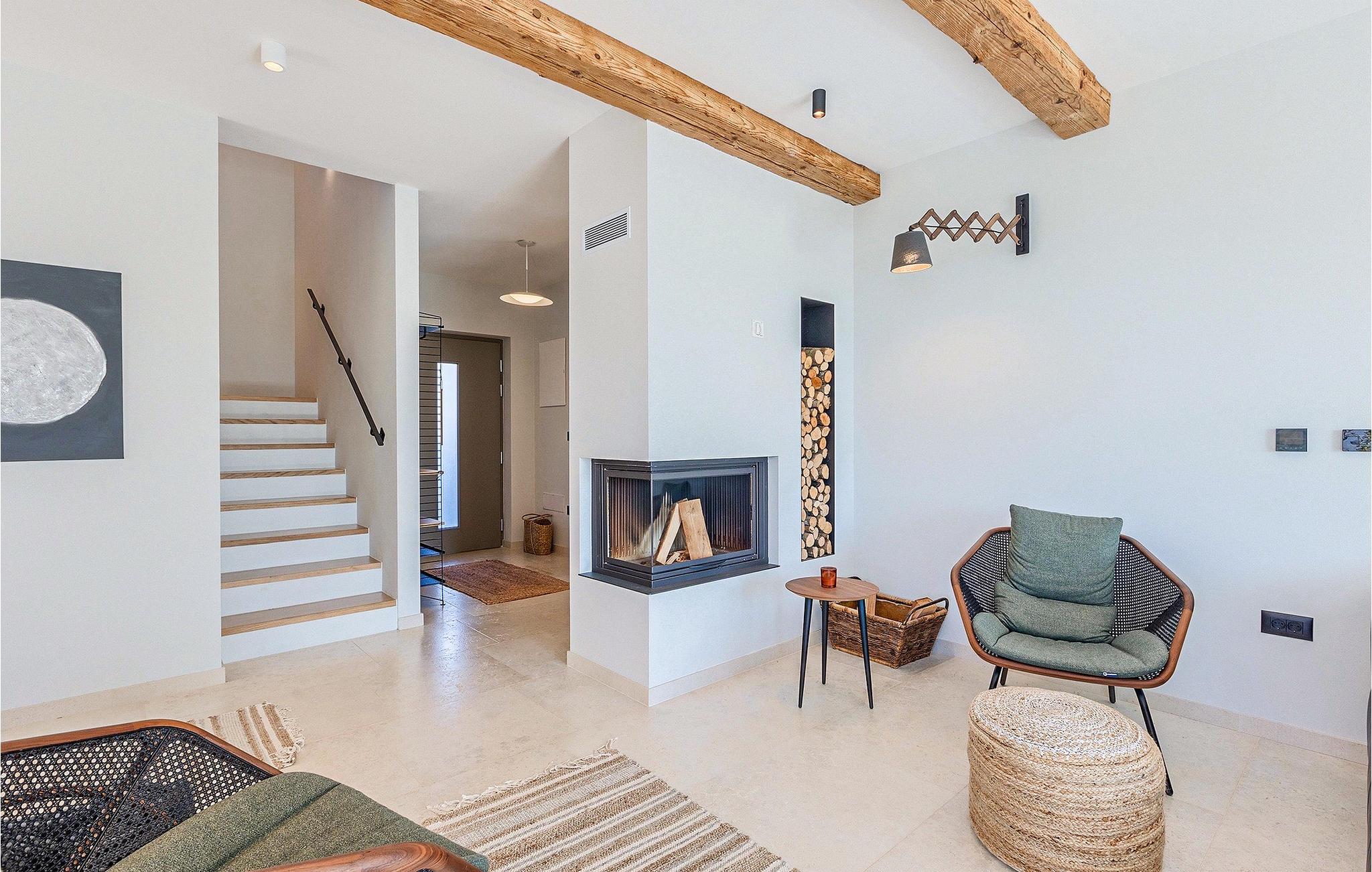 Die Villa ist mit natürlichen Materialien eingerichtet. Mit insgesamt vier schön eingerichteten Schlafzimmern auf zwei Etagen bietet Villa Regina Platz für bis zu acht Personen. Im Erdgeschoss der komplett klimatisierten Villa befinden sich ein Wohnzimmer mit Kamin und gemütlichem Ledersofa, ein moderner Koch- und Essbereich, eine separate Toilette sowie ein Doppelzimmer mit ensuite Badezimmer. Der gemütliche Wohnbereich ist dank der großen Terrassentüren reich an Licht und hat einen herrlichen Meerblick. Dies ist der perfekte Ort für gemeinsame Stunden im Kreise der Familie und Freunde.