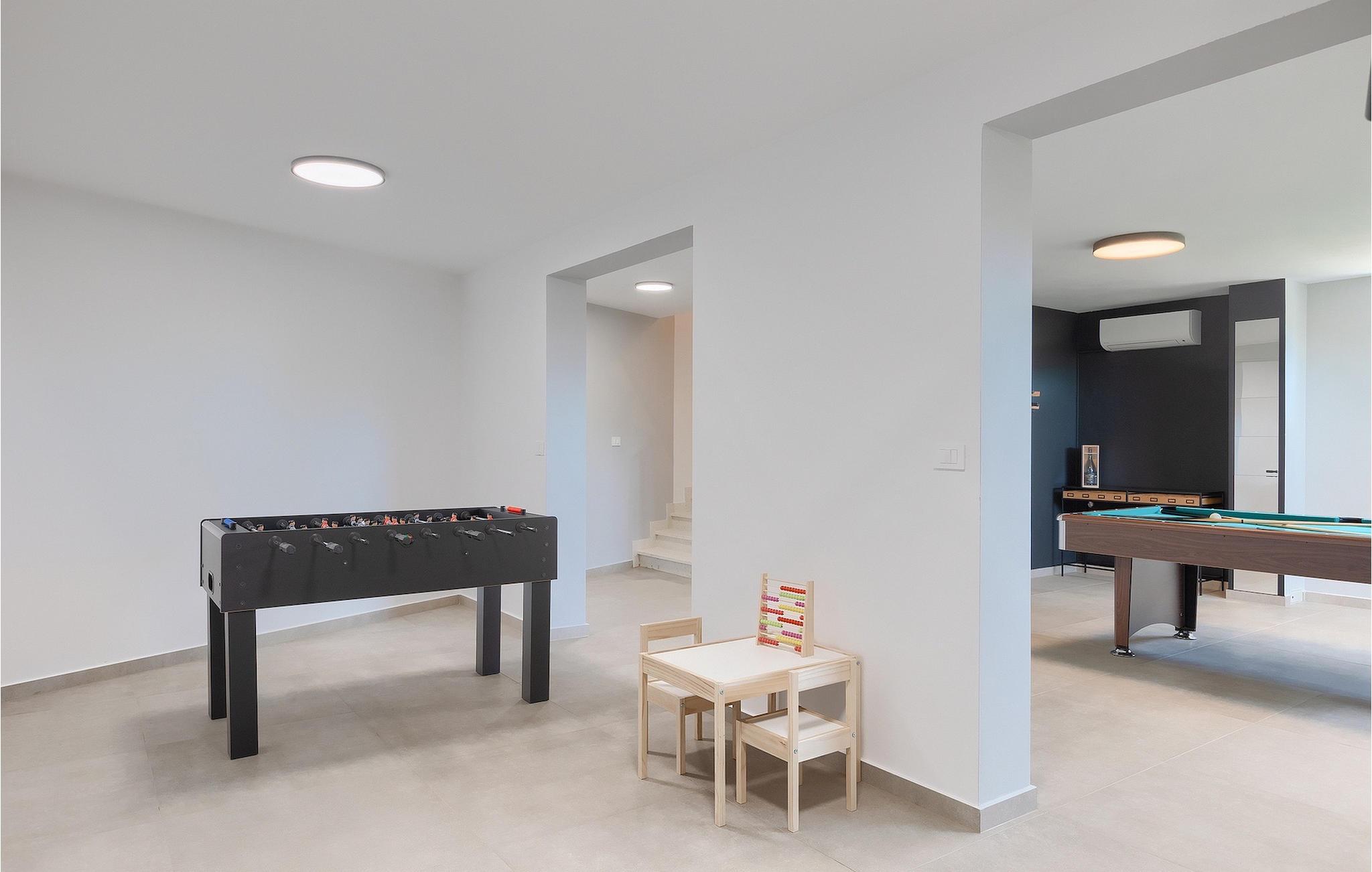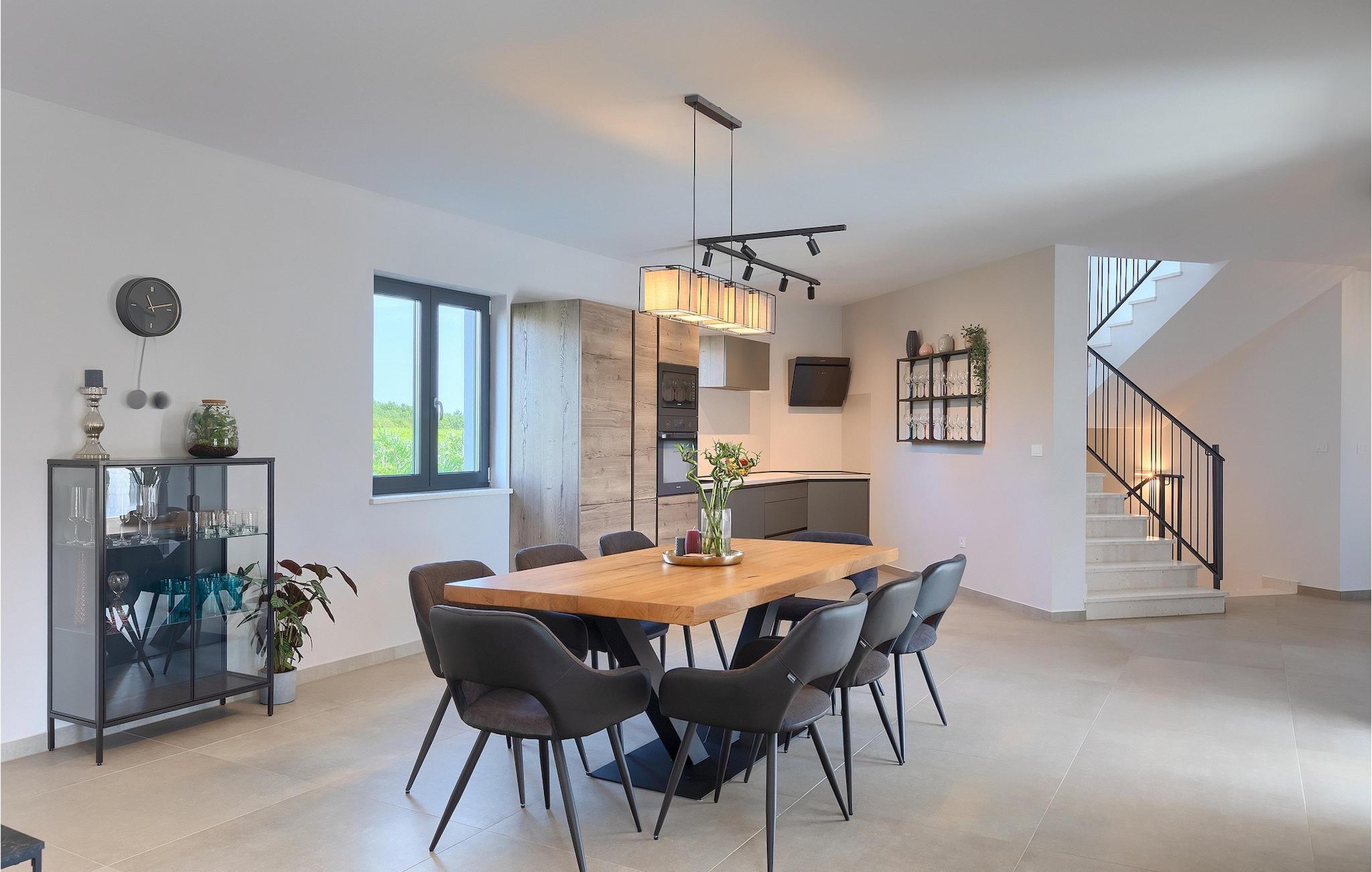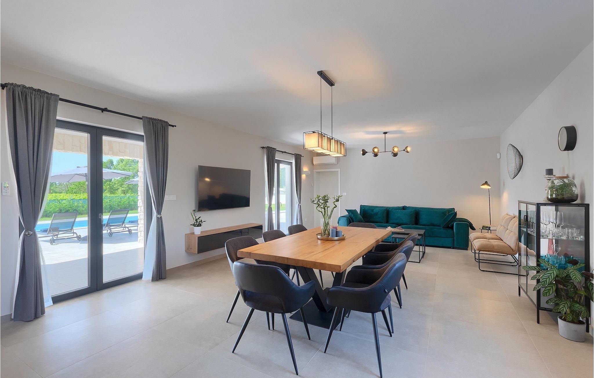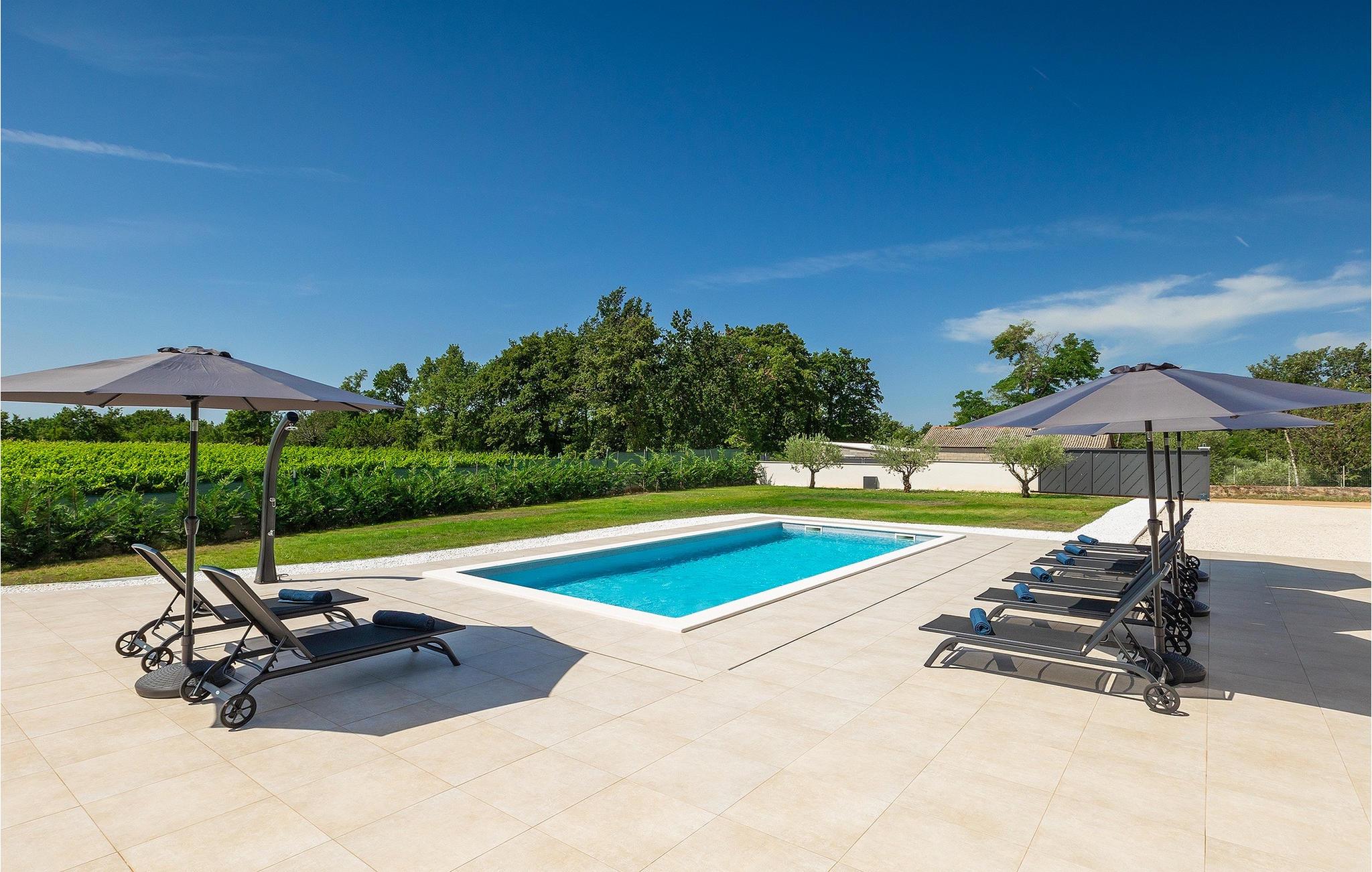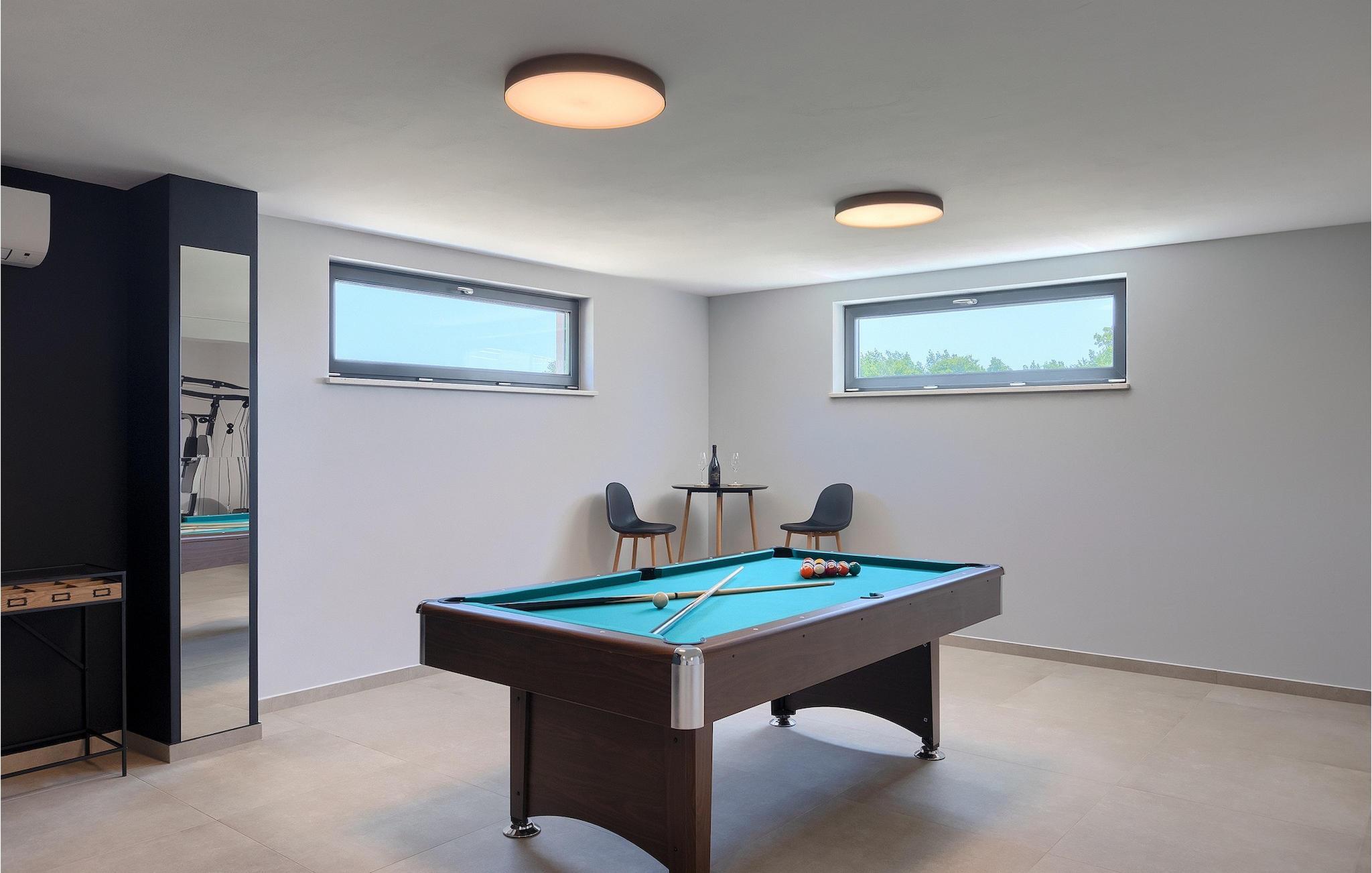 Das Untergeschoss der Villa bietet einen Raum, in dem Sie sich beim Billard oder Tischfußball entspannen können. Für Gäste, die im Urlaub aktiv bleiben möchten, gibt es auch eine Fitnessecke. Neben dem Haus befindet sich eine überdachte Terrasse und im Garten finden Sie auch einen überdachten Bereich mit einem Esstisch, wo Sie köstliche Gerichte genießen können, die auf dem Holzkohlengrill zubereitet werden, der Ihnen zur Verfügung steht. Im Garten der Villa finden Sie einen Pool und Sonnenliegen, wo Sie sich bei einem Buch oder einem erfrischenden Getränk entspannen oder sich beim Badminton vergnügen können. Für unsere kleinen Gäste finden Sie im Garten einen Kinderspielplatz und ein Trampolin. Das Grundstück ist komplett eingezäunt und verfügt über einen privaten Parkplatz für 6 Autos. Buchen Sie Ihre Unterkunft in der Villa Sun Istria und verbringen Sie einen unvergesslichen Urlaub mit Familie und Freunden.Die Villa Sun Istria befindet sich in der Nähe von Višnjan, einer istrischen Stadt, die auf einem Hügel liegt. Die verwinkelten Gassen dieser bezaubernden Stadt zeugen vom reichen historischen Erbe dieses Ortes und bieten gleichzeitig einen spektakulären Blick auf das Meer von der alten Terrasse auf dem Platz, die durch einen venezianischen Bogen betreten wird. Višnjan ist bekannt für seine Sternwarte sowie eine außergewöhnliche traditionelle Gastronomie, die Sie in zahlreichen Restaurants und Agriturismen in der Umgebung genießen können. Es gibt zahlreiche Wander- und Radwege, einer der schönsten von ihnen ist der historische Parenzana-Weg der alten Eisenbahn, der auch eine einzigartige Fahrt mit einem Touristenzug entlang der Route bietet. Die antike römische Stadt Porec, 10 km von der Villa entfernt, bietet mehr Trubel mit himmlischen Stränden, ausgezeichneten Restaurants und Cafés und einem reichen Nachtleben. Sie sollten es auf keinen Fall versäumen, die berühmte Euphrasius-Basilika zu besichtigen, das Markenzeichen von Porec, weshalb die Stadt auch "die Stadt der Mosaike" genannt wird. Besuchen Sie die Baredine-Höhle oder einen der nahe gelegenen Wasserparks und verbringen Sie den besten Urlaub aller Zeiten!