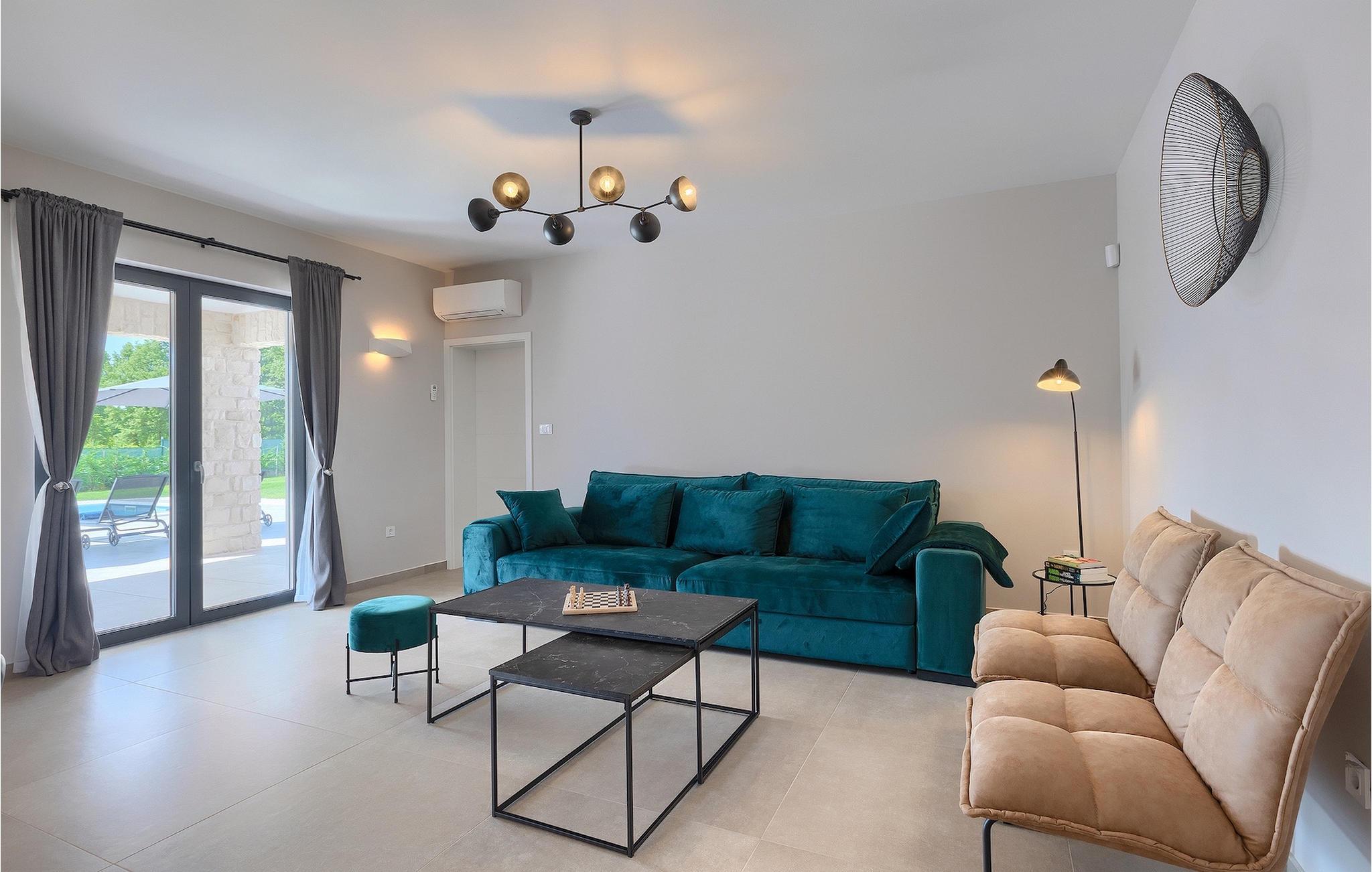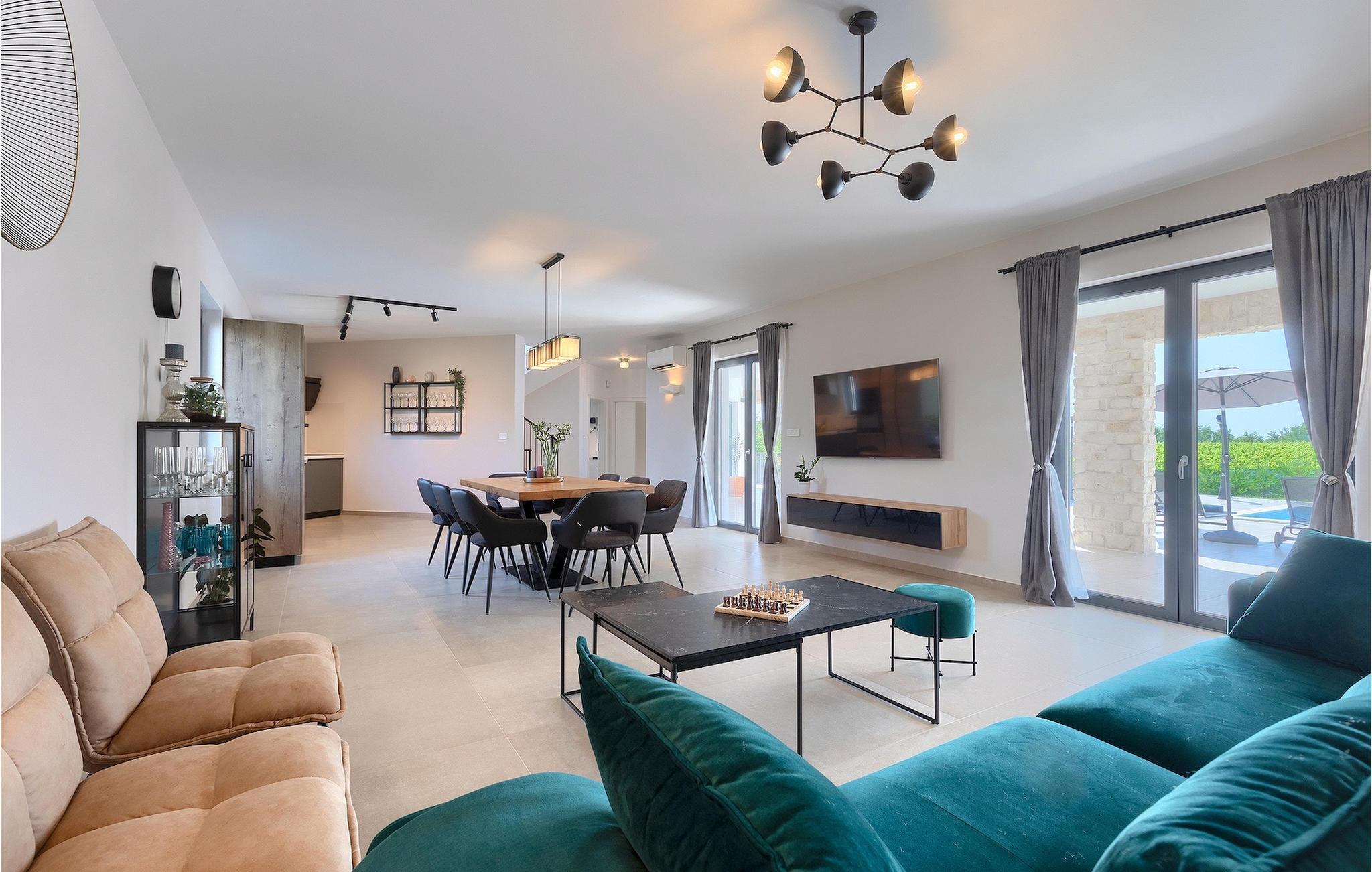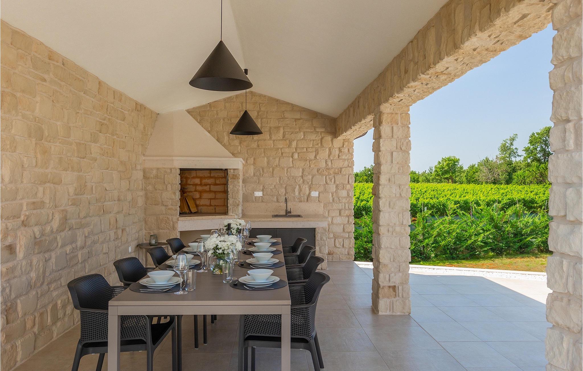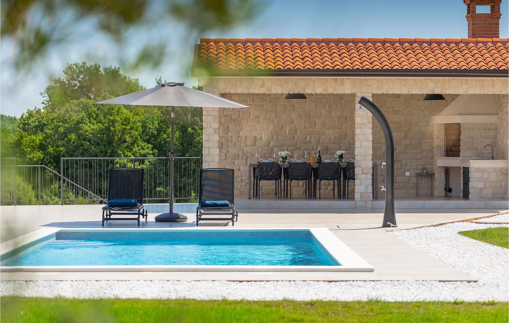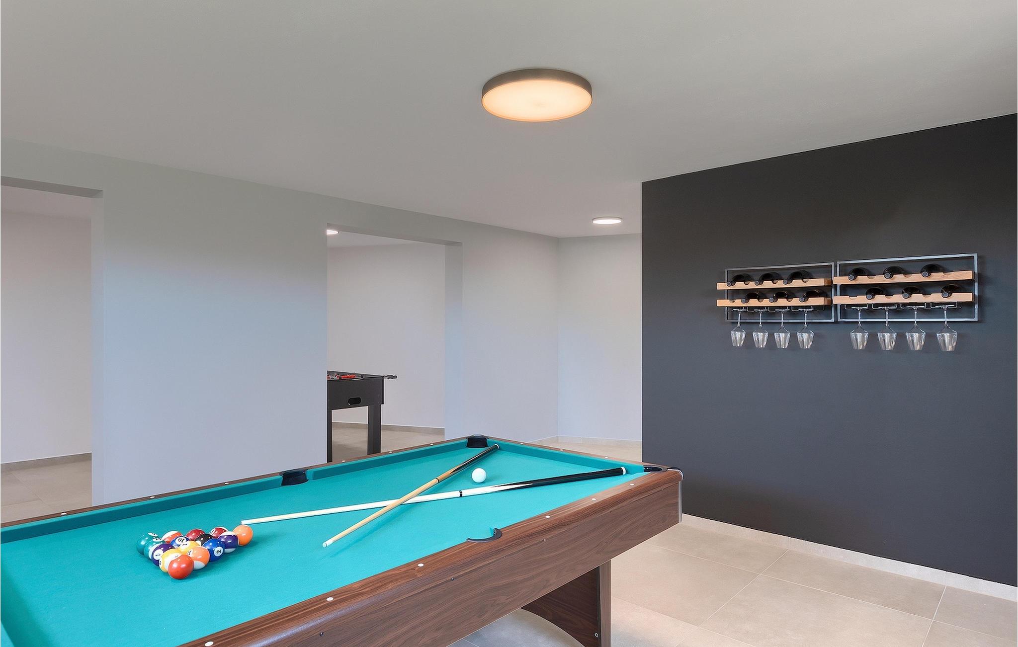 Das Untergeschoss der Villa bietet einen Raum, in dem Sie sich beim Billard oder Tischfußball entspannen können. Für Gäste, die im Urlaub aktiv bleiben möchten, gibt es auch eine Fitnessecke. Neben dem Haus befindet sich eine überdachte Terrasse und im Garten finden Sie auch einen überdachten Bereich mit einem Esstisch, wo Sie köstliche Gerichte genießen können, die auf dem Holzkohlengrill zubereitet werden, der Ihnen zur Verfügung steht. Im Garten der Villa finden Sie einen Pool und Sonnenliegen, wo Sie sich bei einem Buch oder einem erfrischenden Getränk entspannen oder sich beim Badminton vergnügen können. Für unsere kleinen Gäste finden Sie im Garten einen Kinderspielplatz und ein Trampolin. Das Grundstück ist komplett eingezäunt und verfügt über einen privaten Parkplatz für 6 Autos. Buchen Sie Ihre Unterkunft in der Villa Sun Istria und verbringen Sie einen unvergesslichen Urlaub mit Familie und Freunden.Die Villa Sun Istria befindet sich in der Nähe von Višnjan, einer istrischen Stadt, die auf einem Hügel liegt. Die verwinkelten Gassen dieser bezaubernden Stadt zeugen vom reichen historischen Erbe dieses Ortes und bieten gleichzeitig einen spektakulären Blick auf das Meer von der alten Terrasse auf dem Platz, die durch einen venezianischen Bogen betreten wird. Višnjan ist bekannt für seine Sternwarte sowie eine außergewöhnliche traditionelle Gastronomie, die Sie in zahlreichen Restaurants und Agriturismen in der Umgebung genießen können. Es gibt zahlreiche Wander- und Radwege, einer der schönsten von ihnen ist der historische Parenzana-Weg der alten Eisenbahn, der auch eine einzigartige Fahrt mit einem Touristenzug entlang der Route bietet. Die antike römische Stadt Porec, 10 km von der Villa entfernt, bietet mehr Trubel mit himmlischen Stränden, ausgezeichneten Restaurants und Cafés und einem reichen Nachtleben. Sie sollten es auf keinen Fall versäumen, die berühmte Euphrasius-Basilika zu besichtigen, das Markenzeichen von Porec, weshalb die Stadt auch "die Stadt der Mosaike" genannt wird. Besuchen Sie die Baredine-Höhle oder einen der nahe gelegenen Wasserparks und verbringen Sie den besten Urlaub aller Zeiten!