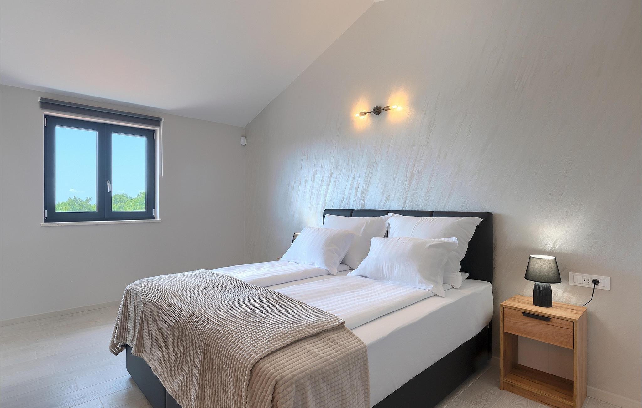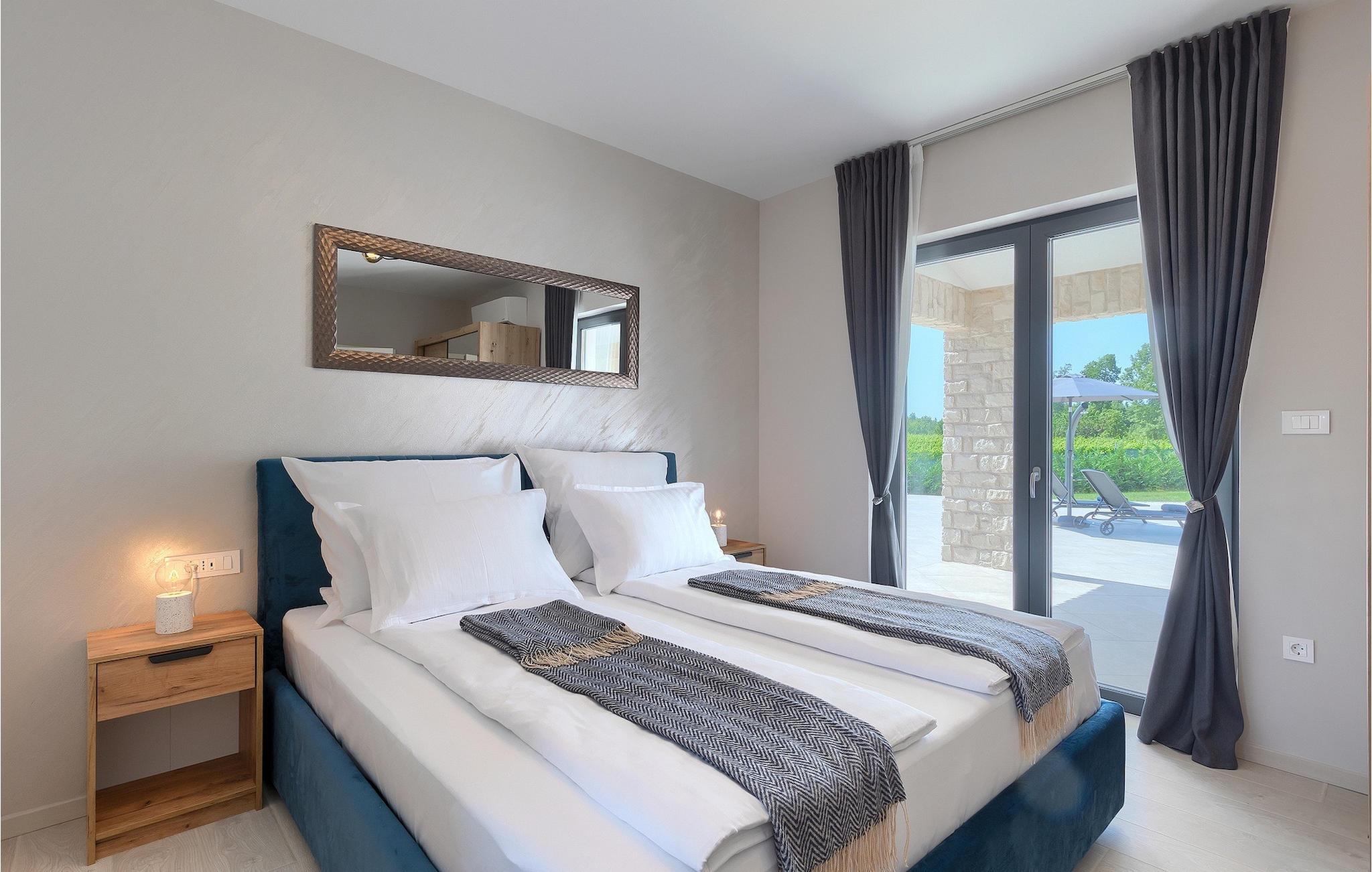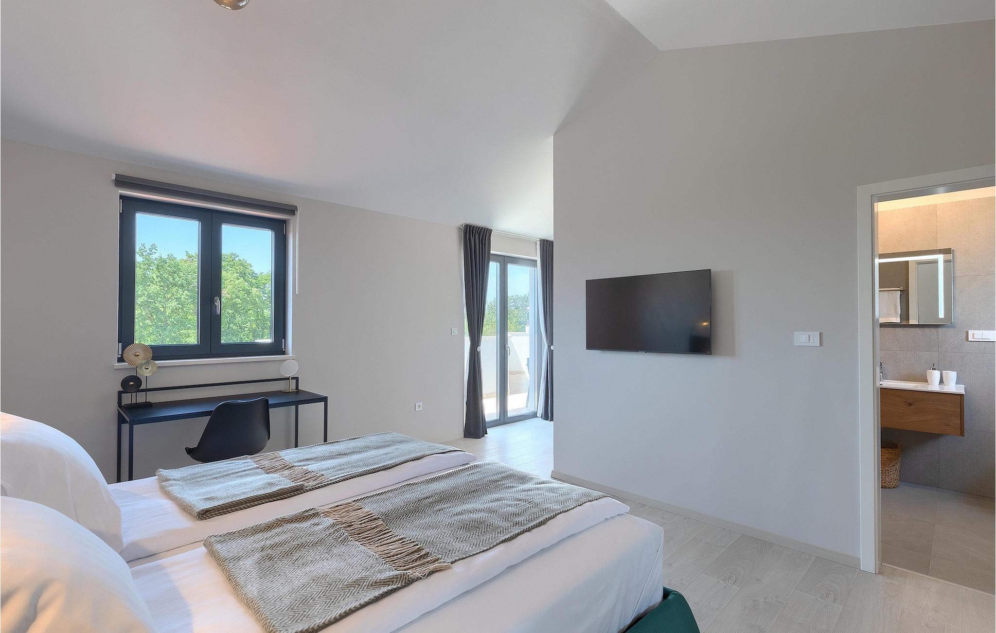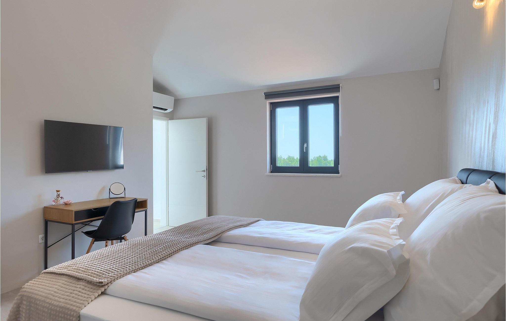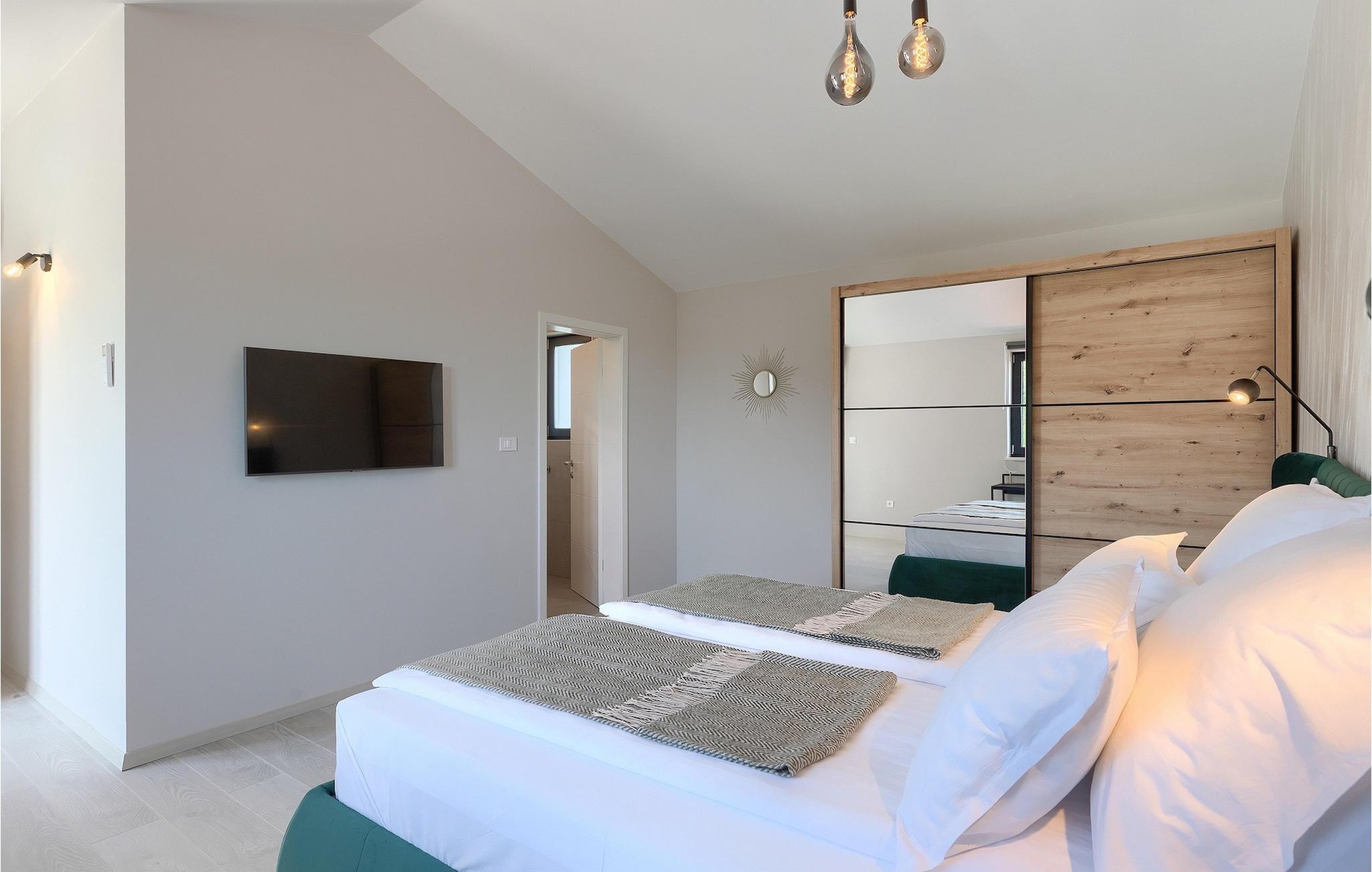 Wenn Sie eine Villa für einen erholsamen Urlaub suchen, ist die Villa Sun Istria die ideale Wahl für Sie. Die charmante Villa bietet vier Schlafzimmer für bis zu acht Personen. Drei Schlafzimmer befinden sich im ersten Stock. Die Schlafzimmer sind hell und komfortabel. Jedes Zimmer bietet ein Doppelbett, einen Fernseher und eine Klimaanlage. Ein Schlafzimmer hat ein eigenes Bad und Zugang zum Balkon. Die anderen zwei Zimmer nutzen ein weiteres Bad, dass sich auf der selben Etage befindet. Das vierte Schlafzimmer befindet sich im Erdgeschoss und verfügt über ein eigenes Bad, ein Doppelbett, einen Fernseher sowie eine Klimaanlage. Im Erdgeschoss der Villa finden Sie ein Wohnzimmer mit Sofa und Fernseher, das mit dem Esszimmer und einer voll ausgestatteten Küche verbunden ist. Der ganze Bereich ist klimatisiert.