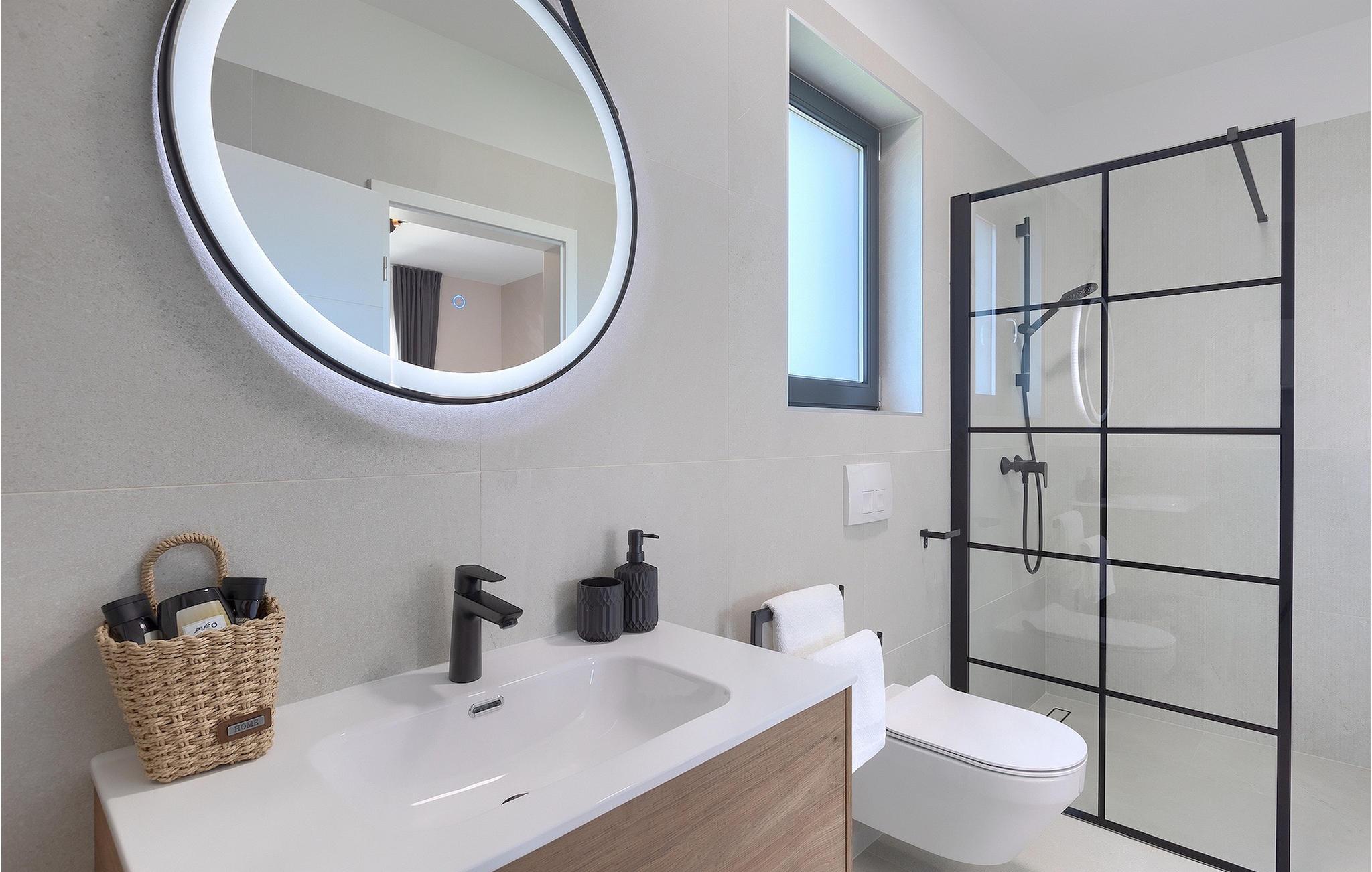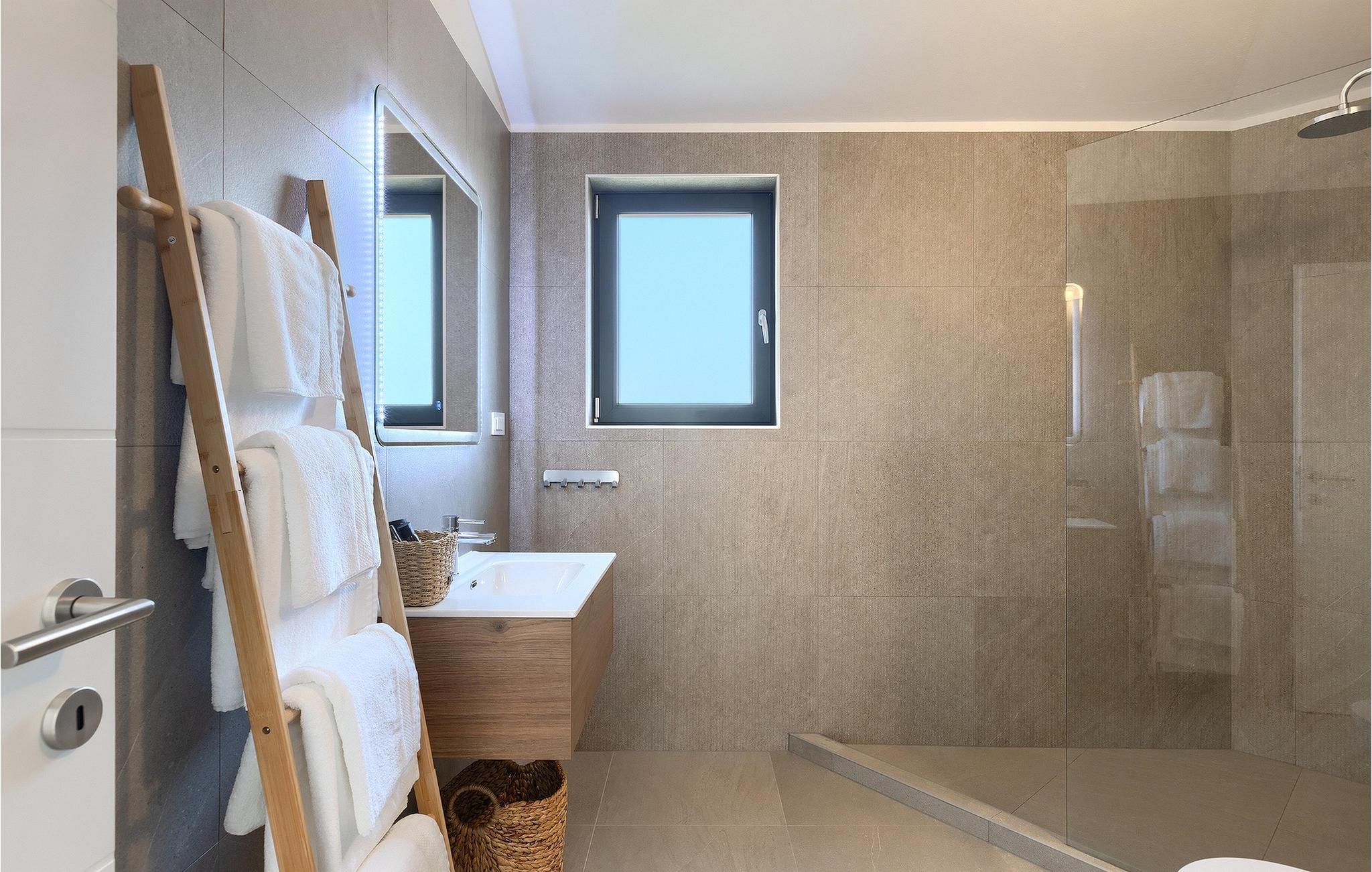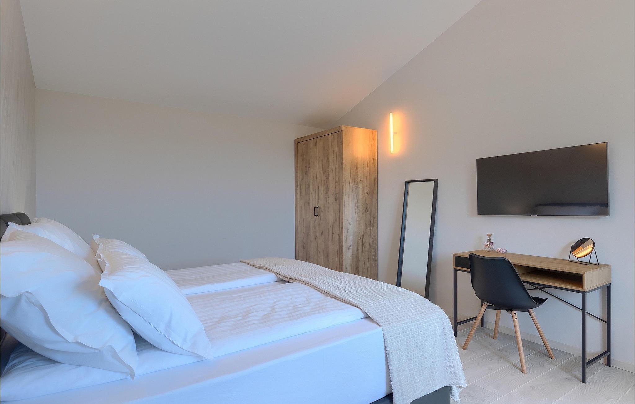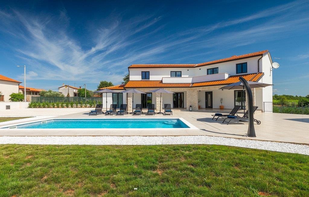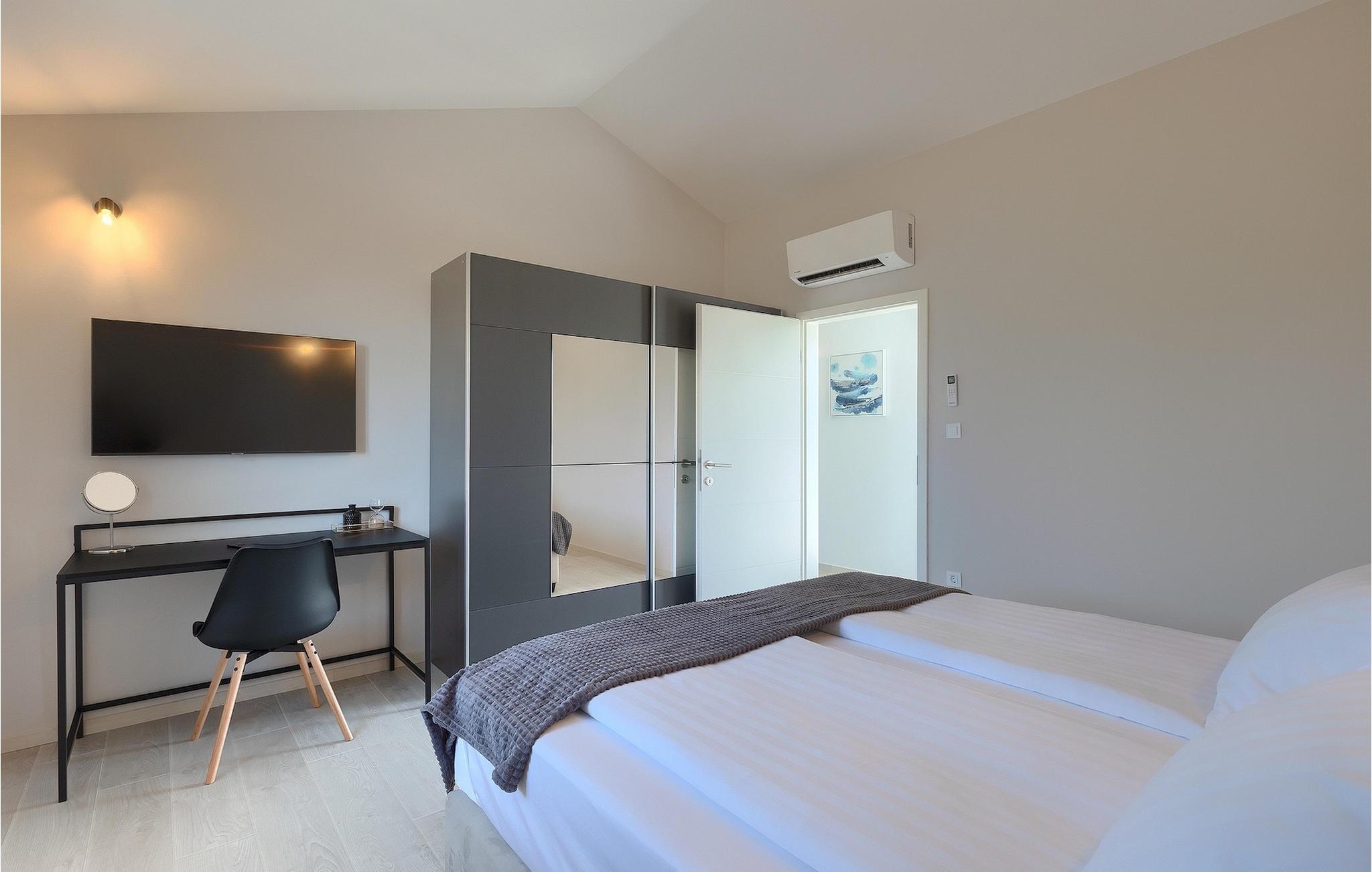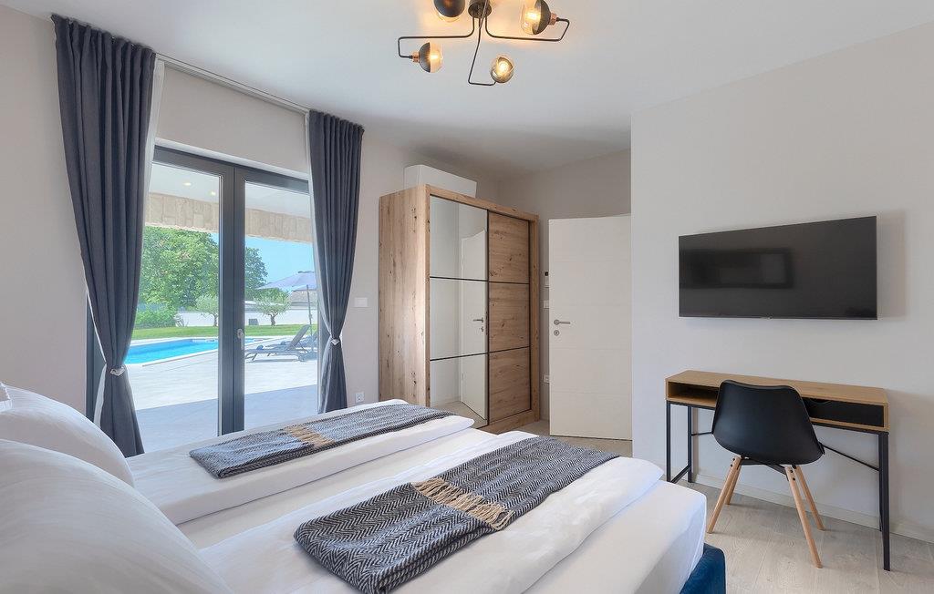 Wenn Sie eine Villa für einen erholsamen Urlaub suchen, ist die Villa Sun Istria die ideale Wahl für Sie. Die charmante Villa bietet vier Schlafzimmer für bis zu acht Personen. Drei Schlafzimmer befinden sich im ersten Stock. Die Schlafzimmer sind hell und komfortabel. Jedes Zimmer bietet ein Doppelbett, einen Fernseher und eine Klimaanlage. Ein Schlafzimmer hat ein eigenes Bad und Zugang zum Balkon. Die anderen zwei Zimmer nutzen ein weiteres Bad, dass sich auf der selben Etage befindet. Das vierte Schlafzimmer befindet sich im Erdgeschoss und verfügt über ein eigenes Bad, ein Doppelbett, einen Fernseher sowie eine Klimaanlage. Im Erdgeschoss der Villa finden Sie ein Wohnzimmer mit Sofa und Fernseher, das mit dem Esszimmer und einer voll ausgestatteten Küche verbunden ist. Der ganze Bereich ist klimatisiert.
