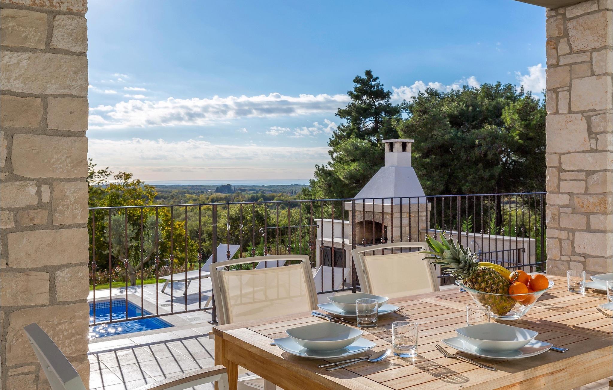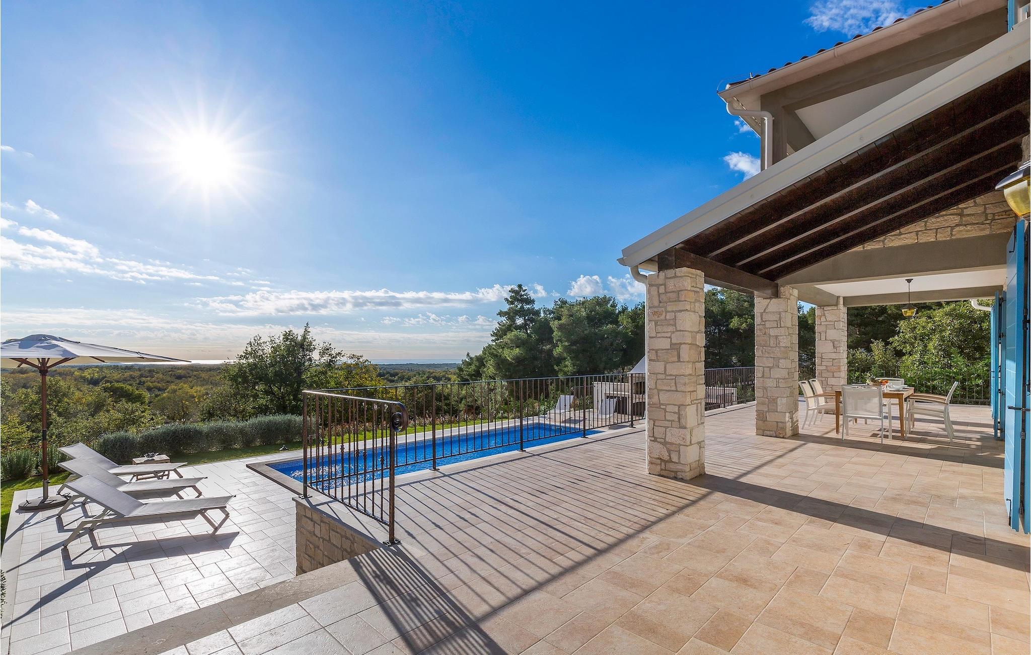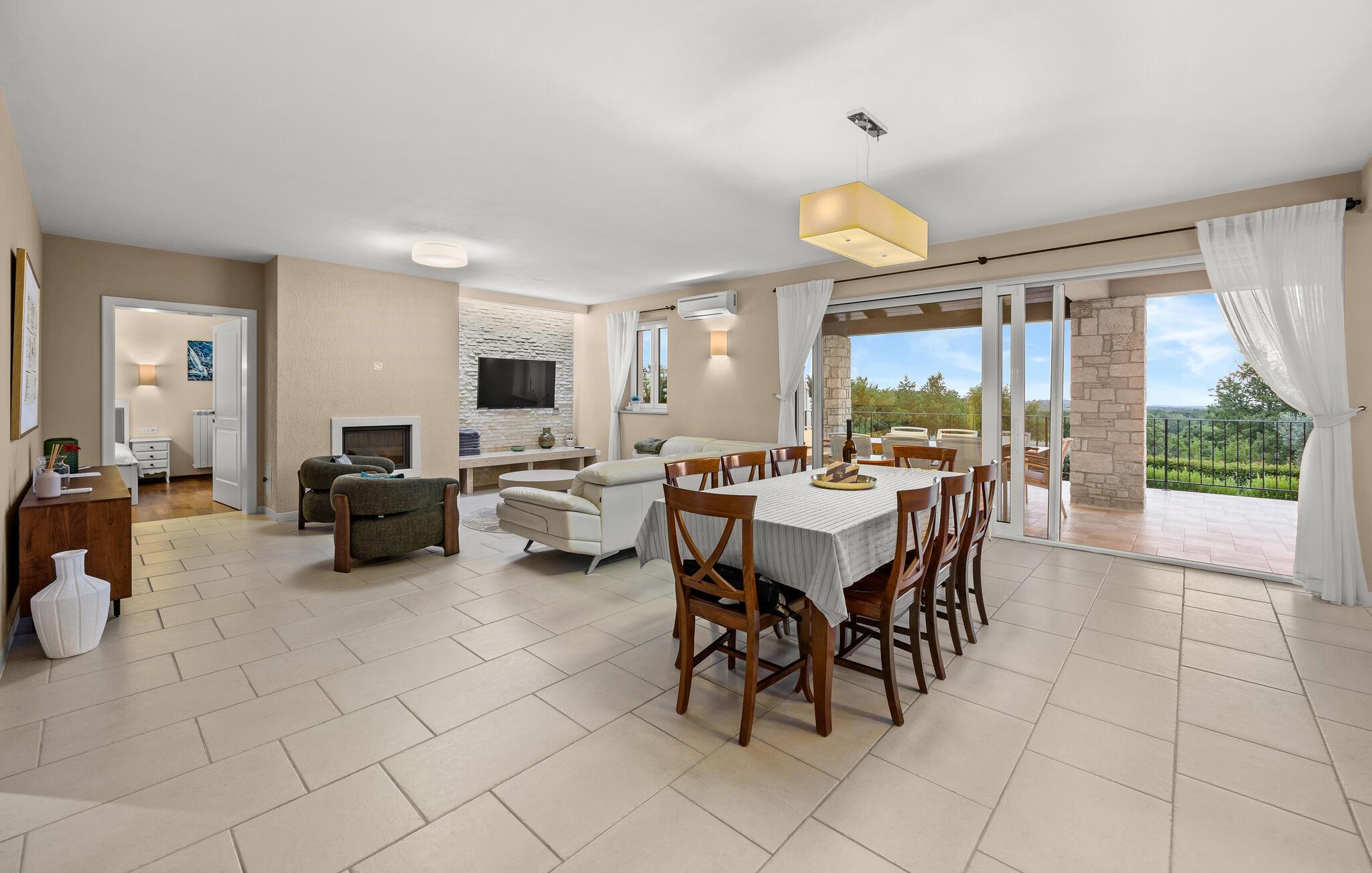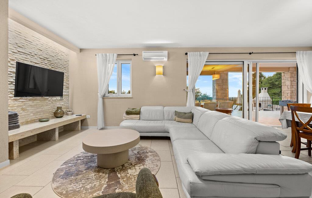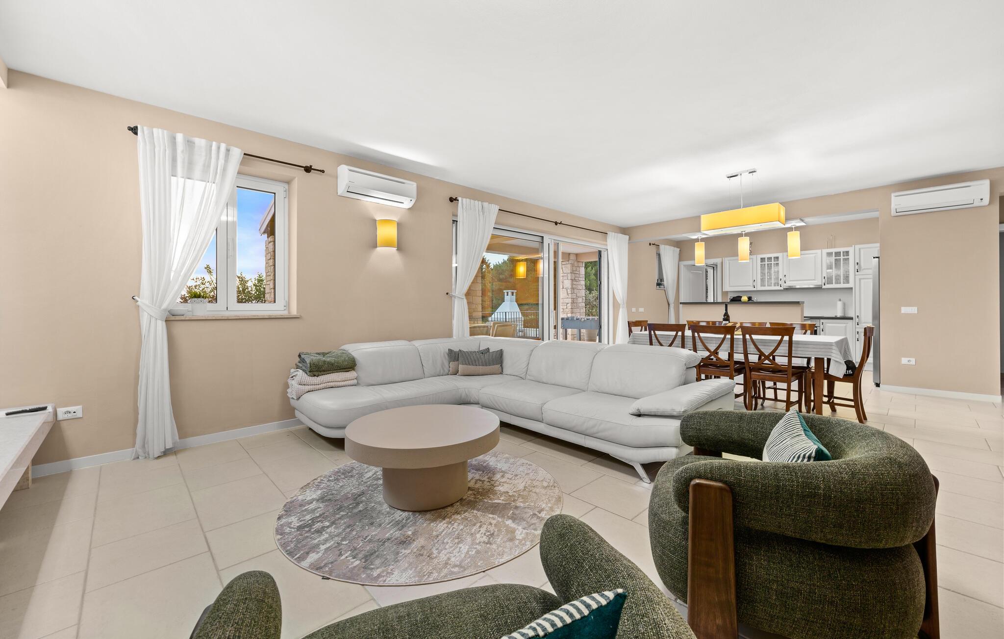 Machen Sie eine Pause von Ihrem stressigen Alltag in dieser charmanten, rustikalen Villa für 8 Personen mit Blick auf die Hügel und das Meer. Beginnen Sie Ihren wohlverdienten Urlaub mit einem Sprung in den privaten Pool oder lesen Sie ein Buch auf den Liegestühlen unter dem Sonnenschirm. Die geräumige überdachte Terrasse ist der perfekte Ort, um die auf dem Außengrill oder in der voll ausgestatteten Küche zubereiteten Mahlzeiten zu genießen. Im Erdgeschoss bilden Küche, Esszimmer und Wohnzimmer einen großzügigen Raum mit offenem Grundriss, der durch Glastüren direkt mit der Terrasse verbunden ist. Eine besondere Ergänzung des Wohnzimmers ist der Kamin, der in den Winter- oder Sommermonaten für eine besondere Atmosphäre sorgt. Diese besondere Villa ist trotz ihres rustikalen Äußeren mit allen Annehmlichkeiten ausgestattet, die für ein modernes Leben notwendig sind - sie ist voll klimatisiert und verfügt über Fußbodenheizung im ganzen Haus. Für zusätzlichen Komfort, insbesondere für Familien mit Kindern, gibt es im Erdgeschoss außerdem ein geräumiges Schlafzimmer mit eigenem Bad und ein zusätzliches separates WC.