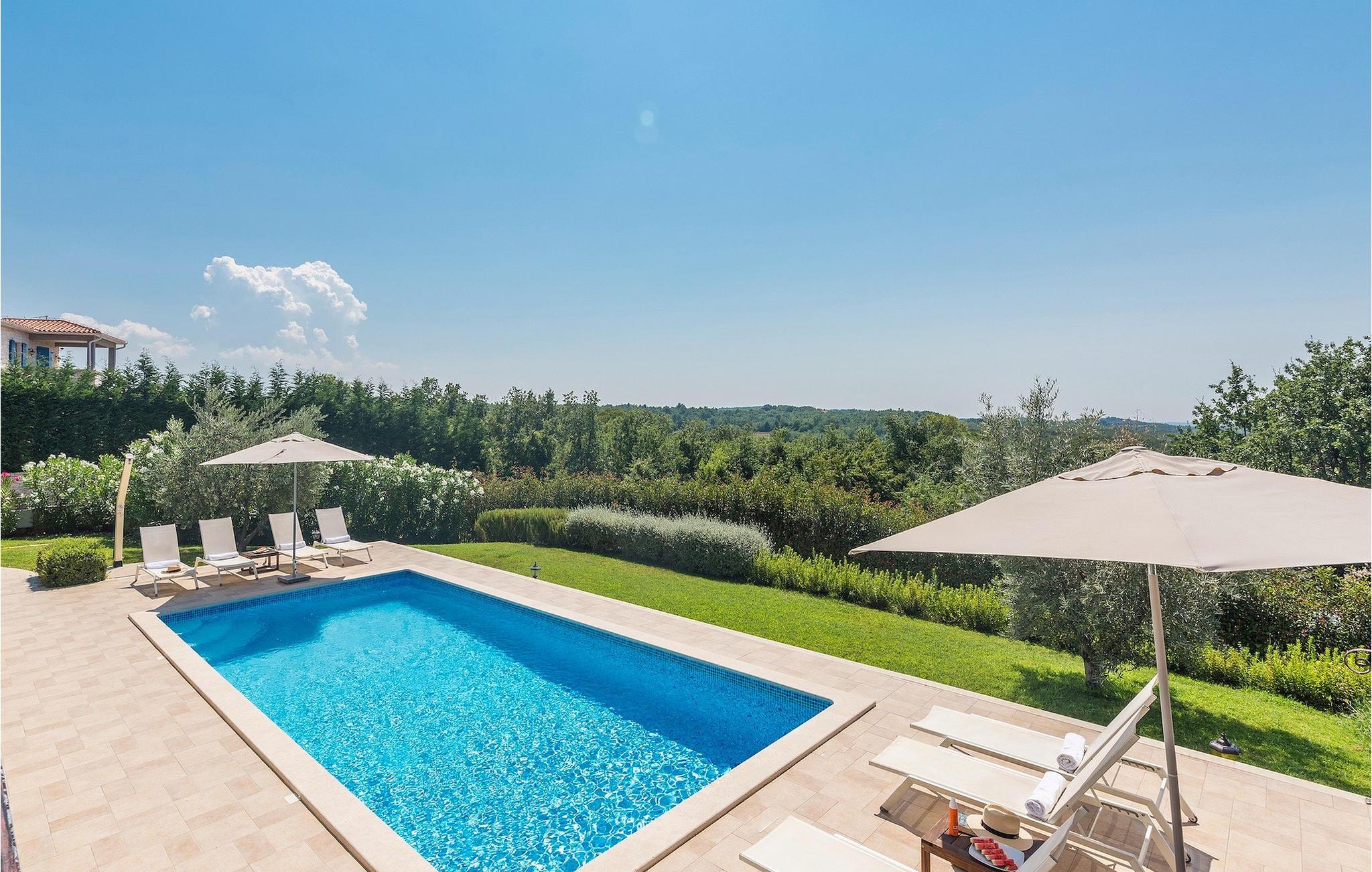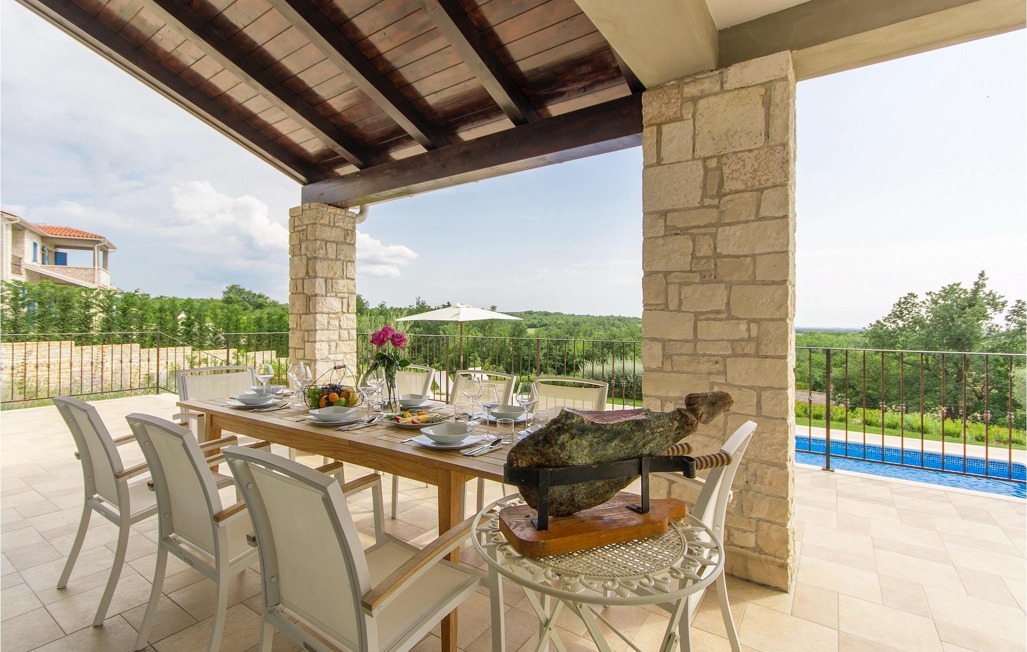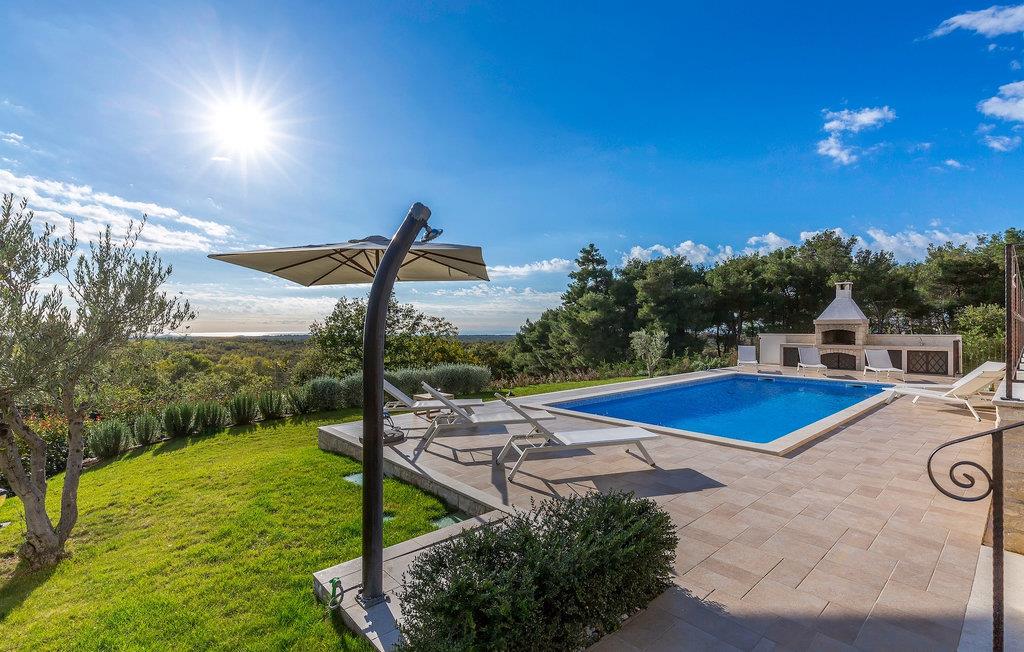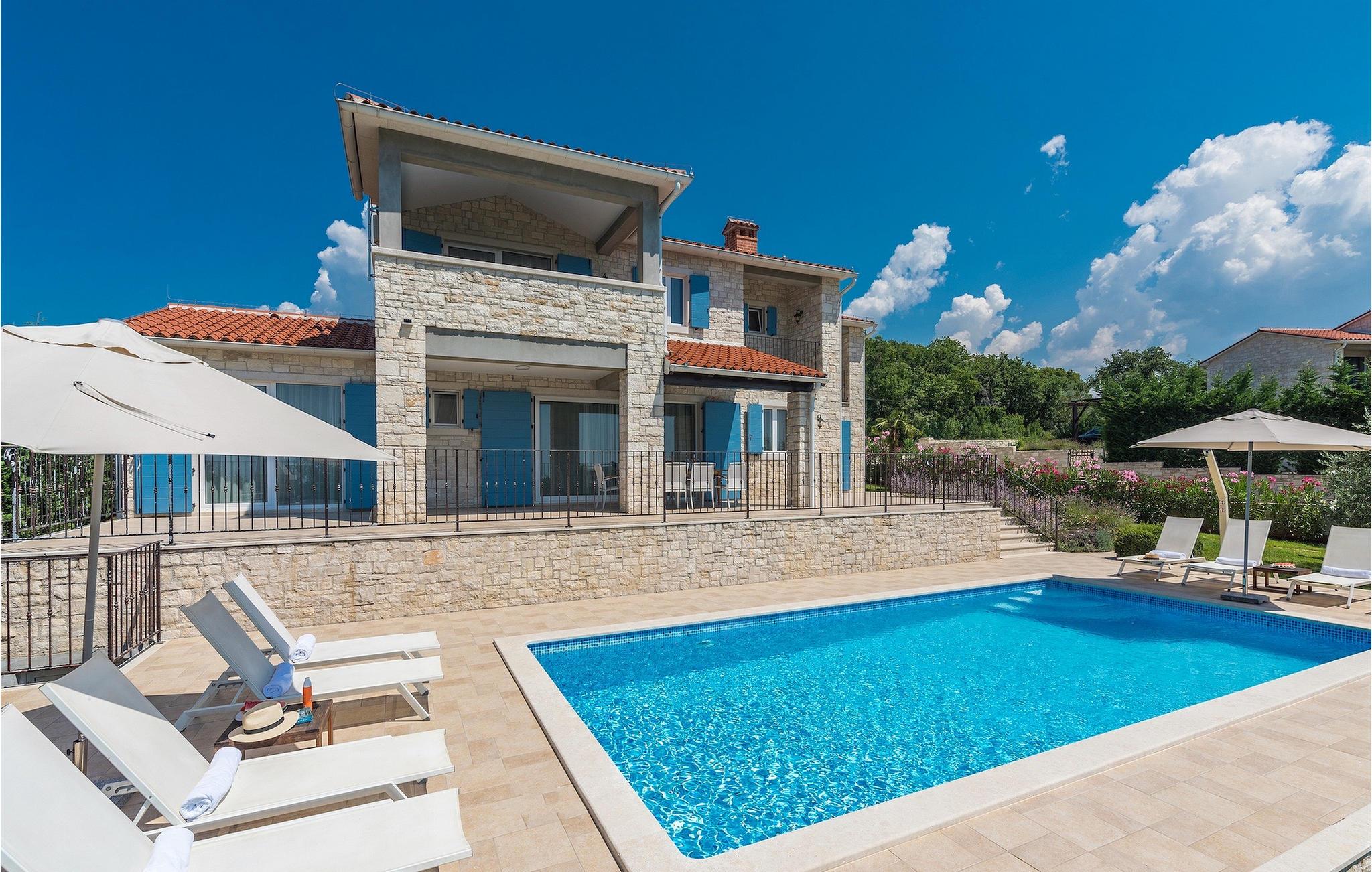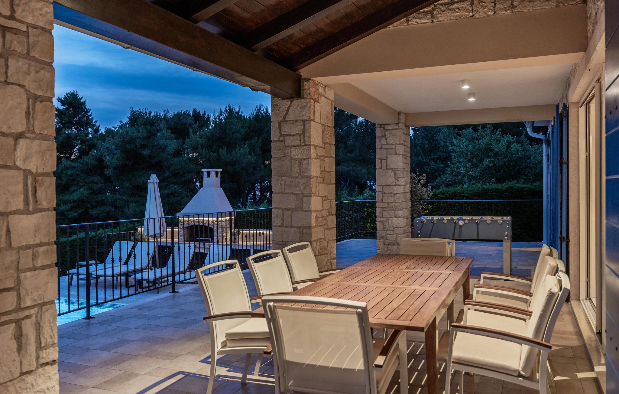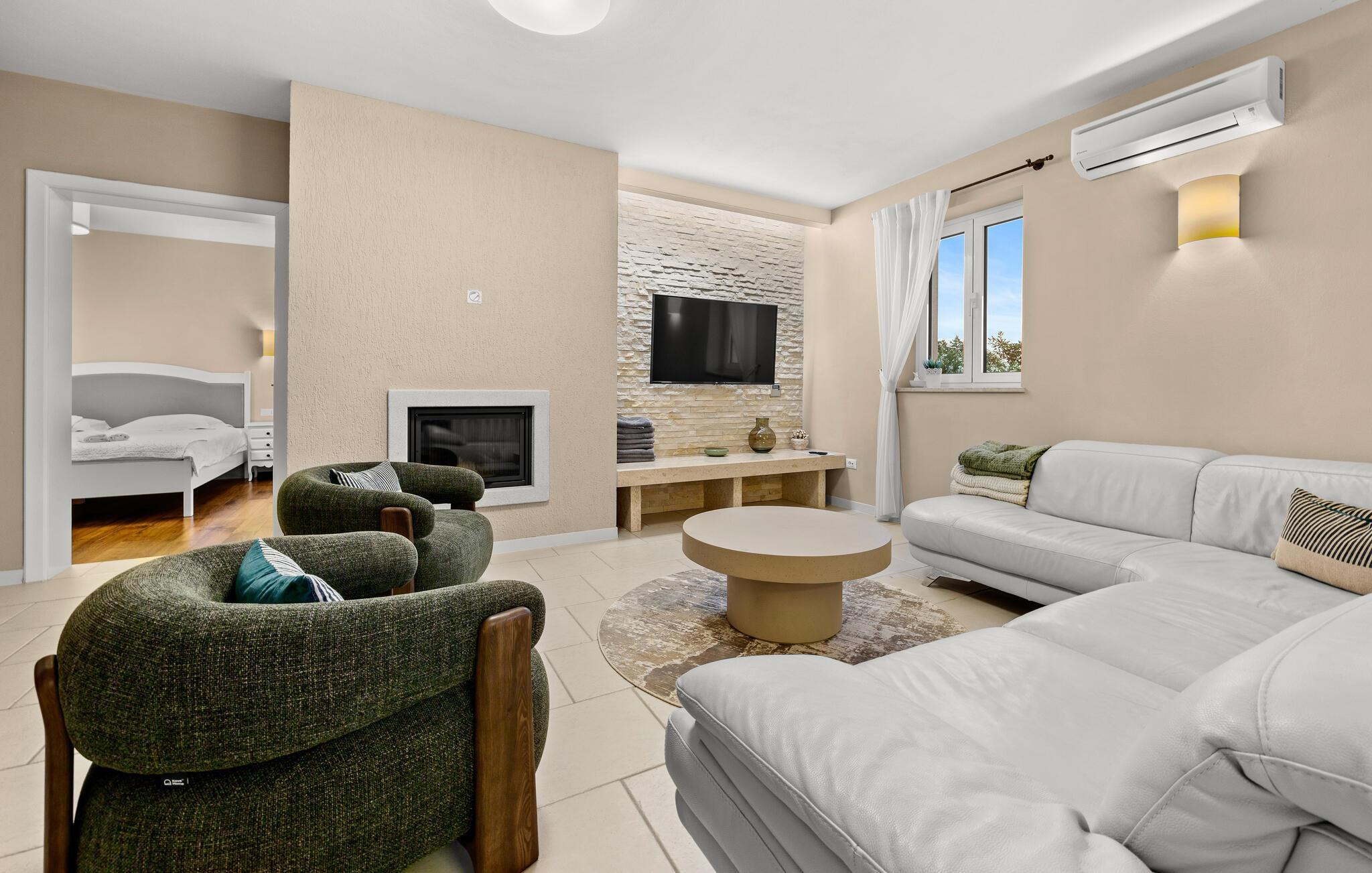 Machen Sie eine Pause von Ihrem stressigen Alltag in dieser charmanten, rustikalen Villa für 8 Personen mit Blick auf die Hügel und das Meer. Beginnen Sie Ihren wohlverdienten Urlaub mit einem Sprung in den privaten Pool oder lesen Sie ein Buch auf den Liegestühlen unter dem Sonnenschirm. Die geräumige überdachte Terrasse ist der perfekte Ort, um die auf dem Außengrill oder in der voll ausgestatteten Küche zubereiteten Mahlzeiten zu genießen. Im Erdgeschoss bilden Küche, Esszimmer und Wohnzimmer einen großzügigen Raum mit offenem Grundriss, der durch Glastüren direkt mit der Terrasse verbunden ist. Eine besondere Ergänzung des Wohnzimmers ist der Kamin, der in den Winter- oder Sommermonaten für eine besondere Atmosphäre sorgt. Diese besondere Villa ist trotz ihres rustikalen Äußeren mit allen Annehmlichkeiten ausgestattet, die für ein modernes Leben notwendig sind - sie ist voll klimatisiert und verfügt über Fußbodenheizung im ganzen Haus. Für zusätzlichen Komfort, insbesondere für Familien mit Kindern, gibt es im Erdgeschoss außerdem ein geräumiges Schlafzimmer mit eigenem Bad und ein zusätzliches separates WC.