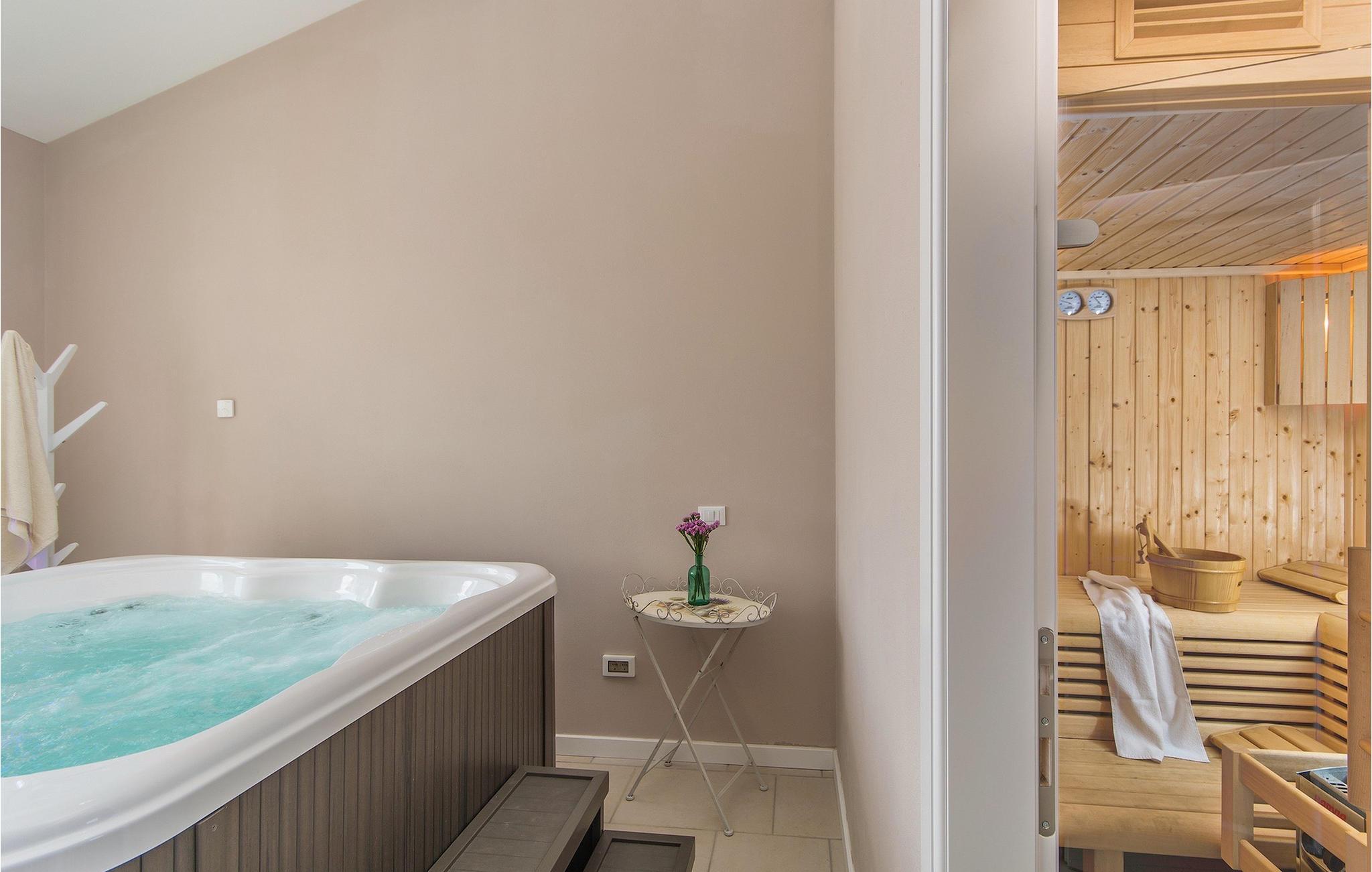 Die wohltuende Atmosphäre des Äußeren dieses Hauses erstreckt sich bis ins Innere, wo Sie im Erdgeschoss Ihre kleine private Wellness-Oase mit Sauna und Whirlpool erwartet. Entspannen Sie sich vollkommen und lassen Sie den Alltag hinter sich im Whirlpool mit Blick ins Grüne.