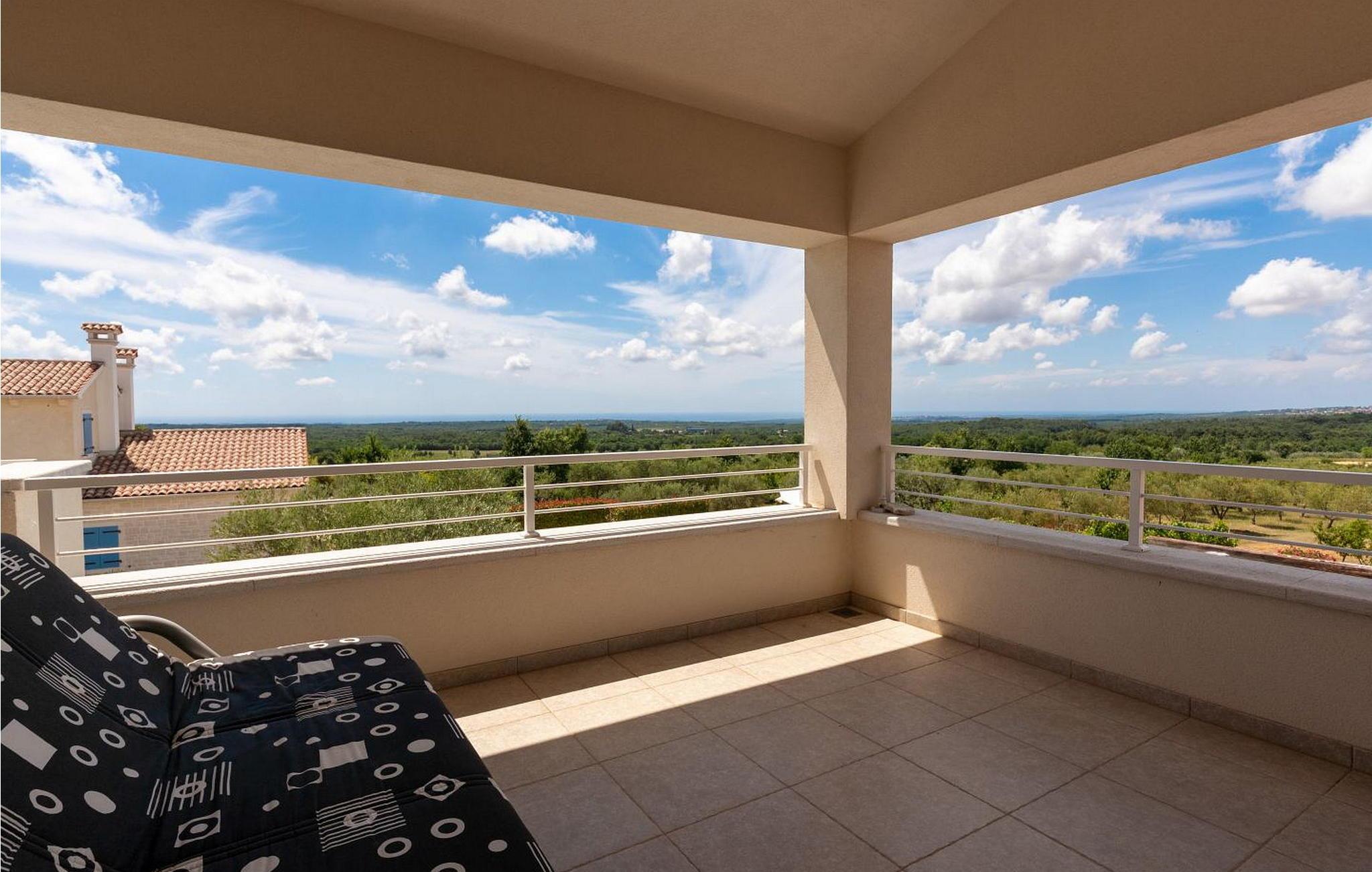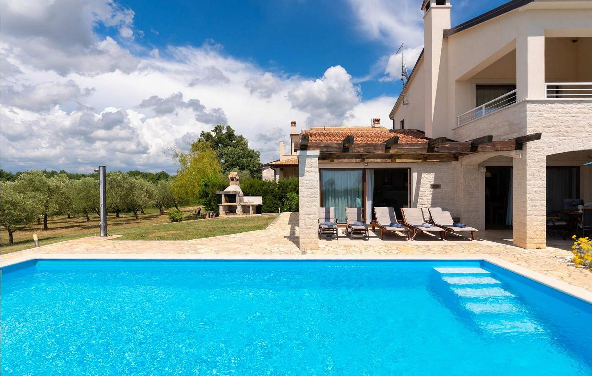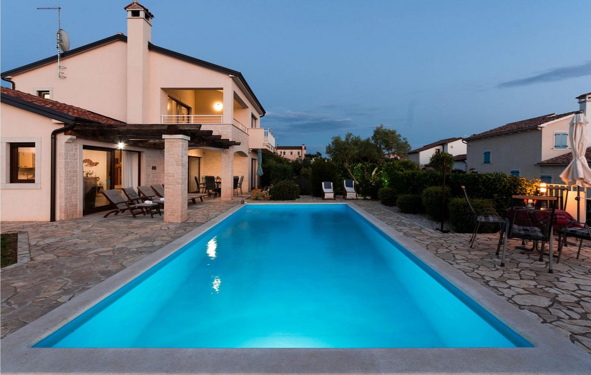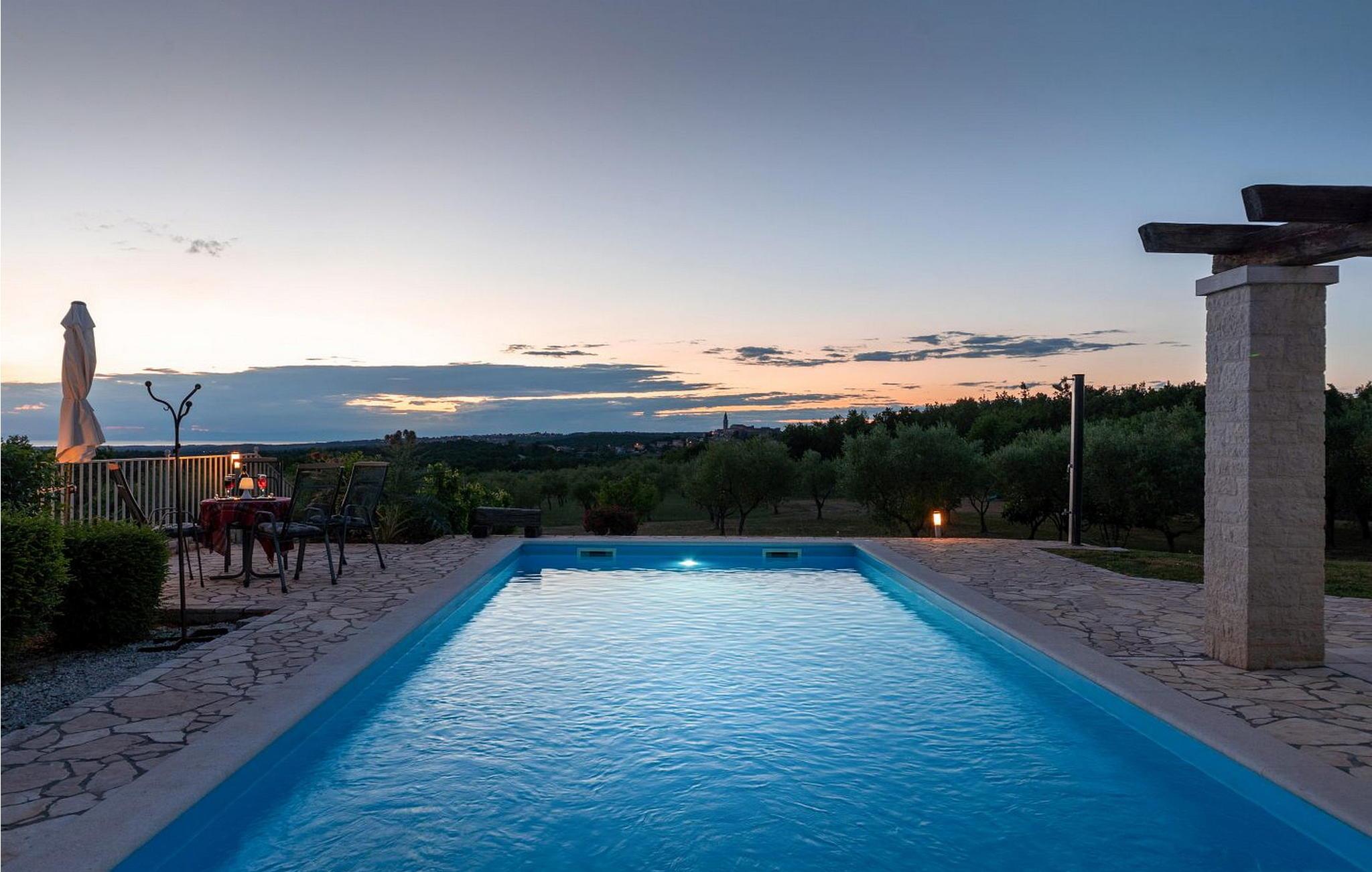 Die Villa wurde im Jahr 2015 gebaut und verfügt über ein eigenes Gelände mit gepflegter Wiese und Olivenhain von einer Fläche von ca. 2000 qm, am ruhigen Platz gelegen von wo aus sich ein wunderschöner Panoramablick aufs Meer erstreckt der durch die Glaswände in allen Räumen noch mehr betont ist. Das Dorf Barat befindet sich 3 km von Visnjan, einer malerischen Stadt, wo wir verschiedene Einrichtungen wie Geschäfte, Bäckereien, Restaurants/Pizzerien, Geldautomat und anderes finden. Den Gästen der Villa Nira stehen folgende Außenaustastungen zur Verfügung: privat Parkplatz für drei Autos, Pool von 36 qm mit Liegestühlen, eine überdachte Terrasse mit Gartenmöbel und Grill.