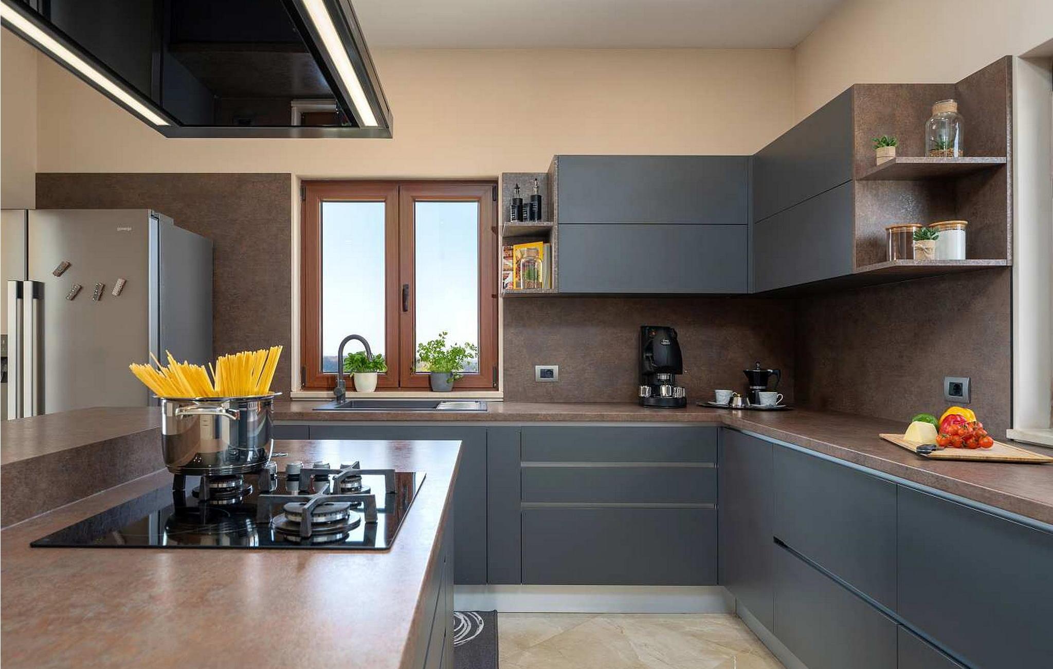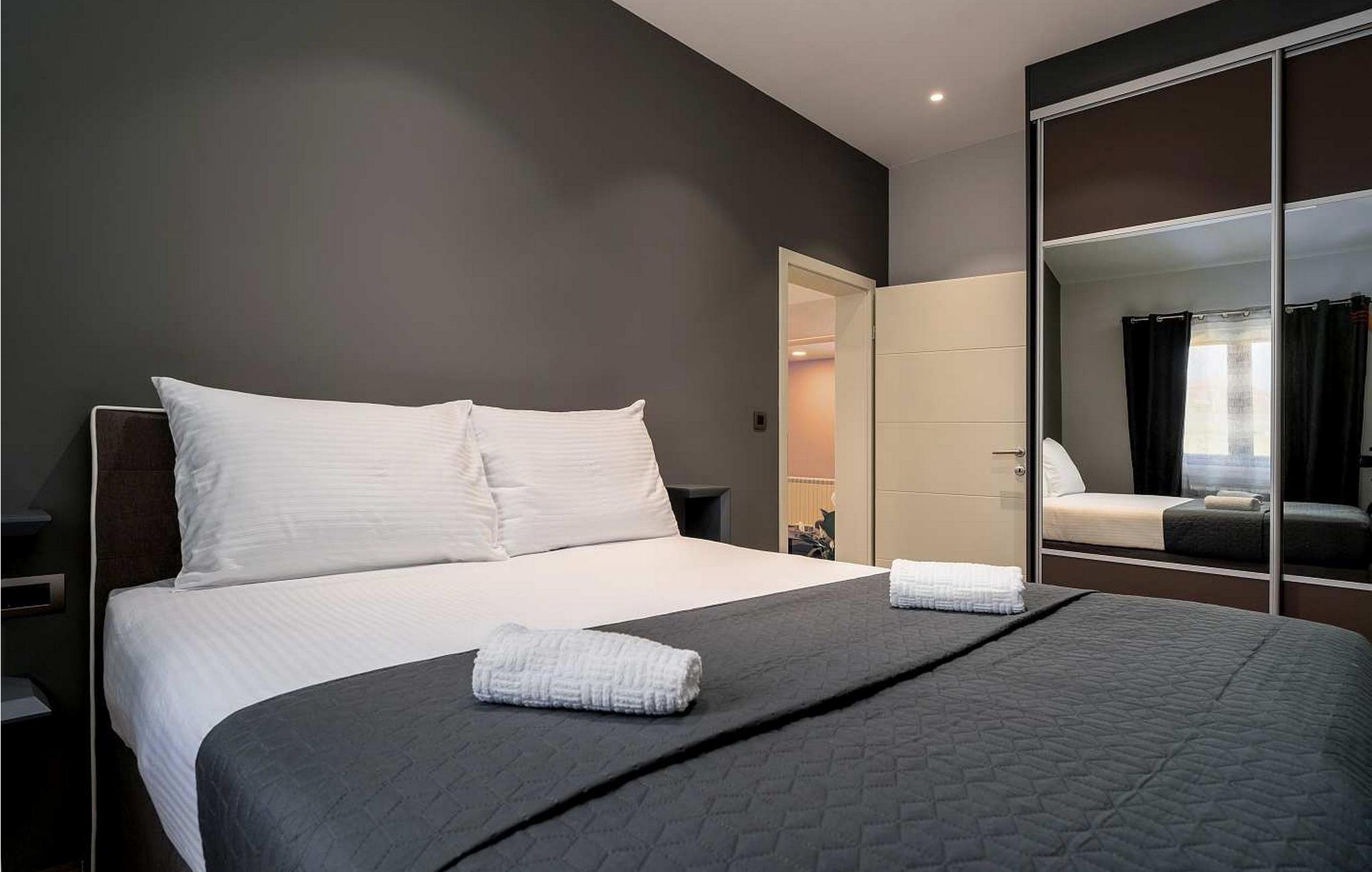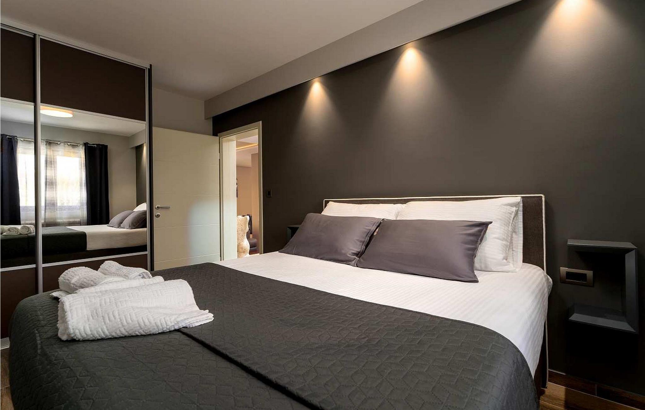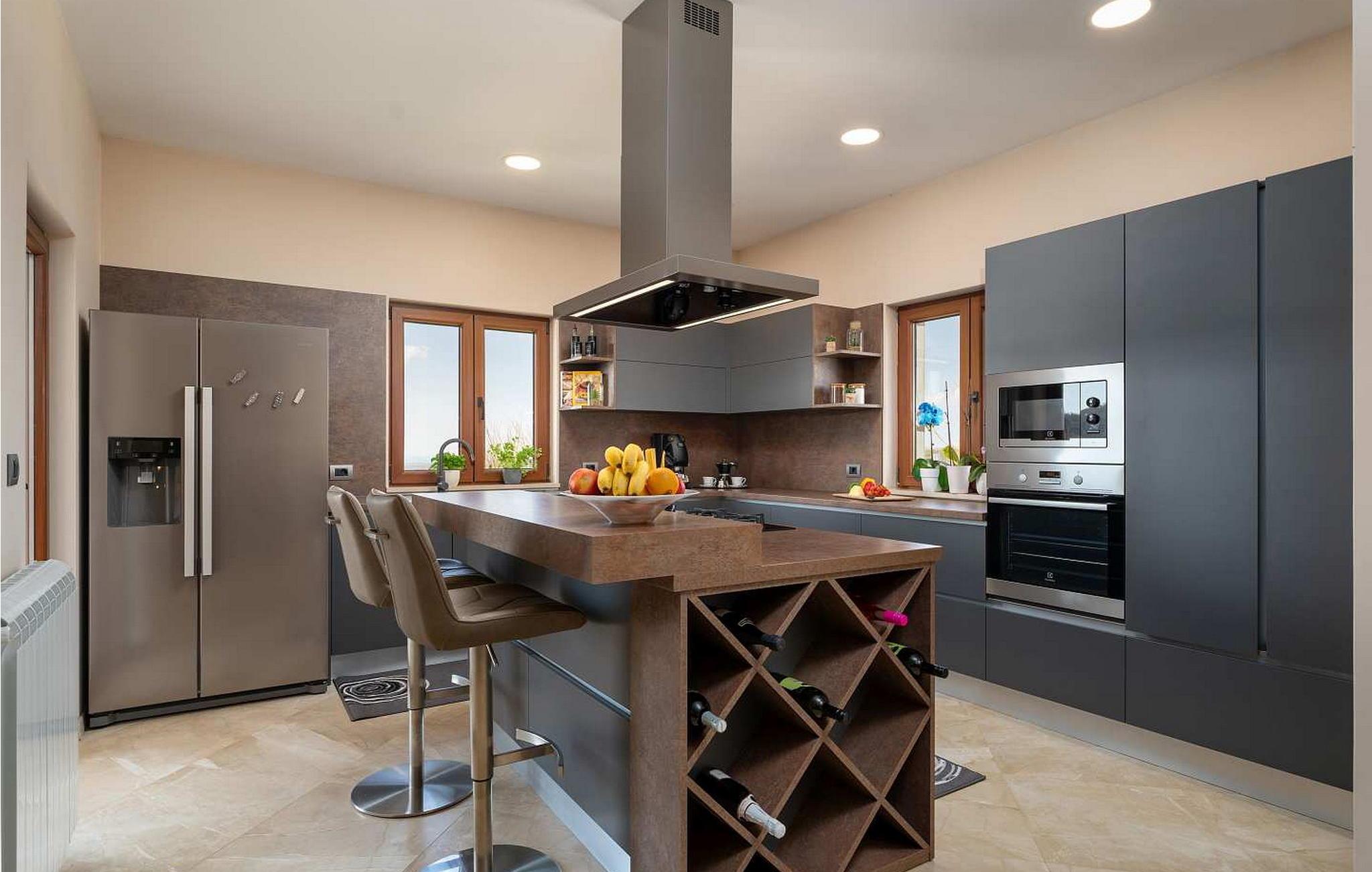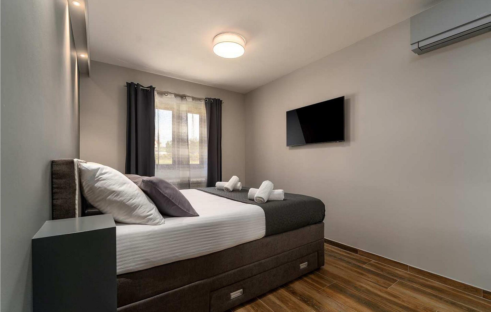 Ferienhaus Kadore für 6 Personen mit einer Gesamtfläche von 280 qm auf drei vollklimatisierte Etagen. Im Erdgeschoss gibt es ein Wohnzimmer mit Zugang zum Pool, eine voll ausgestattete Küche mit Esstisch, zwei Schlafzimmer mit Doppelbett und ein Badezimmer. Im ersten Stock gibt es eine Terrasse mit Sitzmöbeln, ein Schlafzimmer mit Doppelbett und eigenem Bad. Im Untergeschoss stehen den Gästen eine Taverne mit Küche und ein zusätzlicher Raum mit Billardtisch und Freizeitgeräten zur Verfügung und eine Dusche/WC.