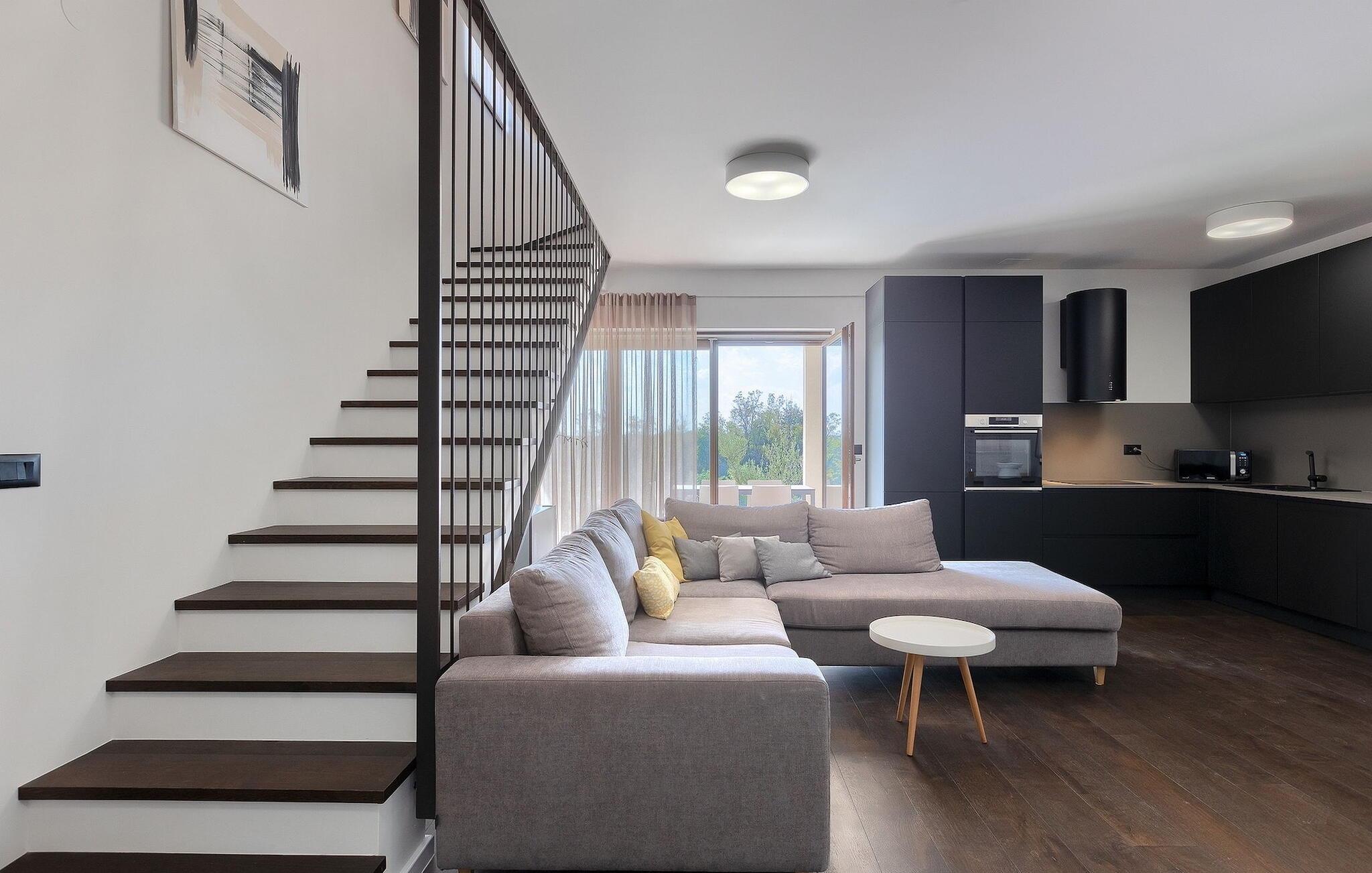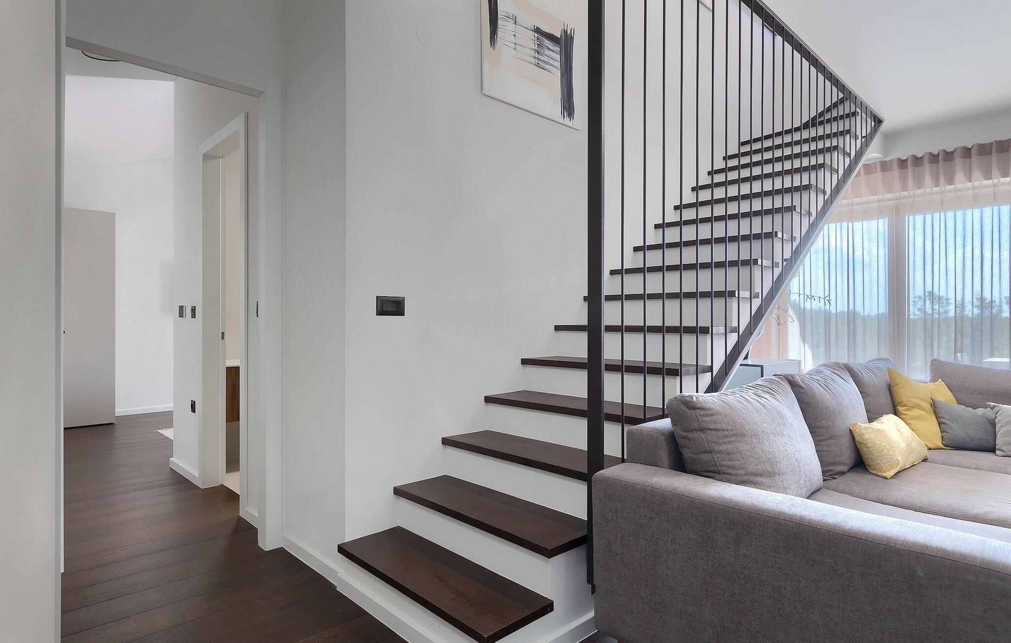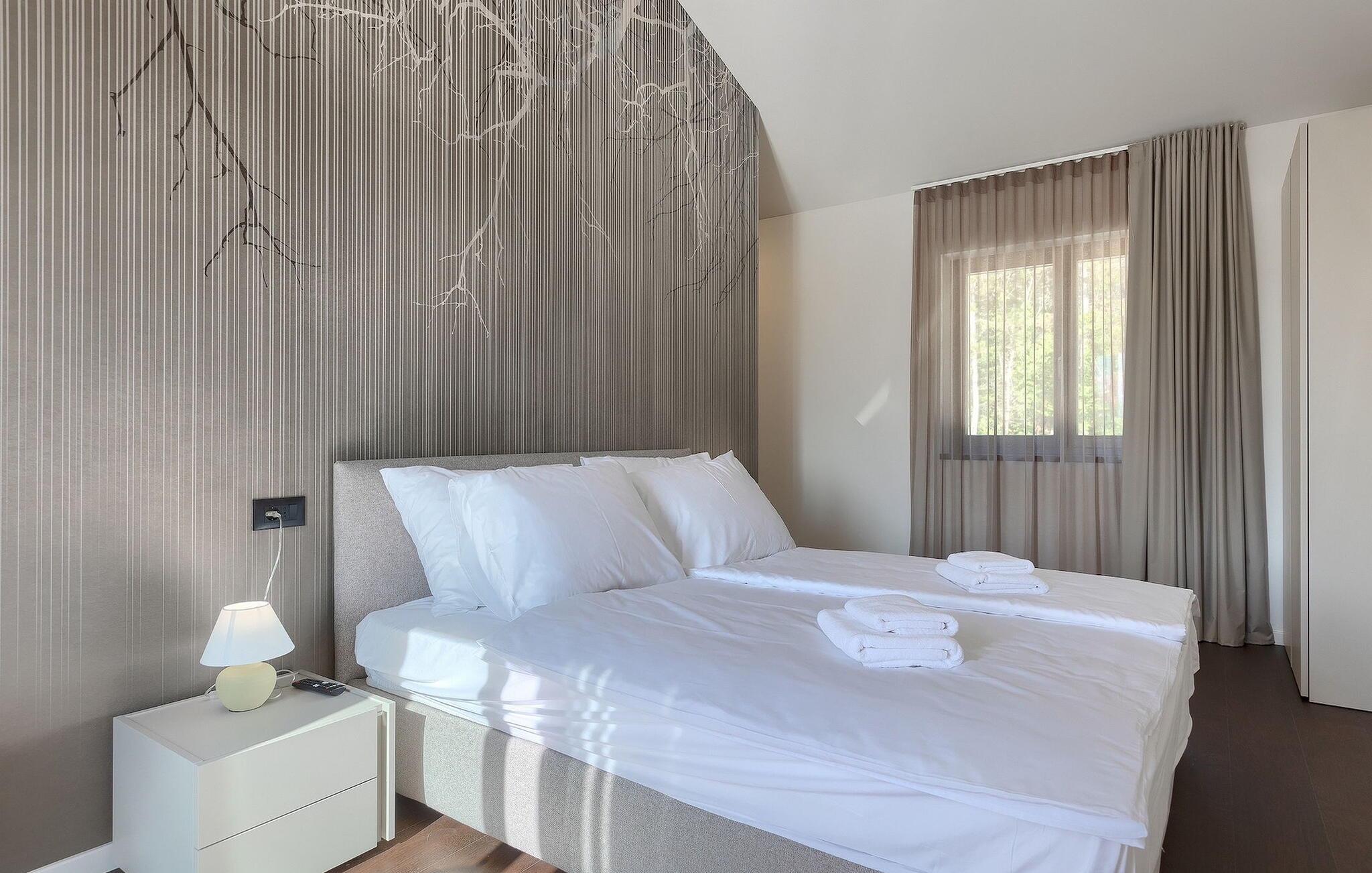 Das Interieur ist sehr geschmackvoll eingerichtet. Den lichtdurchfluteten Raum schmücken natürliche Töne und geben ihm eine Wärme, die sich wie zu Hause anfühlt. Der offene Wohnbereich verbindet Wohn- und Essbereich mit der gut ausgestatteten, modernen Küche und führt dann in eines der Schlafzimmer mit bequemem Doppelbett und eigenem Badezimmer. Eine separate Gästetoilette vervollständigt diese Ebene. Auf der oberen Etage versprechen zwei weitere Schlafzimmer erholsame Nächte. Alle Schlafzimmer verfügen über ein großes Doppelbett, TV, Klima und ein eigenes Badezimmer mit Dusche, wodurch maximales Komfort für alle Gäste ermöglicht wird.