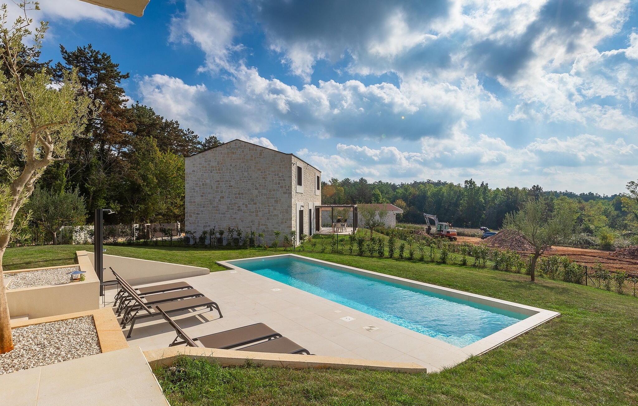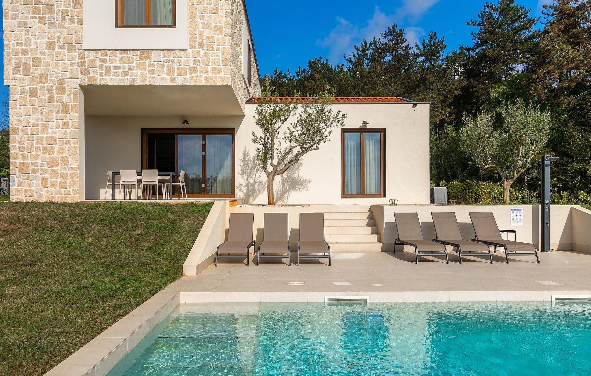 Verbringen Sie in dieser Traumvilla einen unvergesslichen Sommer mit Familie und Freunden. Der erfrischende, 35m2 große Swimmingpool wird an heißen Sommertagen zum Mittelpunkt. Schwimmen Sie gelassen ein paar Runden oder tanken Sie Sonne auf einer der bequemen Sonnenliegen, während Sie Ihr kühles Lieblingsgetränk genießen. Die überdachte Terrasse lädt dazu ein, sich mit den Liebsten am Esstisch zu versammeln und Ausflüge in die Region zu planen. Verkosten Sie hier auf dem Holzkohlegrill zubereitete lokale Spezialitäten mit Blick auf die atemberaubende Landschaft, die Ihnen das magische Istrien zu Füßen legt.