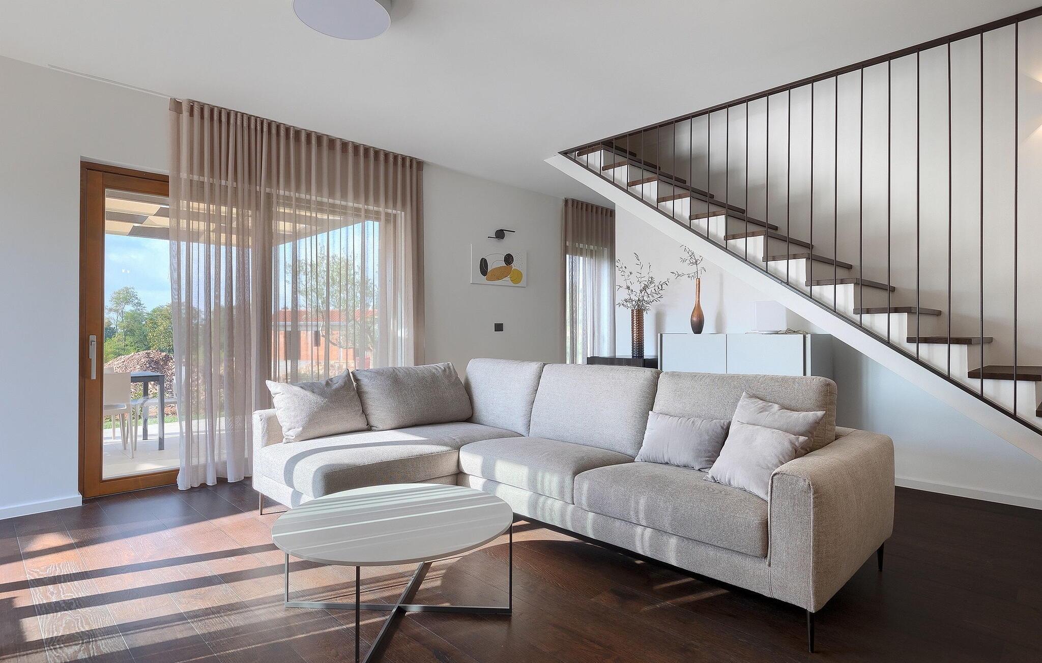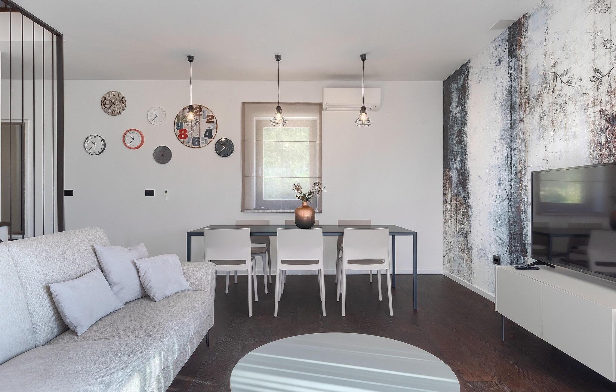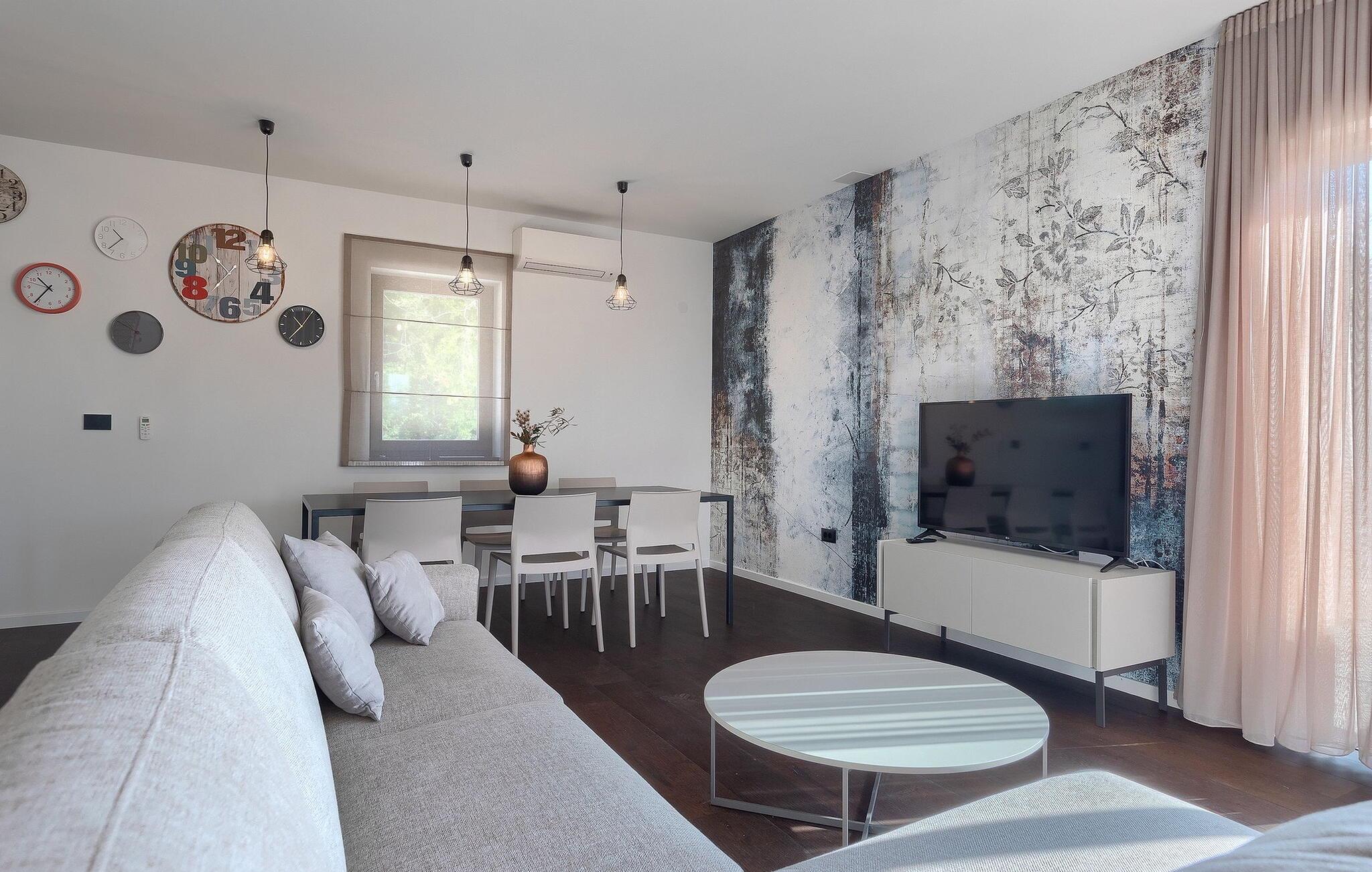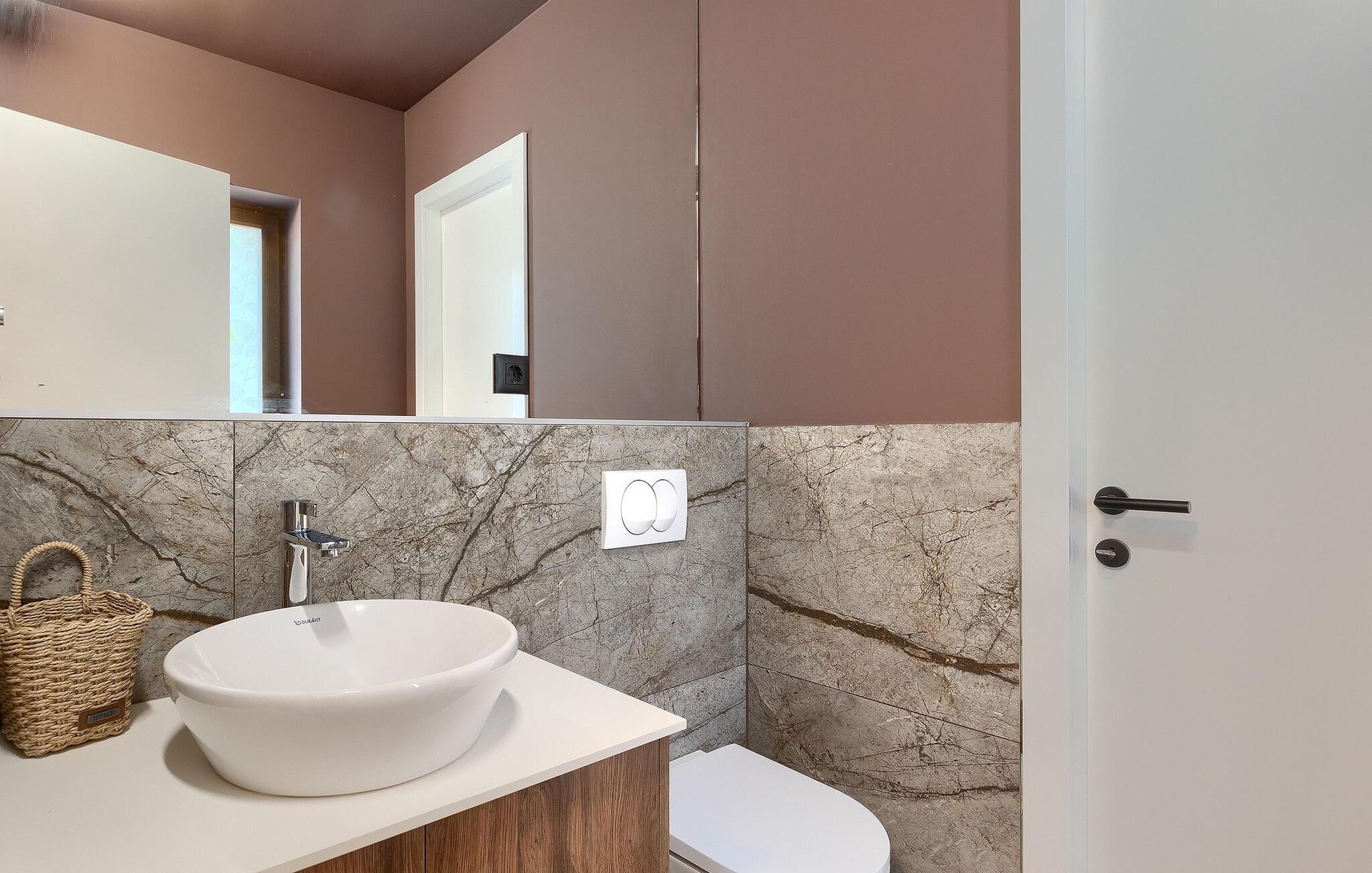 Von der Terrasse aus gelangen Sie direkt in das Erdgeschoss des halboffenen Grundrisses, wo sich Wohnzimmer, Esszimmer und Küche befinden. In diesem Raum kommt ein modernes Design mit warmen Farbtönen und viel natürlichem Licht zum Vorschein, die die Atmosphäre eines Heimes in dieser Villa vervollständigen. Die moderne Küche ist durch eine Wand ohne Tür optisch abgetrennt und verfügt über alle notwendigen Geräte für einen komfortablen Aufenthalt und die Zubereitung von Mahlzeiten für Ihre Liebsten. In der Fortsetzung des Erdgeschosses gibt es ein Schlafzimmer mit eigenem Bad und ein Gäste-WC.