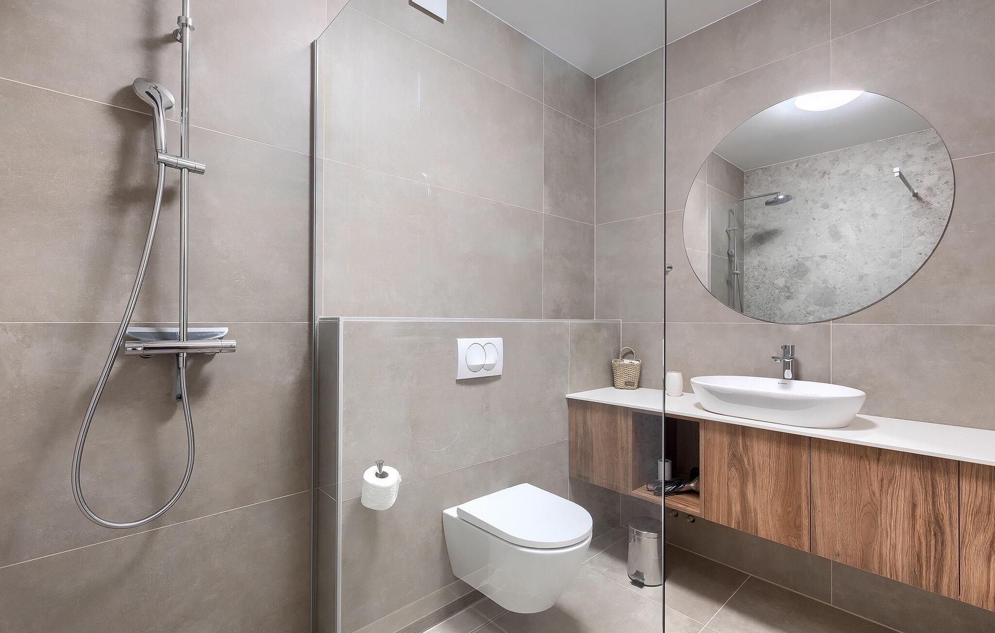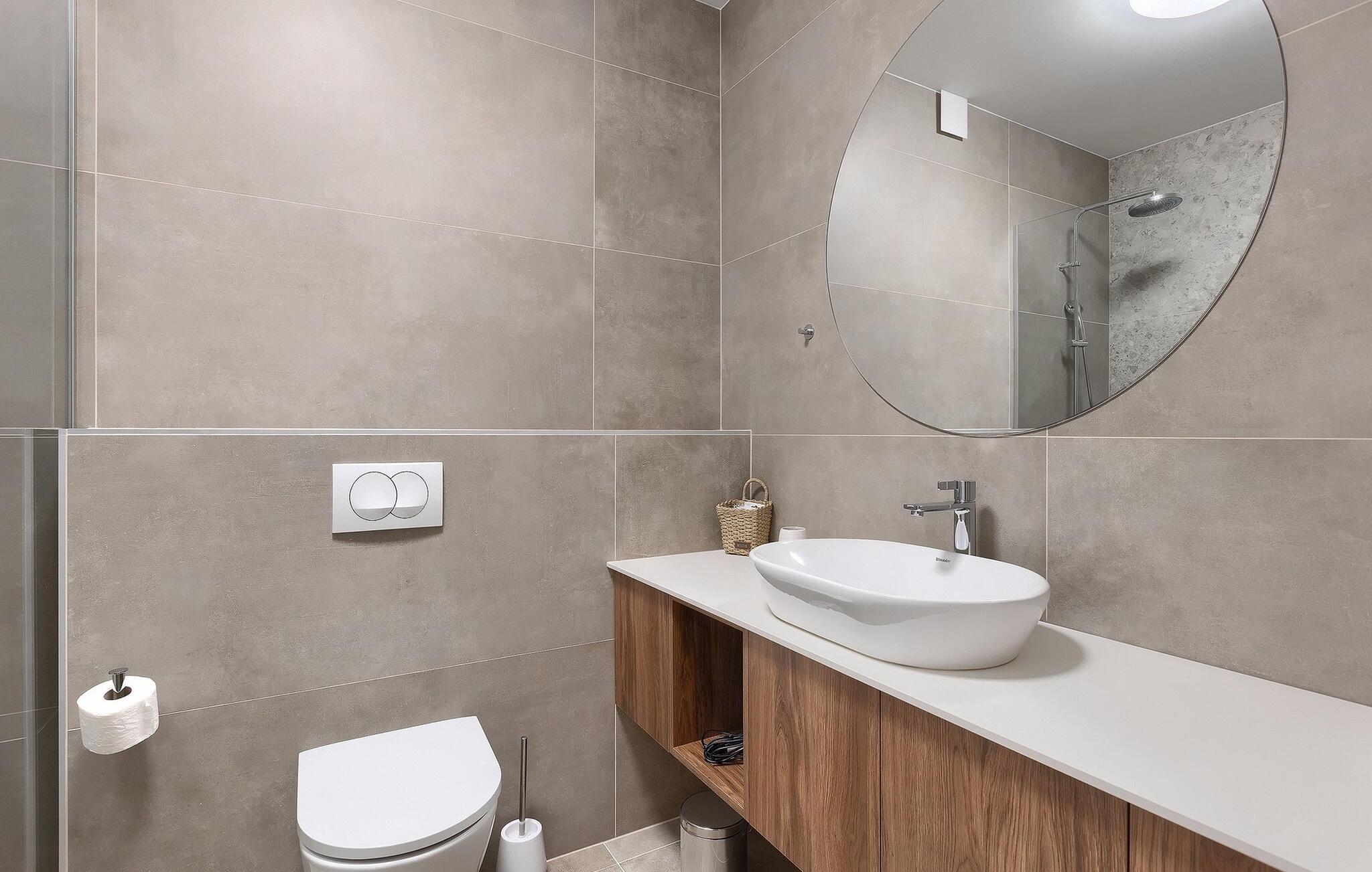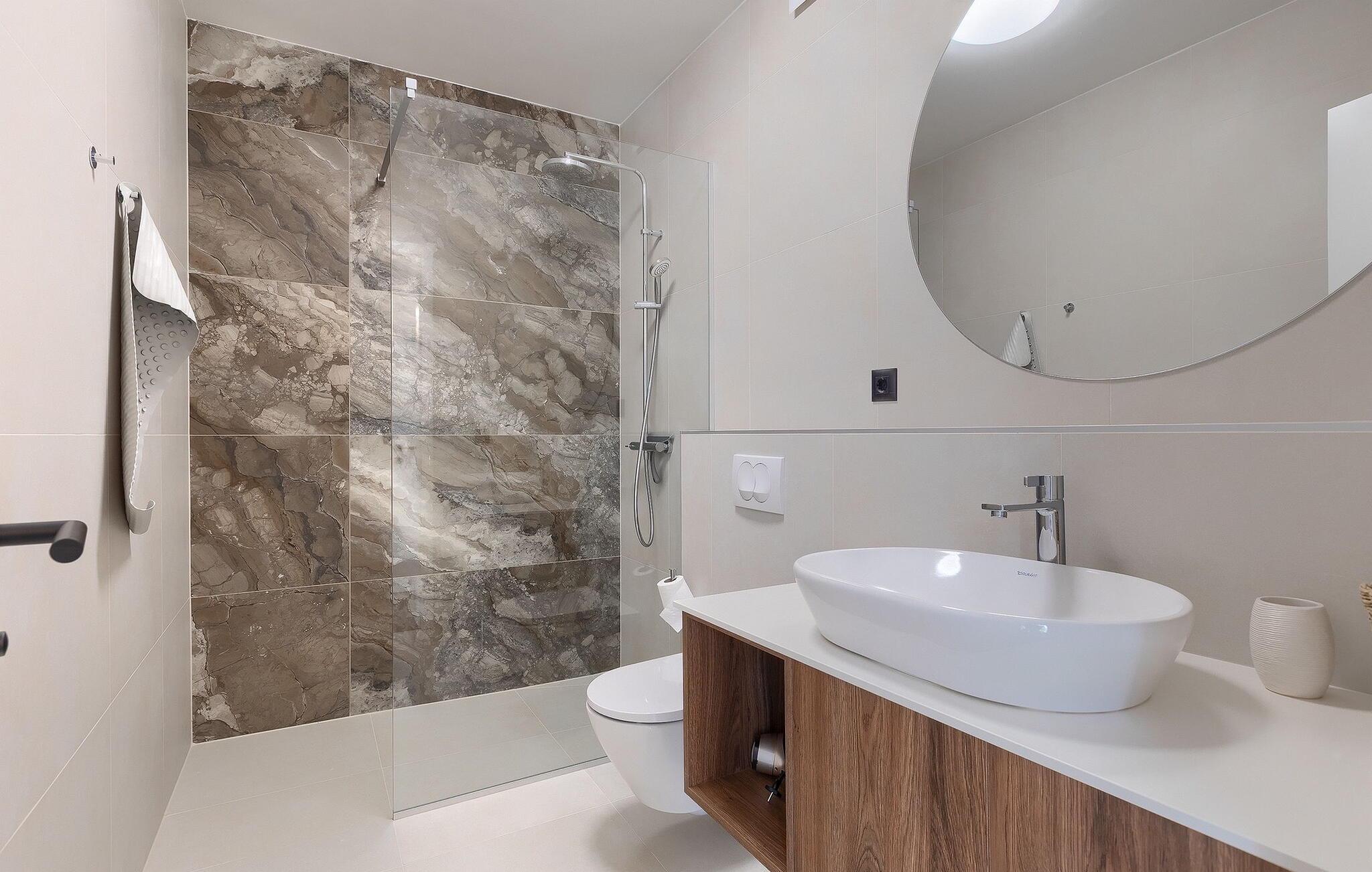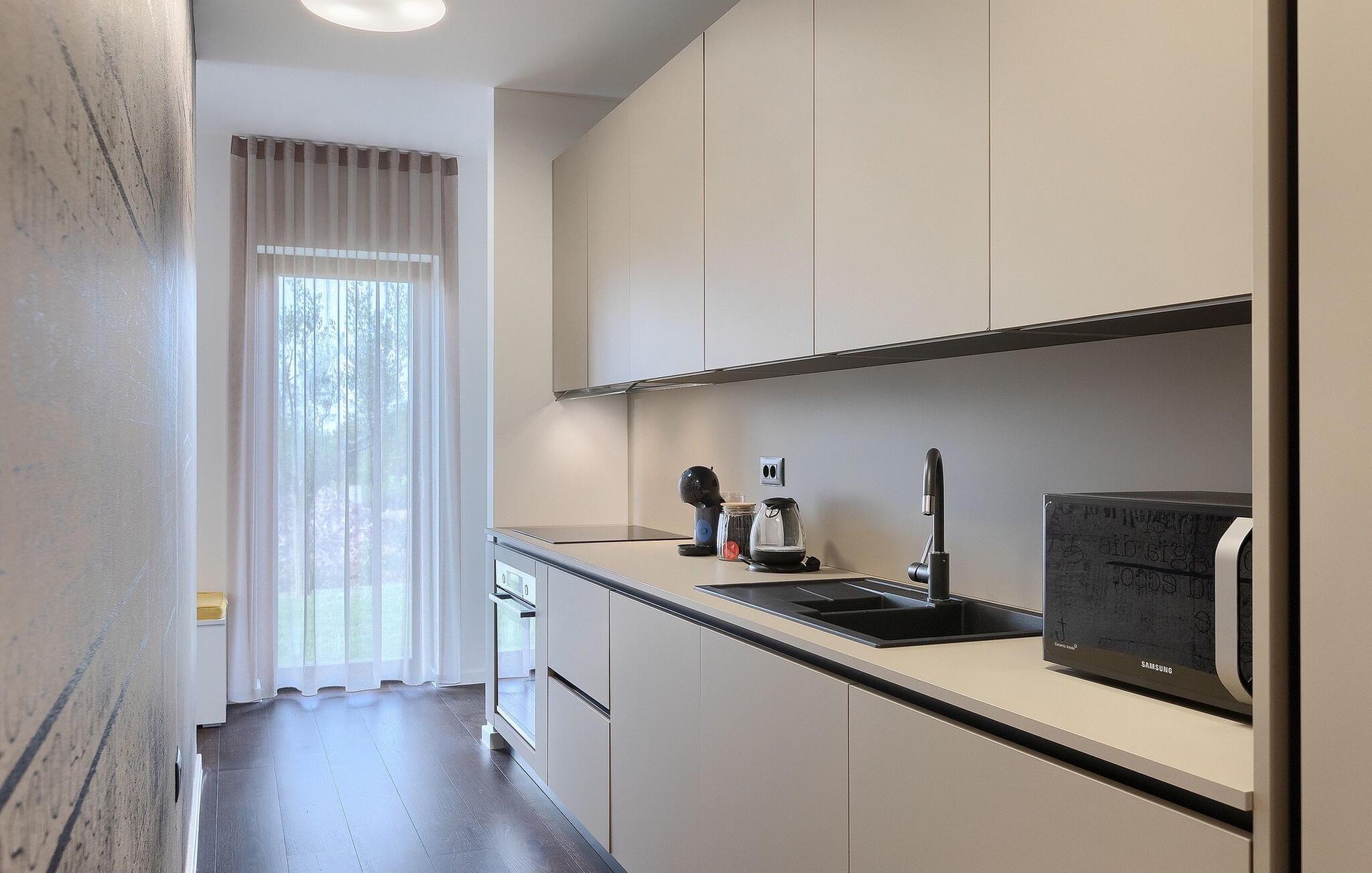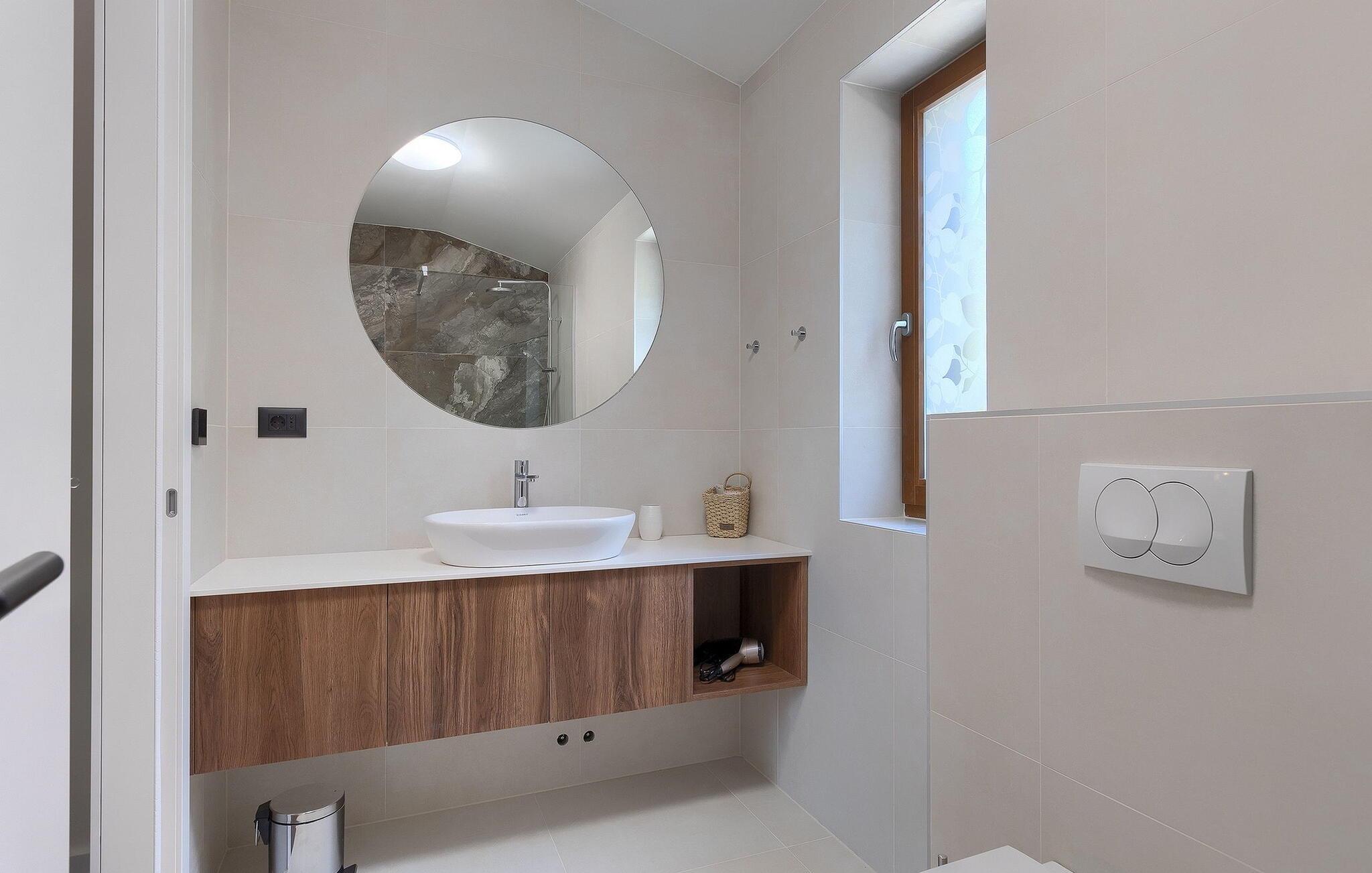 Von der Terrasse aus gelangen Sie direkt in das Erdgeschoss des halboffenen Grundrisses, wo sich Wohnzimmer, Esszimmer und Küche befinden. In diesem Raum kommt ein modernes Design mit warmen Farbtönen und viel natürlichem Licht zum Vorschein, die die Atmosphäre eines Heimes in dieser Villa vervollständigen. Die moderne Küche ist durch eine Wand ohne Tür optisch abgetrennt und verfügt über alle notwendigen Geräte für einen komfortablen Aufenthalt und die Zubereitung von Mahlzeiten für Ihre Liebsten. In der Fortsetzung des Erdgeschosses gibt es ein Schlafzimmer mit eigenem Bad und ein Gäste-WC.