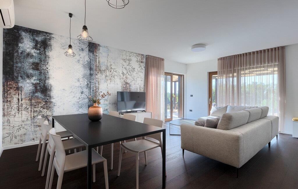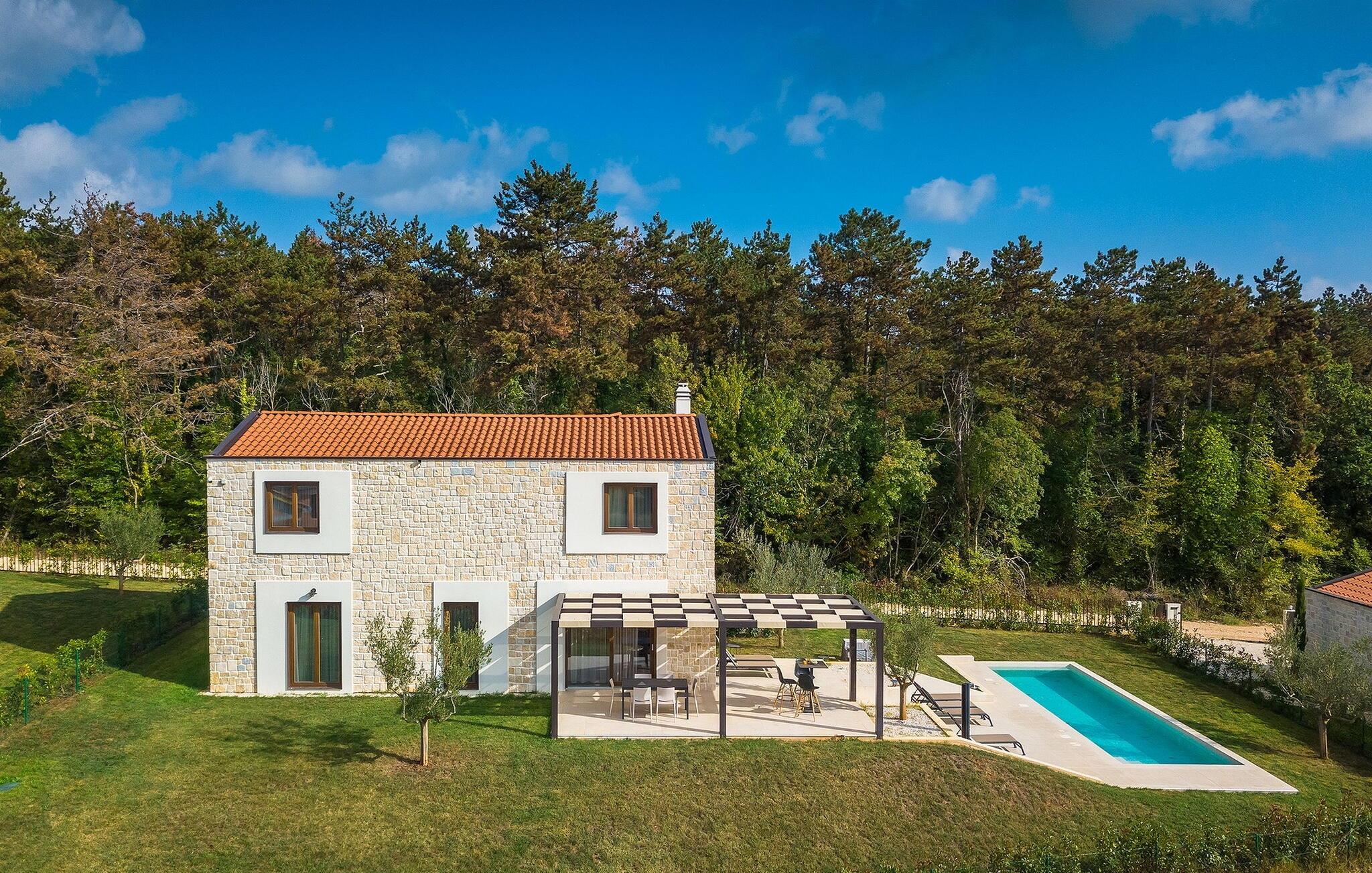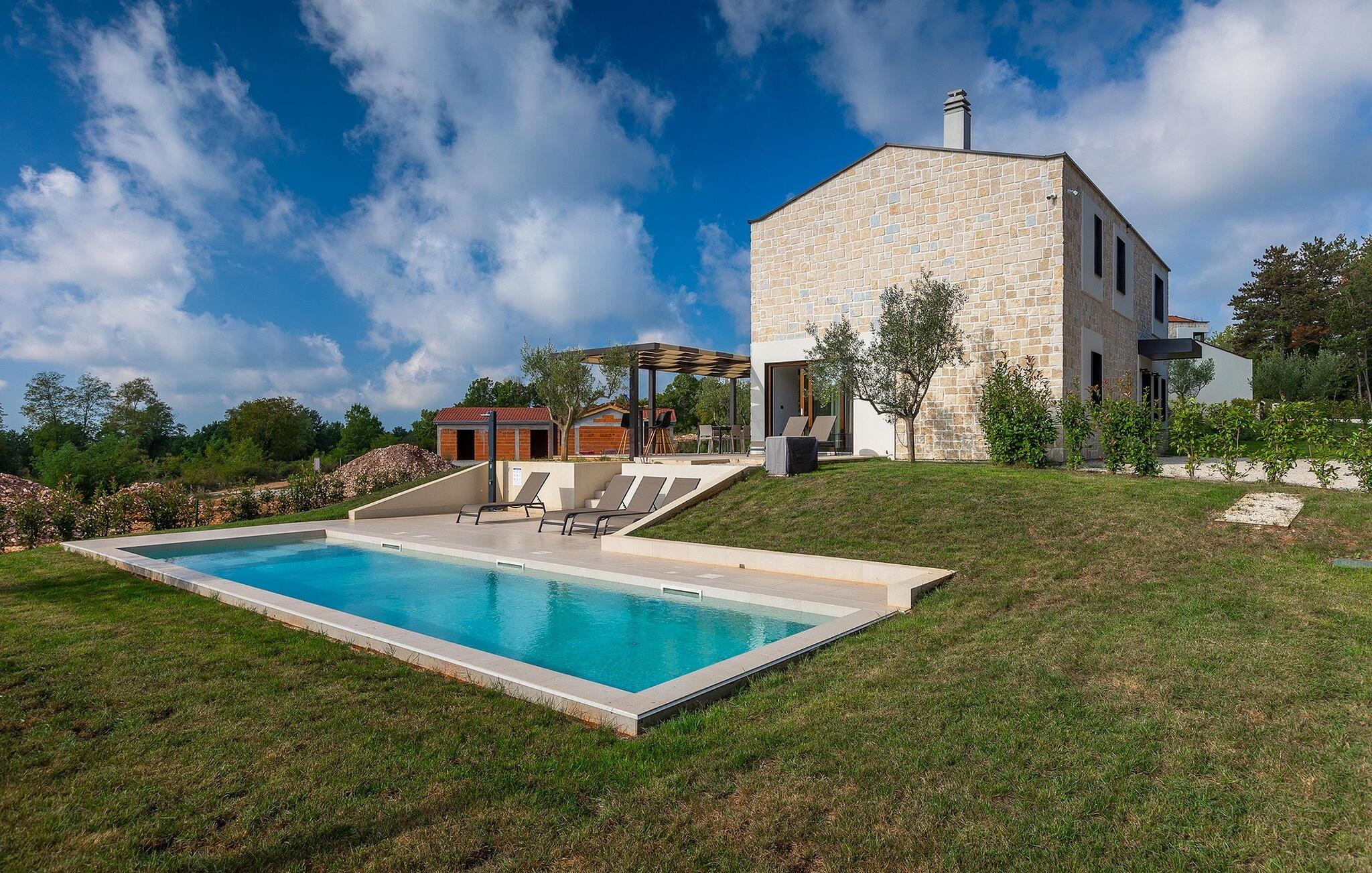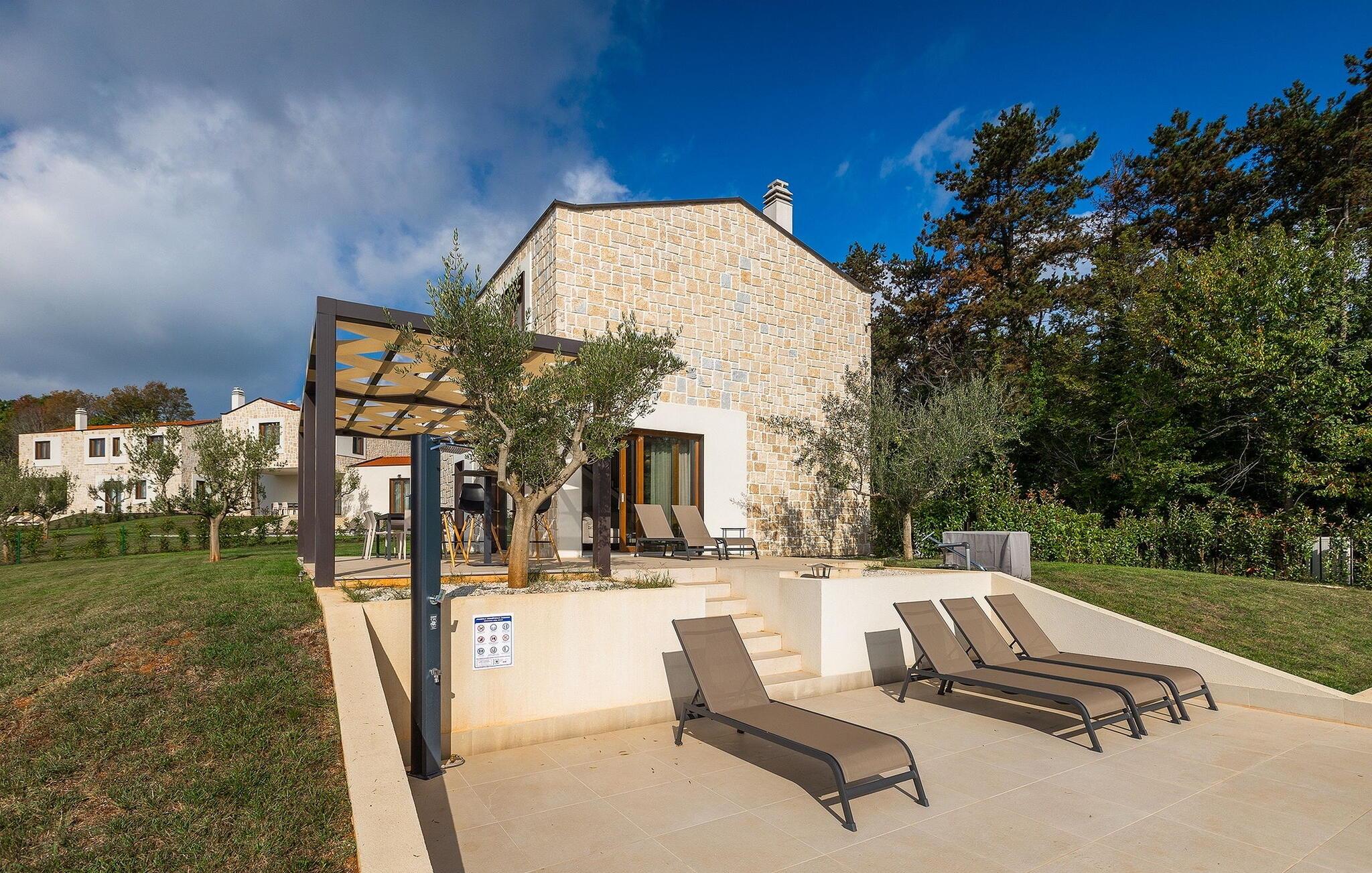 Wenn Sie eine Villa für einen erholsamen Urlaub mit Blick in die Natur suchen, ist Villa Veritas für insgesamt 8+1 Gäste die perfekte Wahl für Sie. Diese Villa kombiniert eine rustikale Steinfassade und ein modernes Interieur mit neutralen Farben, mit einigen sorgfältig ausgewählten Details. Die Grünfläche ist ein toller Ort zum Spielen für Kinder, aber das ist sicherlich nicht der einzige Vorteil dieser Villa – der Favorit ist sicherlich der private Pool. Wir sind uns sicher, dass Sie den privaten Pool besonders in den warmen Sommermonaten zum Abkühlen oder Schwimmen genießen werden. Doch auch an etwas kälteren Tagen können Sie auf Anfrage die Poolheizung nutzen, sodass auch dann die Atmosphäre einer Villa mit Pool nicht fehlt. Nach dem Schwimmen ist es Zeit zum Entspannen, Lesen und Liegen in der Sonne auf den Liegestühlen rund um den privaten Pool. Auf der Ebene des Erdgeschosses gibt es auch eine Terrasse, auf der Sie einen Esstisch im Freien finden, an dem Sie gemeinsame Mahlzeiten oder den Morgenkaffee genießen können.