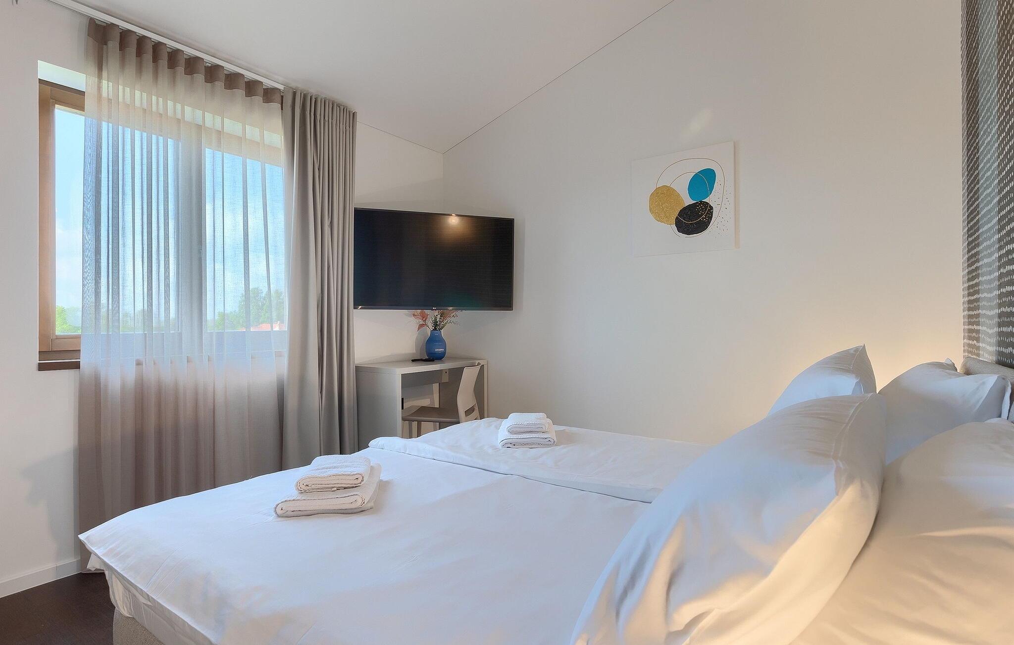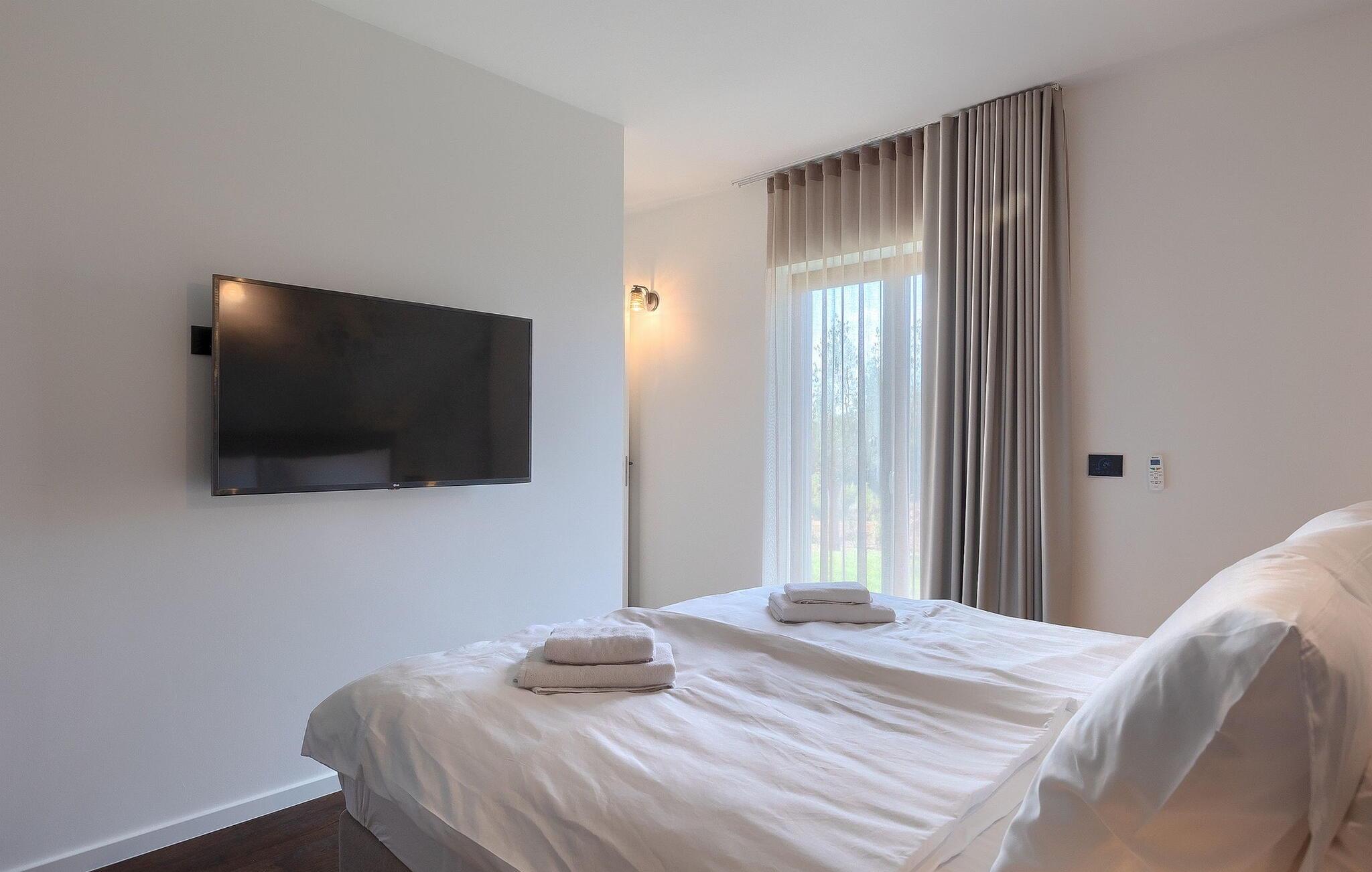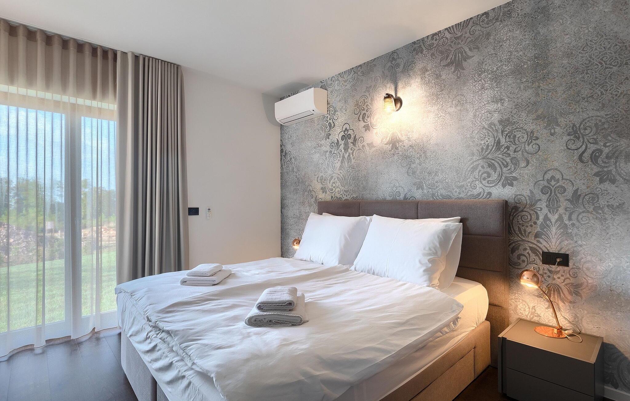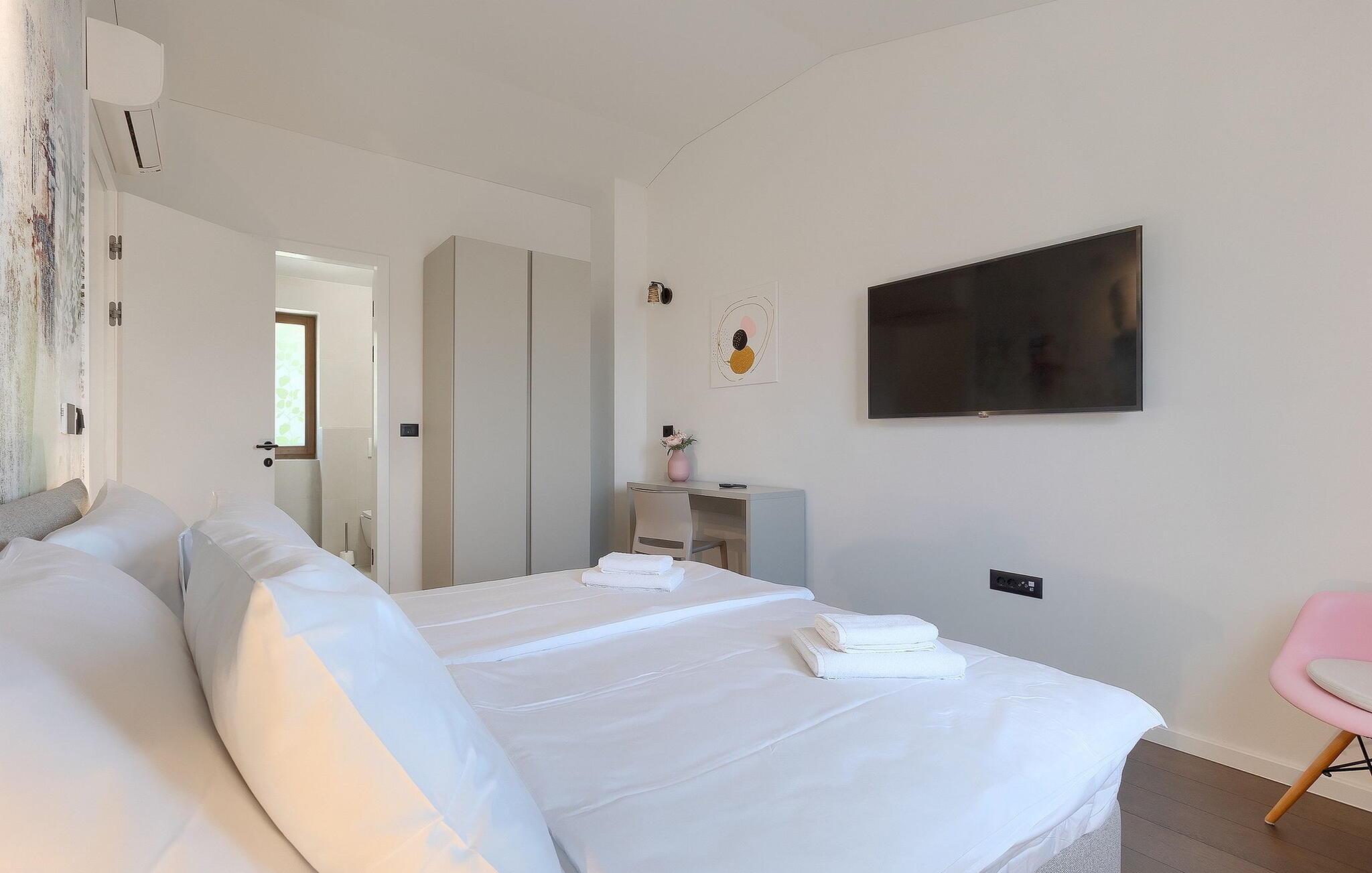 Wenn Sie eine Villa für einen erholsamen Urlaub mit Blick in die Natur suchen, ist Villa Veritas für insgesamt 8+1 Gäste die perfekte Wahl für Sie. Diese Villa kombiniert eine rustikale Steinfassade und ein modernes Interieur mit neutralen Farben, mit einigen sorgfältig ausgewählten Details. Die Grünfläche ist ein toller Ort zum Spielen für Kinder, aber das ist sicherlich nicht der einzige Vorteil dieser Villa – der Favorit ist sicherlich der private Pool. Wir sind uns sicher, dass Sie den privaten Pool besonders in den warmen Sommermonaten zum Abkühlen oder Schwimmen genießen werden. Doch auch an etwas kälteren Tagen können Sie auf Anfrage die Poolheizung nutzen, sodass auch dann die Atmosphäre einer Villa mit Pool nicht fehlt. Nach dem Schwimmen ist es Zeit zum Entspannen, Lesen und Liegen in der Sonne auf den Liegestühlen rund um den privaten Pool. Auf der Ebene des Erdgeschosses gibt es auch eine Terrasse, auf der Sie einen Esstisch im Freien finden, an dem Sie gemeinsame Mahlzeiten oder den Morgenkaffee genießen können.