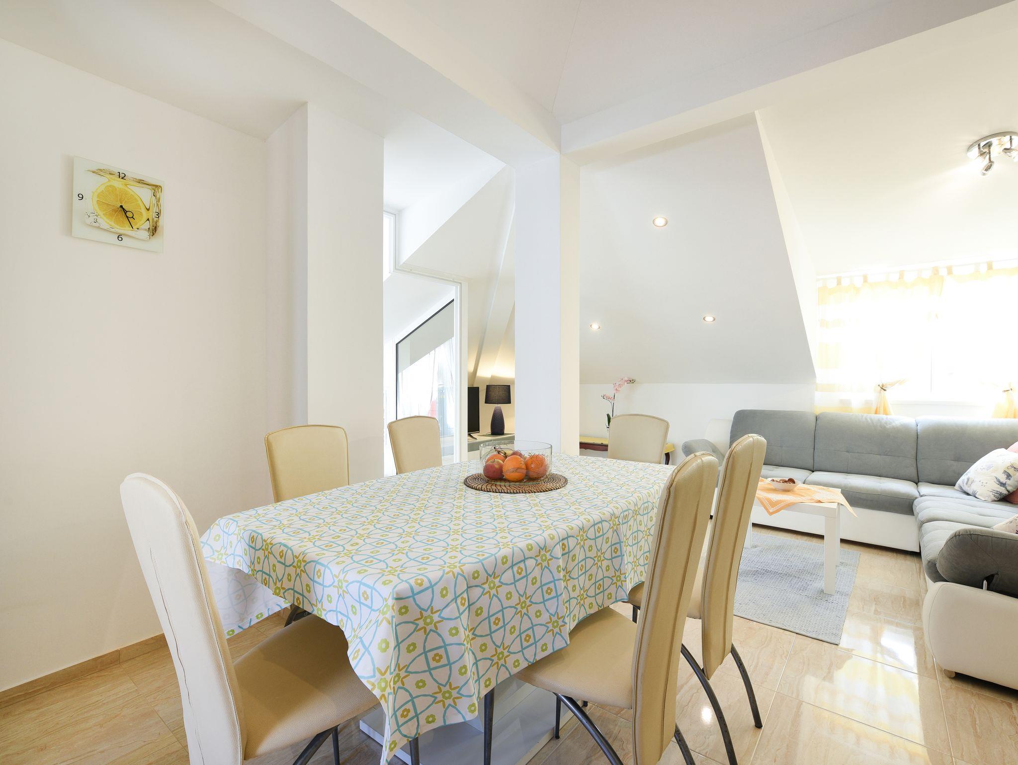 Ferienwohnung bietet Platz für 4 Gäste. Die Betten sind in Schlafzimmern, die es 2 gibt, innerhalb einer Gesamtfläche von 61m2, angeordnet. Die Gäste haben einen eigenen Balkon zur Verfügung, auf der sie in warmen Sommernächten genießen können. Das Apartment bietet Meerblick. Es ist erlaubt, Speisen auf dem Gemeinschafts-Grill vorzubereiten. IM PREIS INBEGRIFFEN: Kurtaxe, Endreinigung, Klimatisierung, Parkplatz, Internet, Bügeleisen, Bügelbrett, Föhn. VERBINDLICHE ZUSÄTZLICHE KOSTEN: Aufzahlung für Kurzaufenthalte (prozentualer Zuschlag pro Nächtigungsanzahl: 30% - 1, 20% - 2, 10% - 3). UNVERBINDLICHE ZUSÄTZLICHE KOSTEN: Wäschewaschen (7,00 € Waschen). Die Verfügbarkeit zusätzlicher Dienstleistungen in Ihrem reservierten Termin und die Preise derselben (falls nicht aufgeführt) müssen im Voraus überprüft werden. Zusätzliche Dienstleistungen die in der Zahlungsaufforderung nicht aufgeführt sind werden direkt beim Vermieter bezahlt, angenommen der Gast nutzt auch diese. Ermäßigung auf den Grundpreis: Gratistag 21=19 (bei einem Aufenthalt von 21 Tagen oder mehr erhalten Sie 2 Gratistage für den Aufenthalt bis 31.12.26).