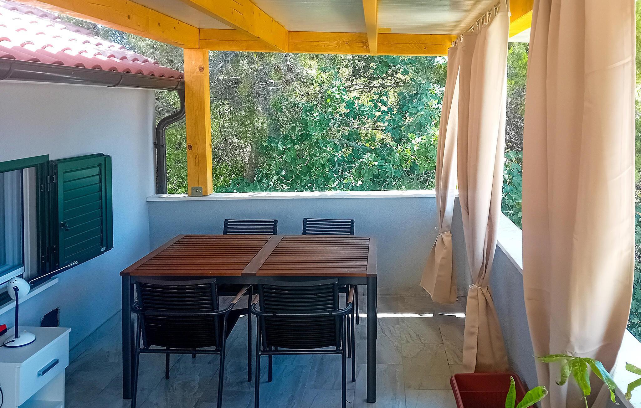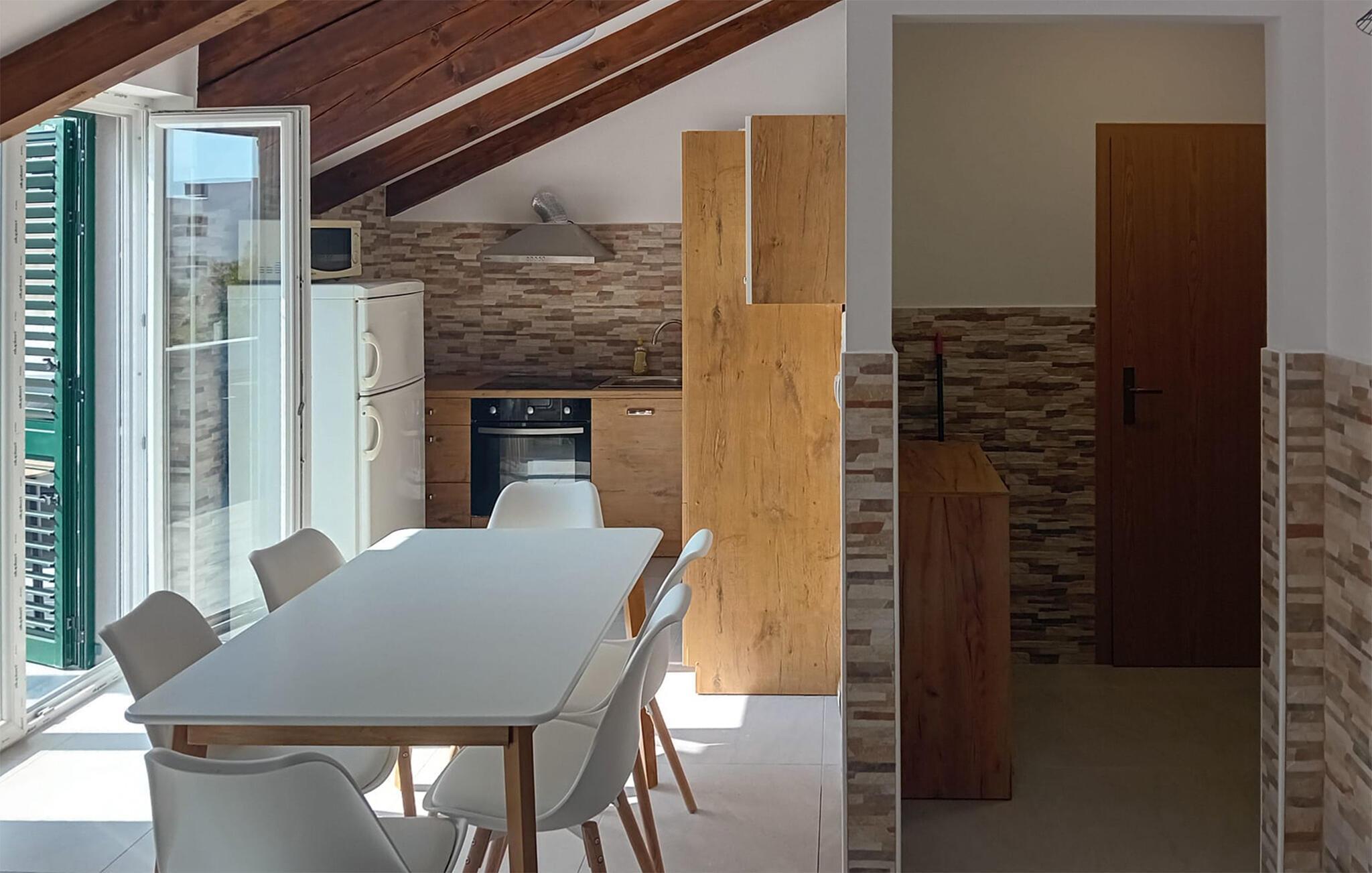 Die angenehme Wohnung besticht durch ihren großzügigen Balkon, der Ihnen nicht nur einen Platz zum Entspannen bietet, sondern auch einen herrlichen Blick auf die Umgebung. Dank der ruhigen Lage zwischen den Häusern genießen Sie hier ein hohes Maß an Privatsphäre, während das Meer nur einen kurzen Fußweg entfernt ist.