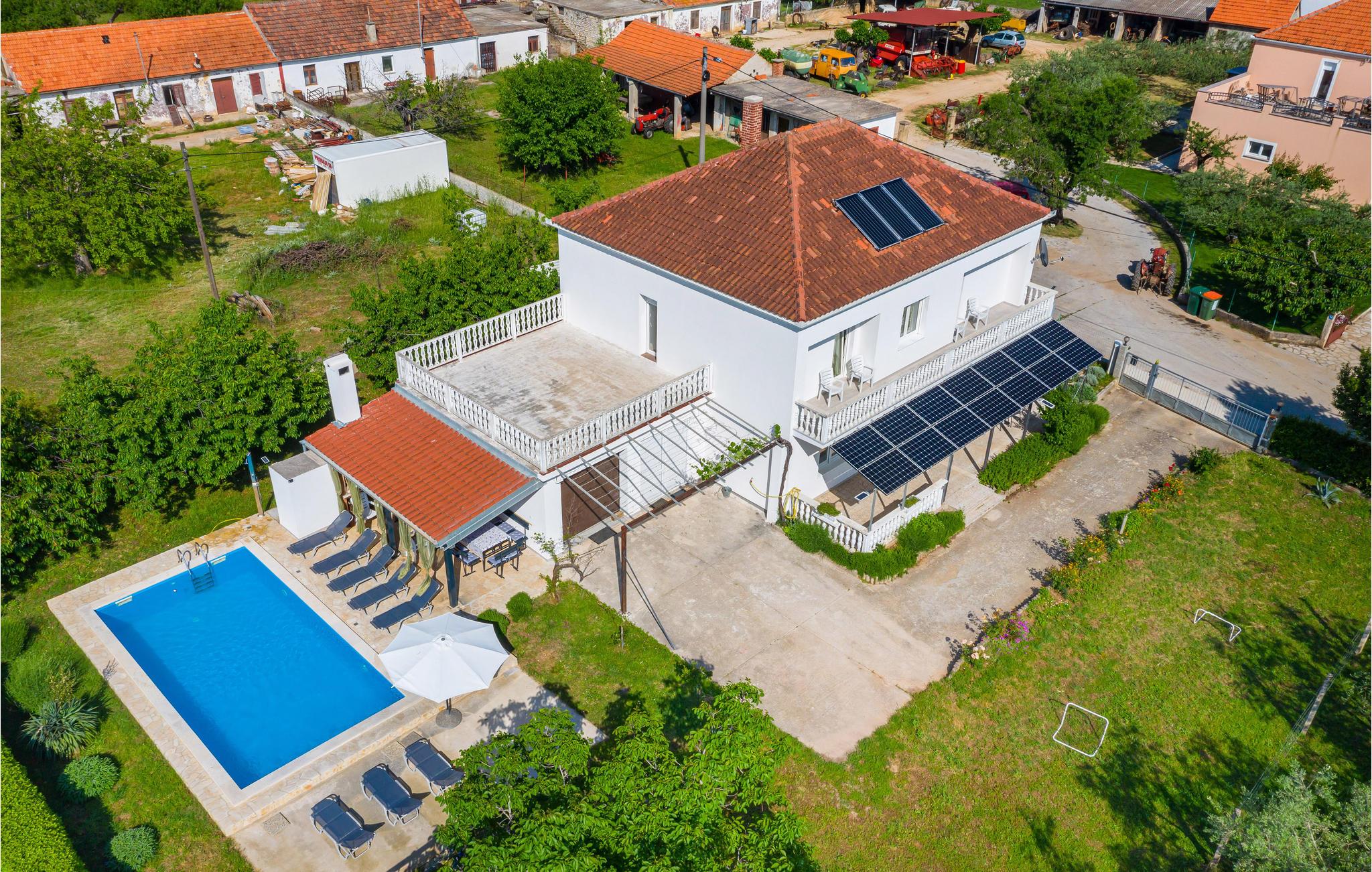 Dieses komfortable Ferienhaus in der ländlichen Umgebung hinter Sukosan erwartet Sie, schön platziert, im kleinen Ort Prkos. Den Ausblick auf die Landschaft und die Natur werden Sie sicherlich genießen. Das Ferienhaus verfügt insgesamt über fünf Schlafzimmer, drei Bäder, sowie eine Küche mit Wohnbereich. In den heißen Sommertagen bringt der Außenpool eine willkommene Erfrischung. Der erste Strand befindet sich in Sukosan, ein gepflegter Kiesstrand und gut für Kinder geeignet. Wenn Sie den Stadtrummel vermissen, besuchen Sie die Stadt Zadar, die ein reiches Kulturerbe, sowie zahlreiche Freizeitveranstaltungen bietet.