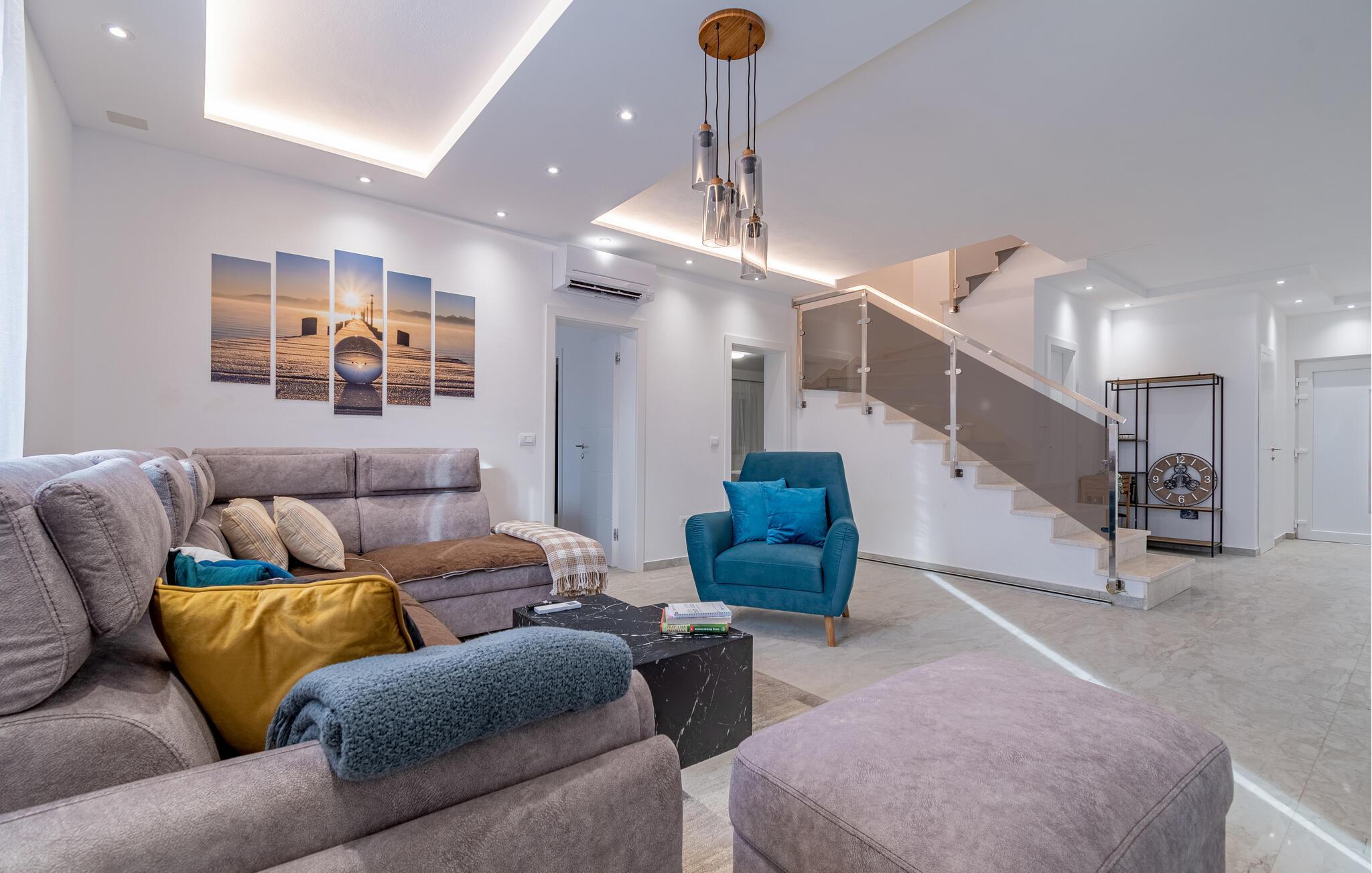 Dieses stattliche Haus ist mit seiner stilvollen Einrichtung wie geschaffen für einen fantastischen Aufenthalt. Die in dezenten Farben gehaltenen Innenräume versprühen gleichermaßen Wärme und Komfort. Kommen Sie auf der bequemen Sofalandschaft vollständig zur Ruhe, genießen Sie hier ein Nachmittagsschläfchen oder schmökern Sie in Ihrer Urlaublektüre. In der modern eingerichteten Küche zaubern Sie leckere Gerichte, bevor Sie am großen Esstisch in geselliger Runde speisen.