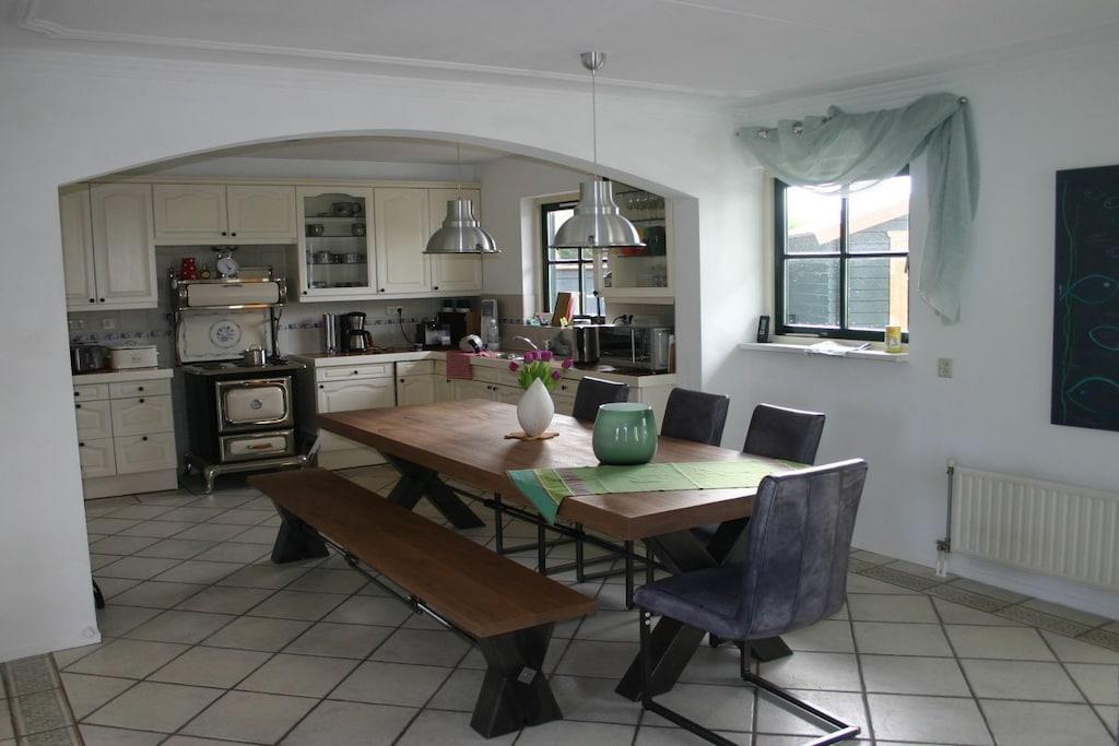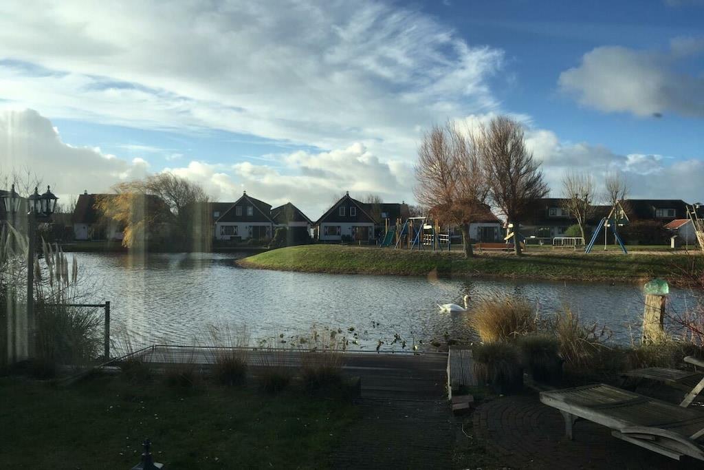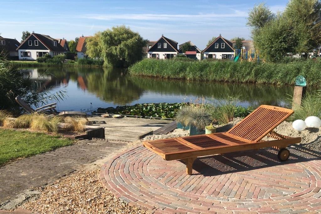 Gelegen im gepflegten Ferienpark Buitenplaats (150 Häuser) als Reetdach-Haus im holländischen Stil mit Sonnenterasse in Süd-Westlage und Blick auf den See mit Spielplatzinsel. Im Ferienhaus Fliesen unten sowie im Bad oben, im Wintergarten (15m2) und oben Clickvinyl, Fußbodenheizung und zusätzlich ein Gaskamin im Wohnzimmer. Teppich nur unter Wohnzimmertisch. Der große Esstisch (2,8m) mit Bank und Stühlen wie auch der Wintergarten mit 6 Korbstühlen laden zum Essen und Spielen auch in großer Runde ein. Das große Schlafzimmer wie auch ein Kinderschlafzimmer haben große Einbauschränke zur Gästenutzung. Gartenhaus: 4x28Zoll Fahrräder, 1 Tandem, 1 Klapprad zur Nutzung (ohne Gewähr für intakte Technik und eigene Sicherheit). 2 Leki-Liegen