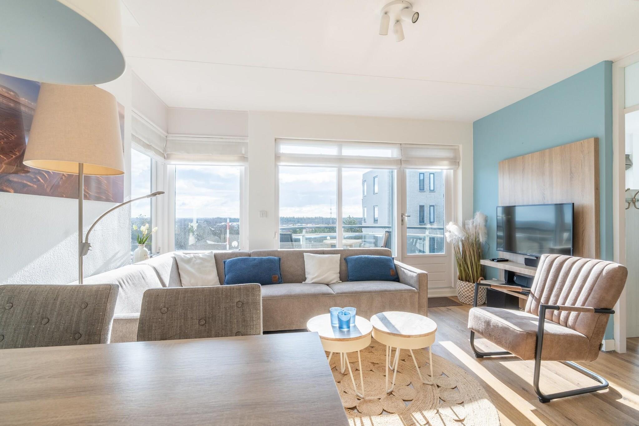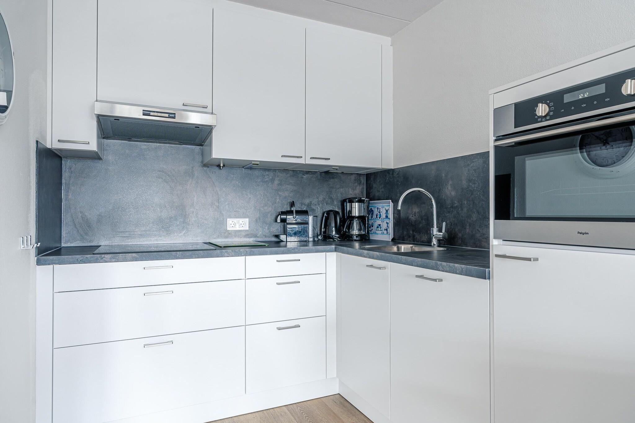 Charmantes 4-Personen-Appartement im ersten Stock mit Balkon und Blick auf De Koog und die umliegende Landschaft. Das geräumige Wohnzimmer verfügt über eine Sitzecke, einen Fernseher und einen Essbereich mit einem Esstisch für vier Personen. Die gepflegte offene Küche ist komplett ausgestattet und umfasst unter anderem einen Geschirrspüler, eine Kombi-Mikrowelle, einen Kühl-Gefrierschrank und verschiedene Kaffeemaschinen. Es gibt zwei Schlafzimmer, eines davon mit Fernseher. Beide Schlafzimmer sind mit zwei Einzel-Boxspringbetten ausgestattet. Das gepflegte Badezimmer verfügt über eine geräumige ebenerdige Dusche und ein Waschbecken. Die Toilette ist separat. Der Balkon bietet die Möglichkeit, einen wunderschönen Sonnenaufgang zu bewundern und ist mit Gartenmöbeln ausgestattet. Eine Waschküche steht vor Ort gegen Gebühr zur Verfügung. Kindermöbel sind auf Anfrage und gegen Gebühr erhältlich. Kostenloses WLAN. Rauchen ist nicht gestattet. Pro Unterkunft steht vor Ort ein Parkplatz zur Verfügung.