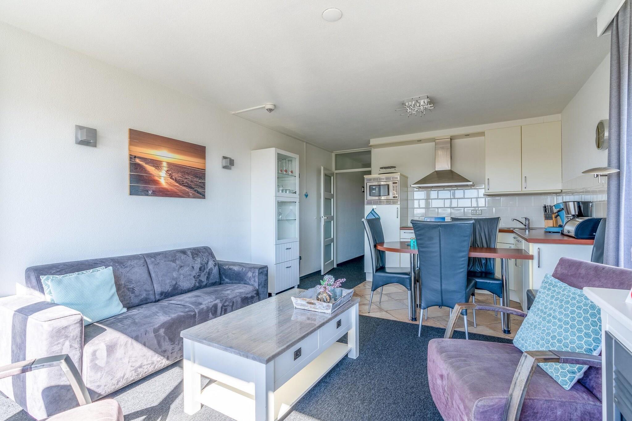 Geschmackvoll eingerichtetes 4-Personen-Appartement im zweiten Stock mit Balkon und Blick über Texel und die Nordsee. Das Wohnzimmer verfügt über eine Sitzecke, einen Esstisch, einen Fernseher, einen DVD-Player, eine Stereoanlage und einen dekorativen Kamin. Die offene Küche ist mit einem Geschirrspüler, einer Kombi-Mikrowelle, einem Kühl-Gefrierschrank und verschiedenen Kaffeemaschinen ausgestattet. Es gibt zwei Schlafzimmer, beide mit zwei Einzelbetten. Das Hauptschlafzimmer verfügt über einen Fernseher. Das Badezimmer ist mit Badewanne, Dusche und Waschbecken ausgestattet. Die Toilette ist separat. Der Balkon ist mit Gartenmöbeln ausgestattet und bietet Blick auf die Dünen und die Nordsee. Waschmöglichkeiten stehen vor Ort zur Verfügung. Kindermöbel sind auf Anfrage und gegen Gebühr erhältlich. Kostenloses WLAN ist verfügbar. Rauchen ist nicht gestattet. Pro Unterkunft steht ein Parkplatz vor Ort zur Verfügung.