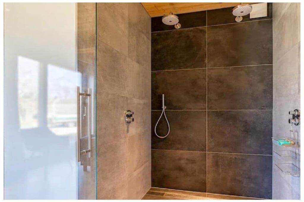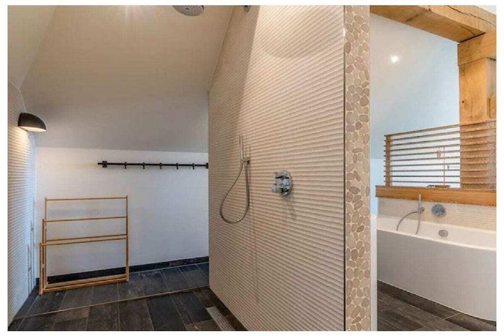 Wohnzimmer Das geräumige Wohnzimmer verfügt über eine Sitzecke mit Kamin, Smart-TV und Musikanlage. Es gibt einen Essbereich mit einem großen Esstisch für 6 Personen. Die offene Küche ist voll ausgestattet mit verschiedenen Einbaugeräten wie Kühlschrank mit Gefrierfach, Kombimikrowelle, Dampfgarer, Geschirrspüler, Quooker und Kaffeemaschine. Schlafzimmer und Badezimmer Im Erdgeschoss befindet sich 1 Schlafzimmer mit einem eigenen Bad, einer ebenerdigen Dusche mit zwei Regenduschen und Doppelwaschbecken. Auf der Etage befinden sich zwei Schlafzimmer mit eigenem Badezimmer en suite. Diese Badezimmer verfügen über eine geräumige ebenerdige Dusche und eine Badewanne. Alle Schlafzimmer im Haus verfügen über komfortable Boxspring-Betten und einen TV. Die Betten sind standardmäßig bezogen und Handtücher liegen für Sie bereit. Garten Der Wohnraum ist durch die Schiebetüren direkt mit der Terrasse verbunden. Die Terrasse ist mit Gartenmöbeln ausgestattet und befindet sich im Süden. Es gibt eine komplette Außenküche.
