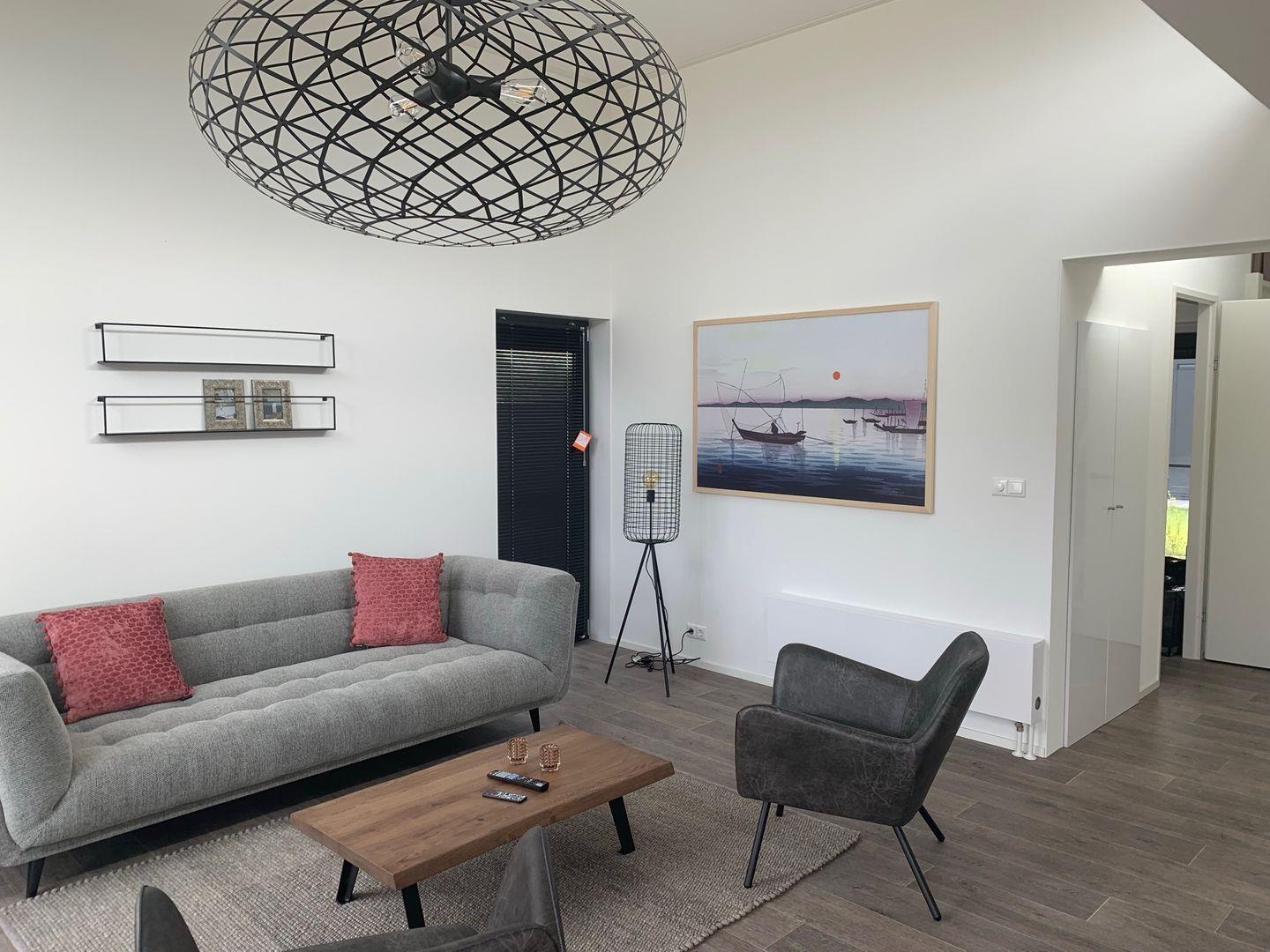 Im komfortablen Wohnzimmer finden Sie eine Sofaecke mit Sessel, einen großen Flachbild-TV (44–55 Zoll, internationale Kanäle verfügbar) und einen gemütlichen Kaminofen für entspannte Abende. Mit zwei Schlafzimmern bietet das Ferienhaus Platz für bis zu sechs Personen. Das dritte Schlafzimmer im Obergeschoss (Mezzanine) mit niedriger Deckenhöhe (1,12 m) ist für Kinder geeignet und über eine Treppe im Flur erreichbar. Ein modernes Badezimmer mit bodengleicher Dusche, ein zweites zusätzliches Gäste-WC sowie ausreichend Stauraum in Garderobe und Schränken sorgen für einen rundum angenehmen Aufenthalt. Fliegengitter an den Fenstern und ein Rauchmelder ergänzen die Sicherheits- und Komfortausstattung. Kostenfreies WLAN mit einer Geschwindigkeit von mindestens 100 Mbit/s sorgt für ungehinderten Zugang zum Internet.