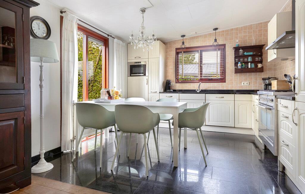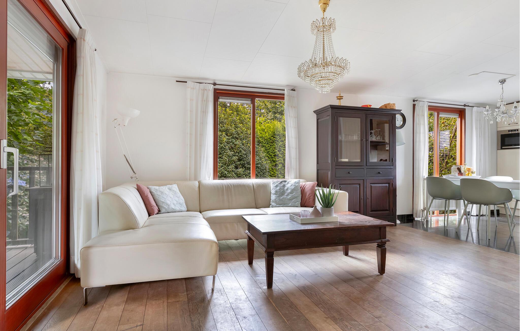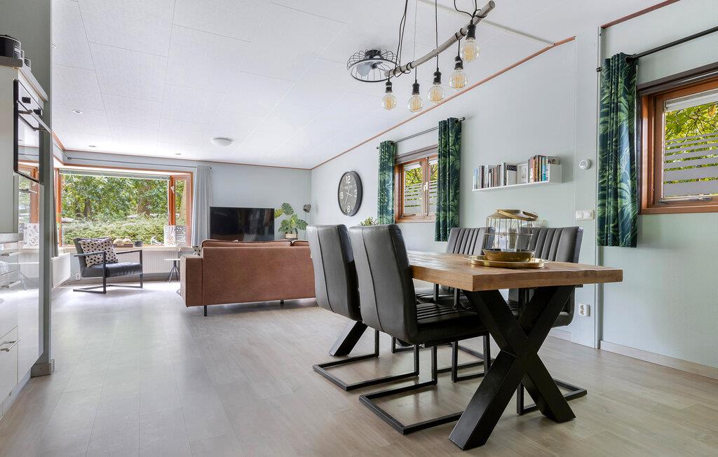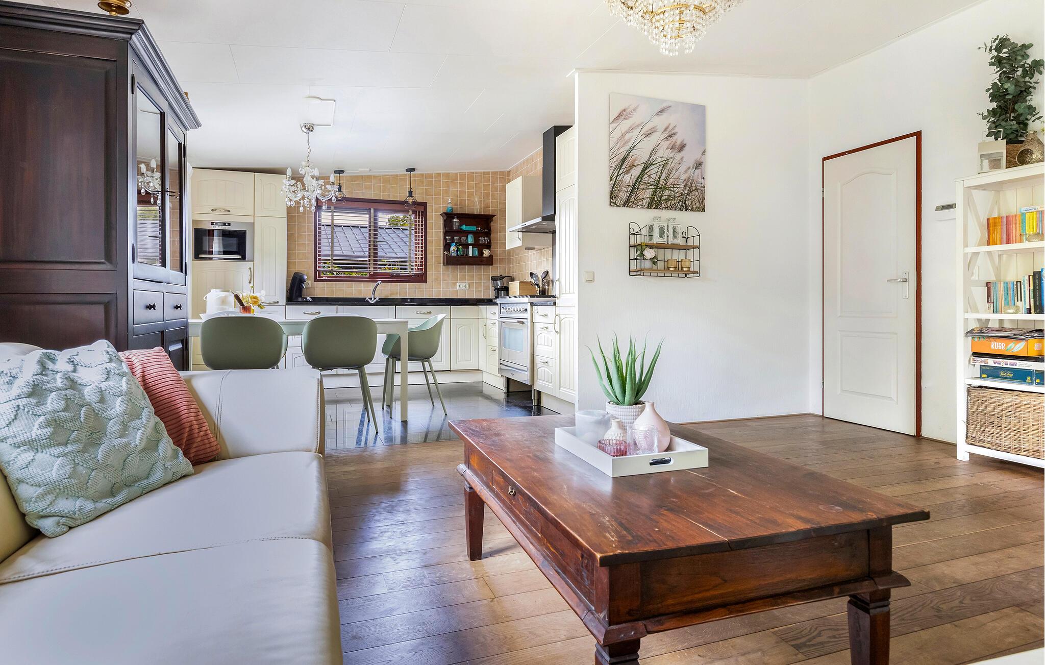 Verbringen Sie erholsame Tage in einem charmanten Ferienhaus mitten im Grünen und mit viel Komfort. Betreten Sie den hellen, liebevoll eingerichteten Wohnbereich mit großen Fenstern und gemütlichen Sofas. Die geschmackvolle Einrichtung in sanften Farben schafft eine freundliche und einladende Atmosphäre. Essen Sie am Esstisch neben der offenen Küche oder lehnen Sie sich zurück und lassen Sie den Blick ins Grüne schweifen.