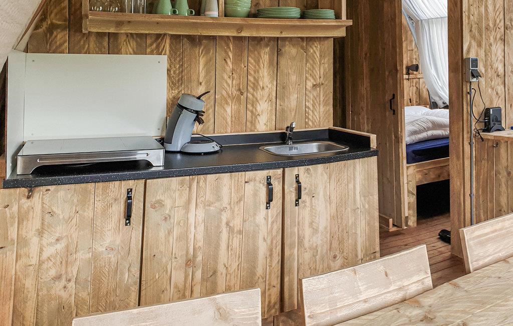 Ihre komfortable Glamping-Unterkunft mit einer einladenden Holzterrasse bietet Ihnen und Ihrer Familie alles, was Sie für eine erholsame Zeit benötigen. Die geschmackvollen Holzmöbel sorgen für Bequemlichkeit, sowohl im Innenbereich als auch draußen. Bereiten Sie in der funktionalen Küchenzeile leckere Mahlzeiten zu und genießen Sie diese gemeinsam am Esstisch oder auf der sonnigen Terrasse. Nutzen Sie die entspannte Atmosphäre, um Ihre Aktivitäten für den nächsten Urlaubstag zu planen.