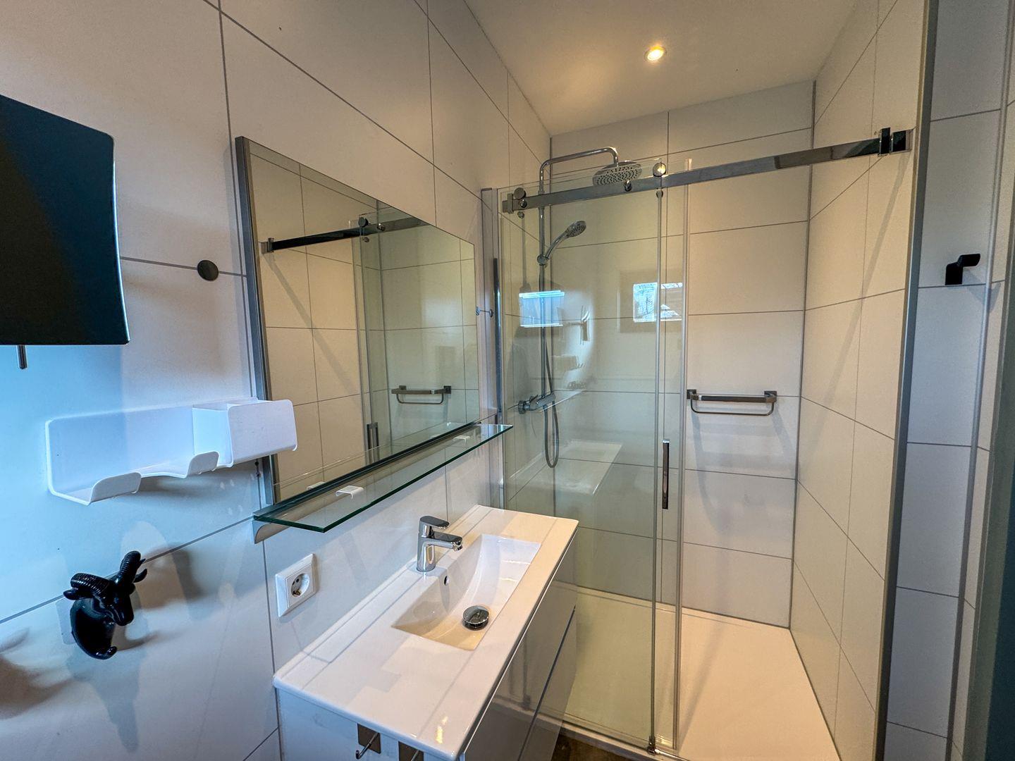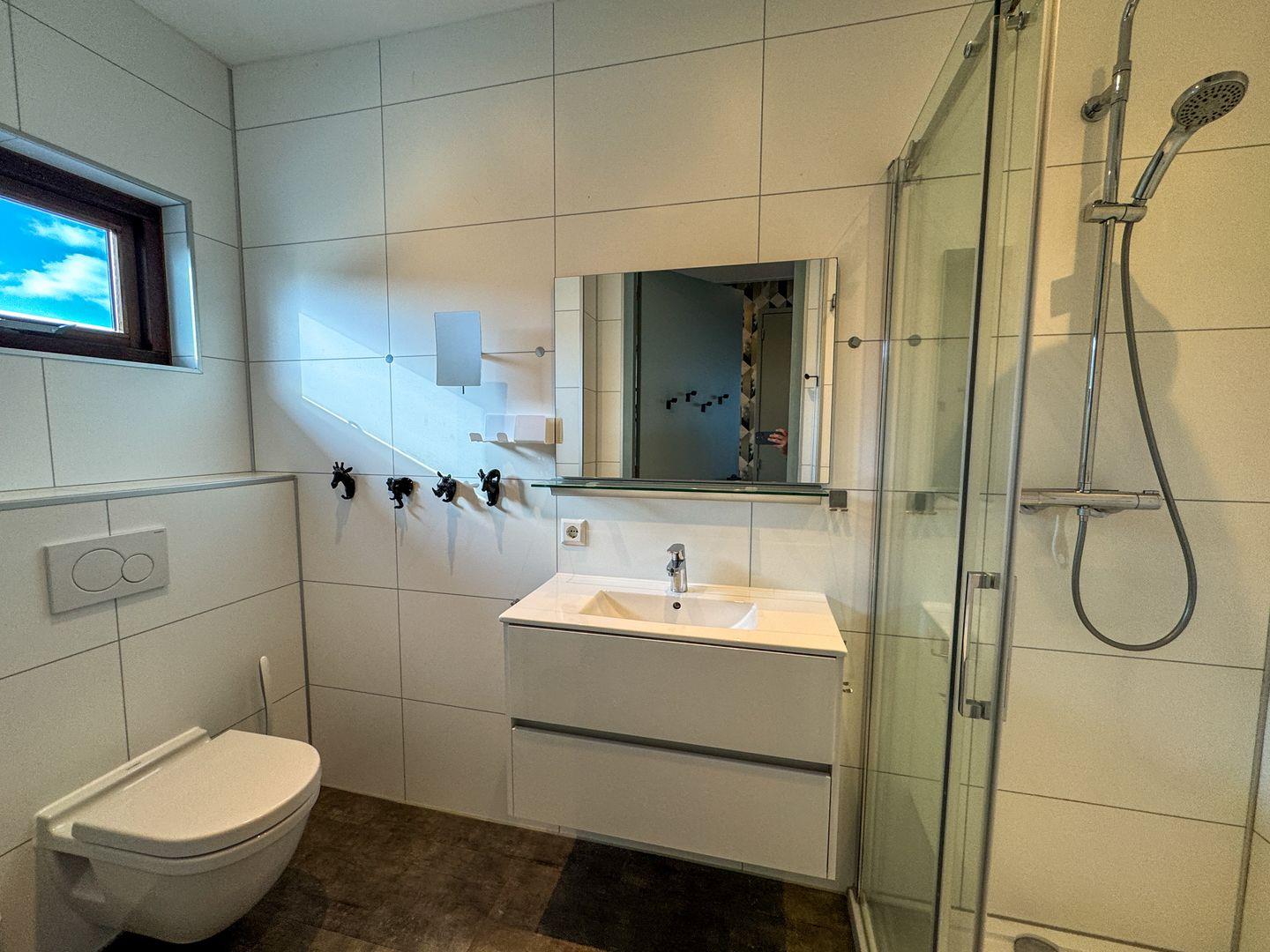 Dusche, Waschbecken und WC sowie Parkplatz direkt am Haus, Fahrradständer und Klimaanlage runden den Komfort ab.