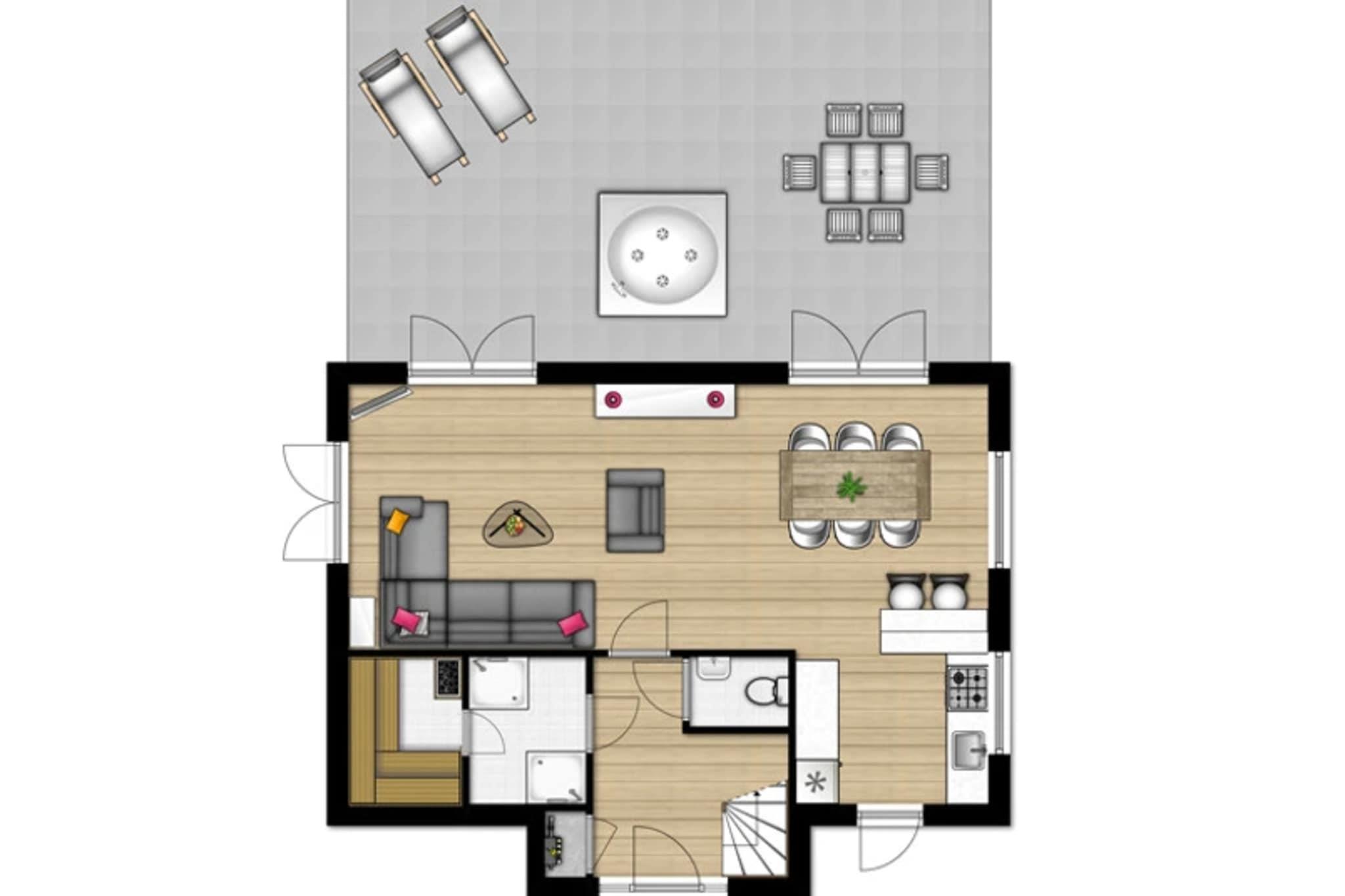 Parterre: (Eingangshalle(Toilette), Wohnzimmer(TV), offene Küche(Wasserkocher, Kaffeemaschine(pads), Kombi-Mikrowelle, Spülmaschine, Kühl-/Gefrierkombination), Badezimmer(Dusche, Sauna, Waschbecken), Abstellraum) In der 1. Etage: (Schlafzimmer(2x Einzelbett(Boxspring)), Schlafzimmer(2x Einzelbett(Boxspring)), Schlafzimmer(2x Einzelbett(Boxspring)), Badezimmer(Badewanne, Waschbecken), Flur) Gartentüren, Terrasse, Garten, Gartenmöbel, Liegen, Parkplatz