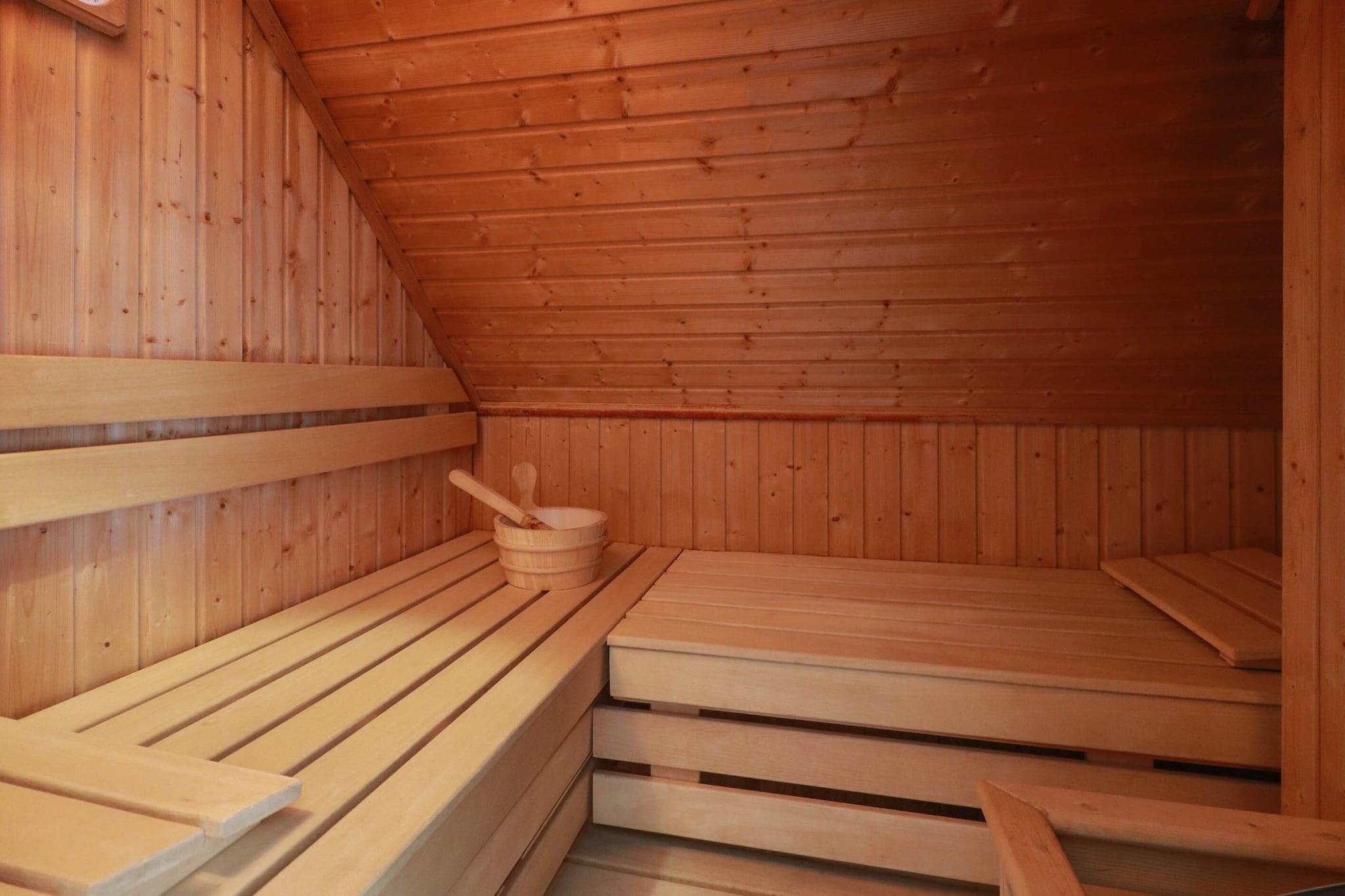 Parterre: (Wohnzimmer(TV, DVD-Spieler), offene Küche(Wasserkocher, Kochherd, Kaffeemaschine(Filter, pads), Mikrowelle, Spülmaschine, Kühlschrank(+ Gefrierfach)), Schlafzimmer(Doppelbett oder 2 Einzelbetten), Toilette) In der 1. Etage: (Schlafzimmer(Doppelbett oder 2 Einzelbetten), Schlafzimmer(Doppelbett oder 2 Einzelbetten), Schlafzimmer(Einzelbett, Einzelbett), Badezimmer(Badewanne, Dusche, Waschbecken), Toilette) Sauna, Terrasse, Garten, Gartenmöbel, Parkplatz