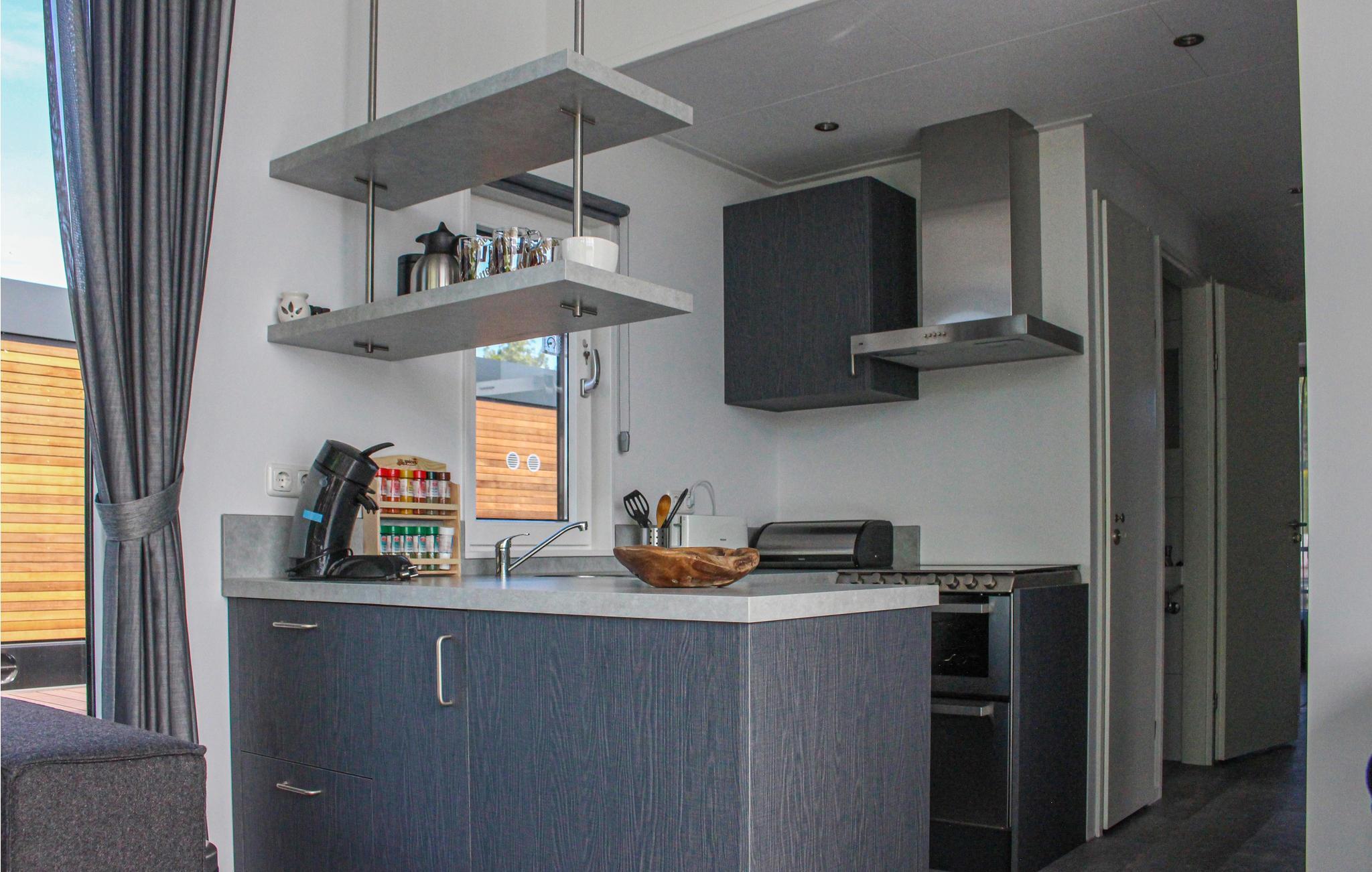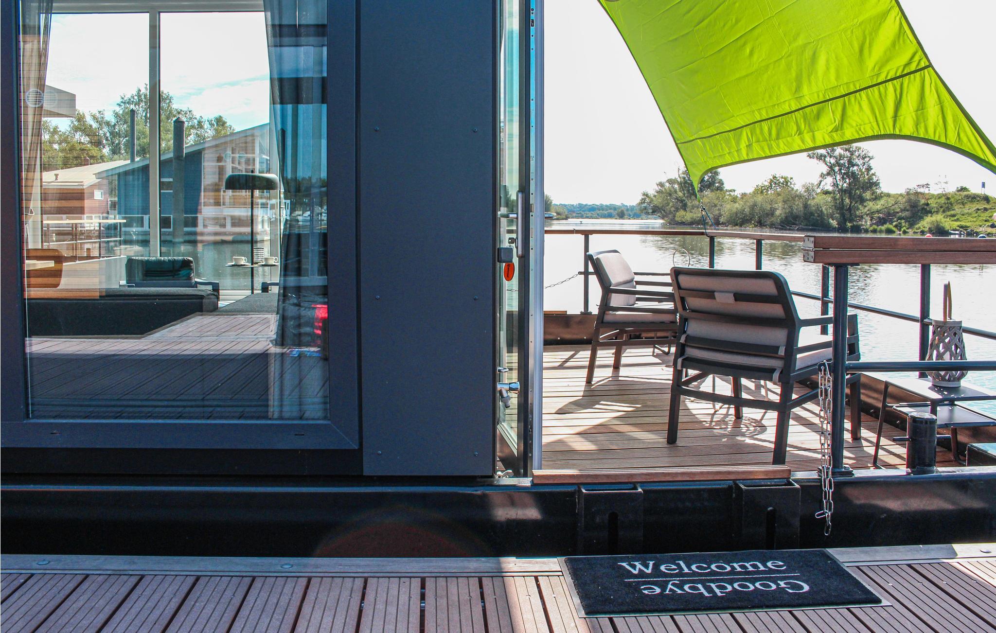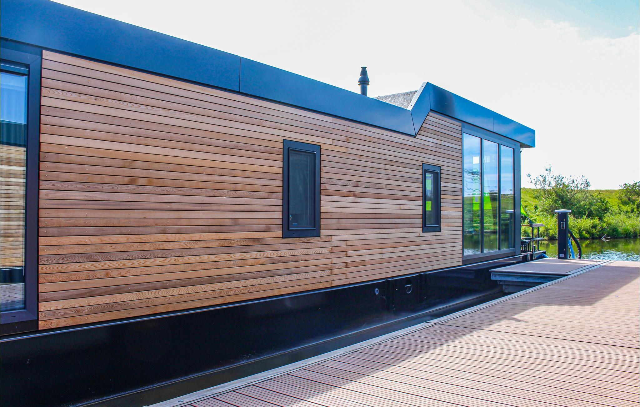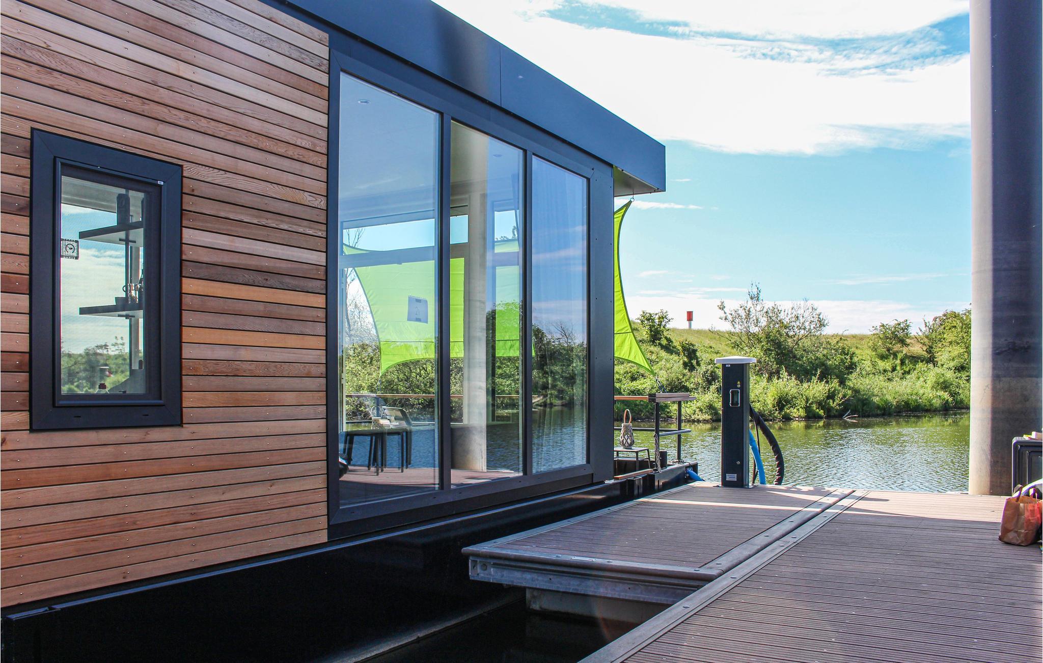 Das schwimmende Ferienhaus verfügt über einen eigenen Steg, an dem Sie Ihr kleineres Boot, Kanu oder SUP festmachen können. Sie betreten das Haus über die Terrasse mit freiem Blick auf das Wasser. Wenn Sie Schatten brauchen, hält der Eigentümer im Haus ein Sonnensegel für Sie bereit. Über die Terrasse betreten Sie das Wohnzimmer mit offener Küche. Vom Sitz- und Essbereich haben Sie einen schönen Blick auf das umliegende Wasser. Für ein Hausboot ist die Küche überdurchschnittlich gut ausgestattet. Zum Beispiel gibt es einen kleinen Geschirrspüler und einem Ofen. Die Schlafzimmer hat ein Doppelbett (200x180cm). Wenn Sie getrennt schlafen möchten, steht ein zweiter Schlafbereich zur Verfügung.