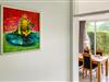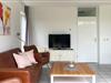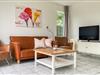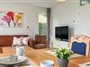 Das Wohnzimmer dieses gemütlichen Ferienhauses in Holland hat große Fensterpartien mit Blick auf den Garten und das Wasser. Das Haus ist komfortabel eingerichtet, mit schönen Details und Dekorationen, die eine warme Atmosphäre schaffen.