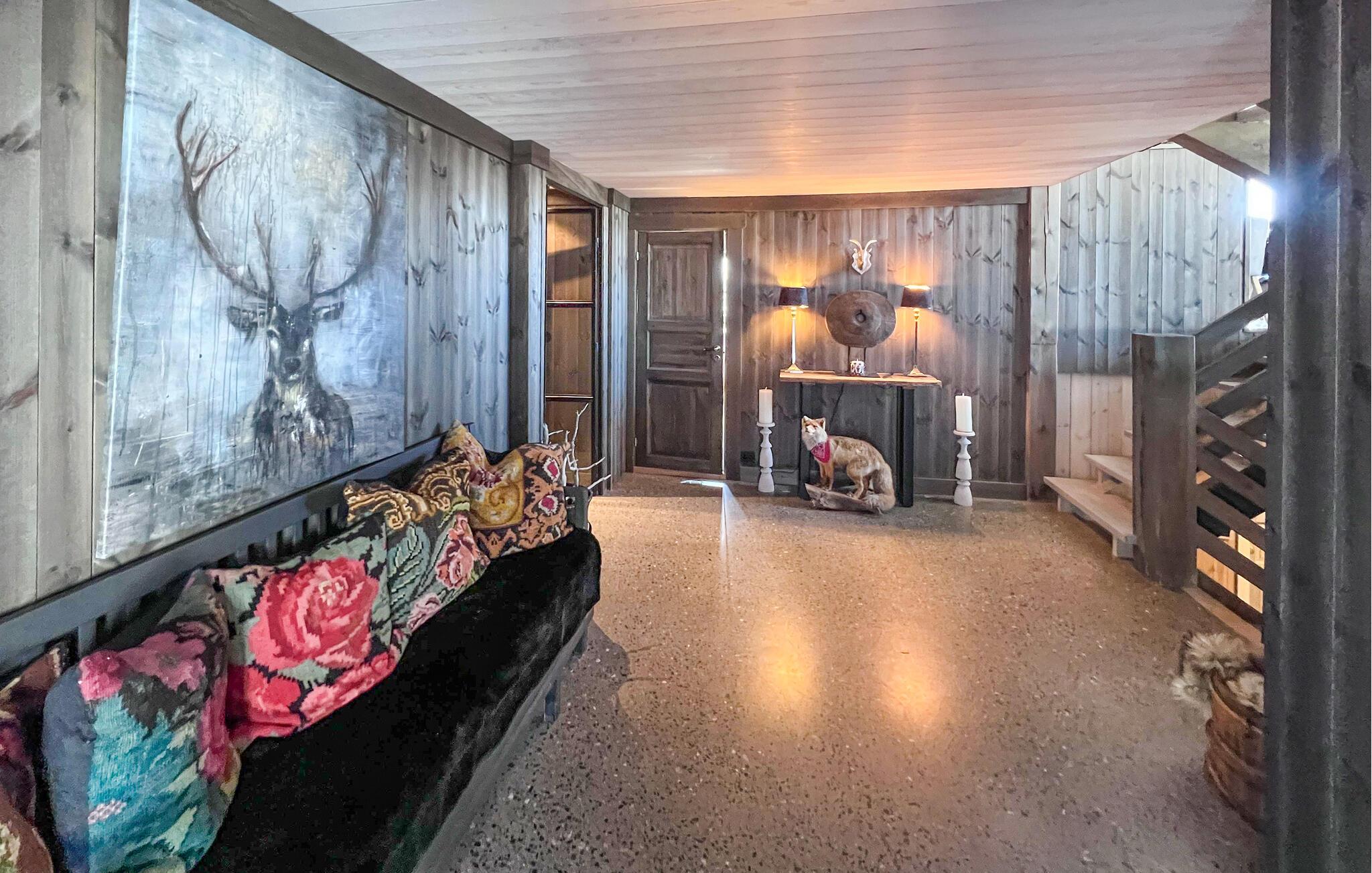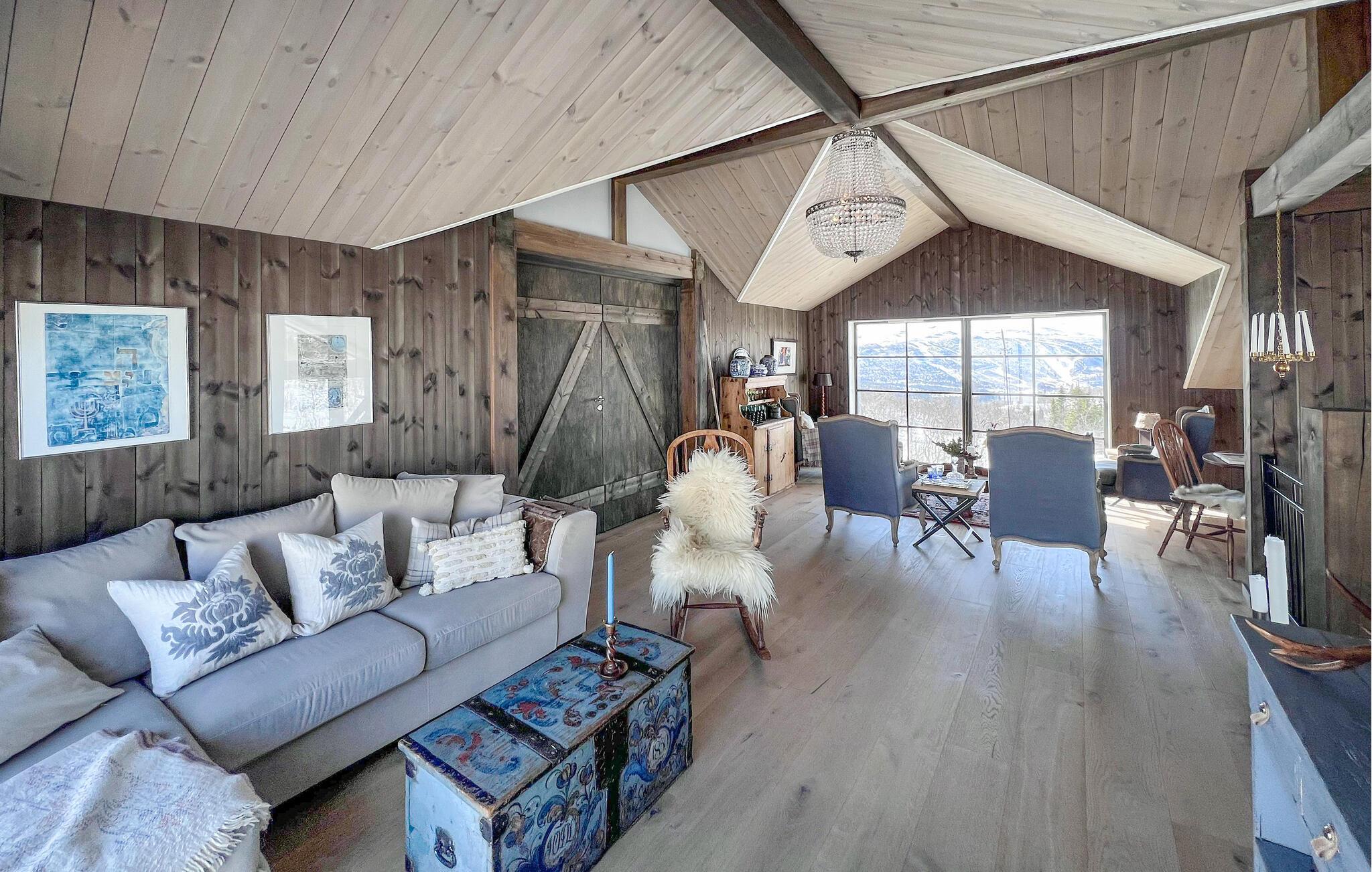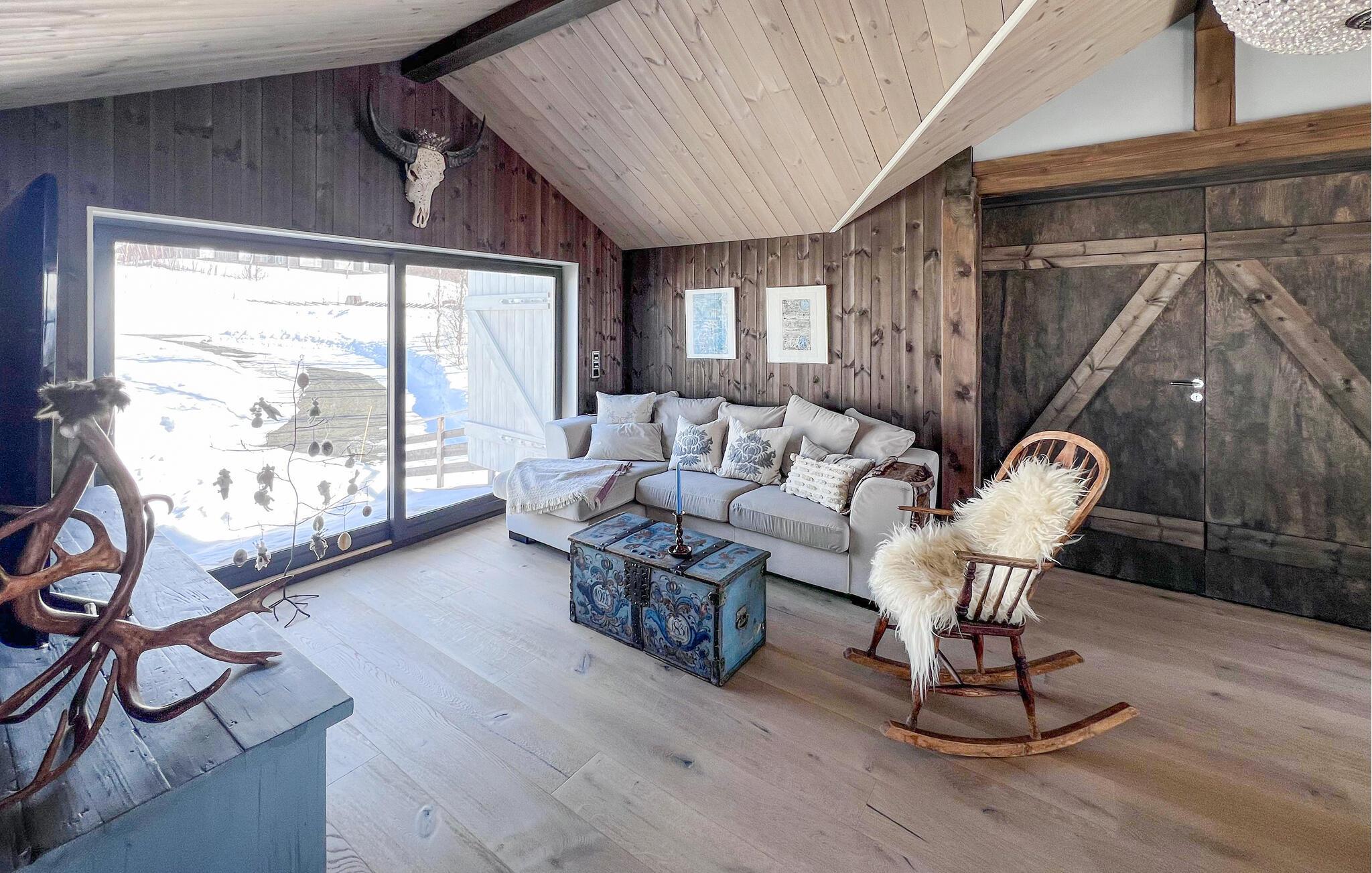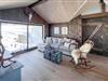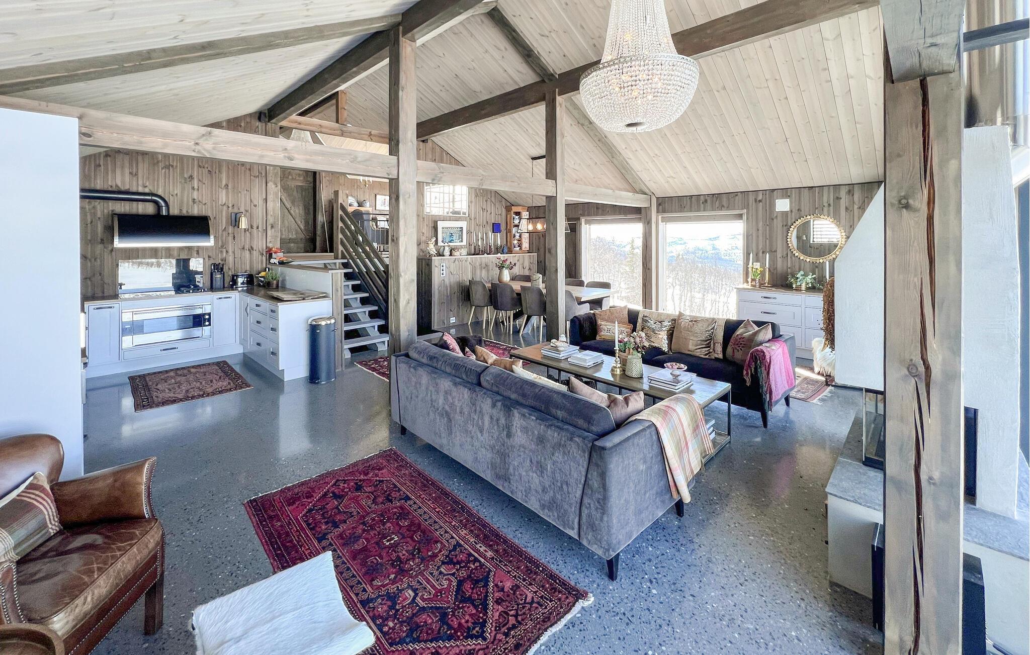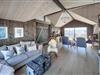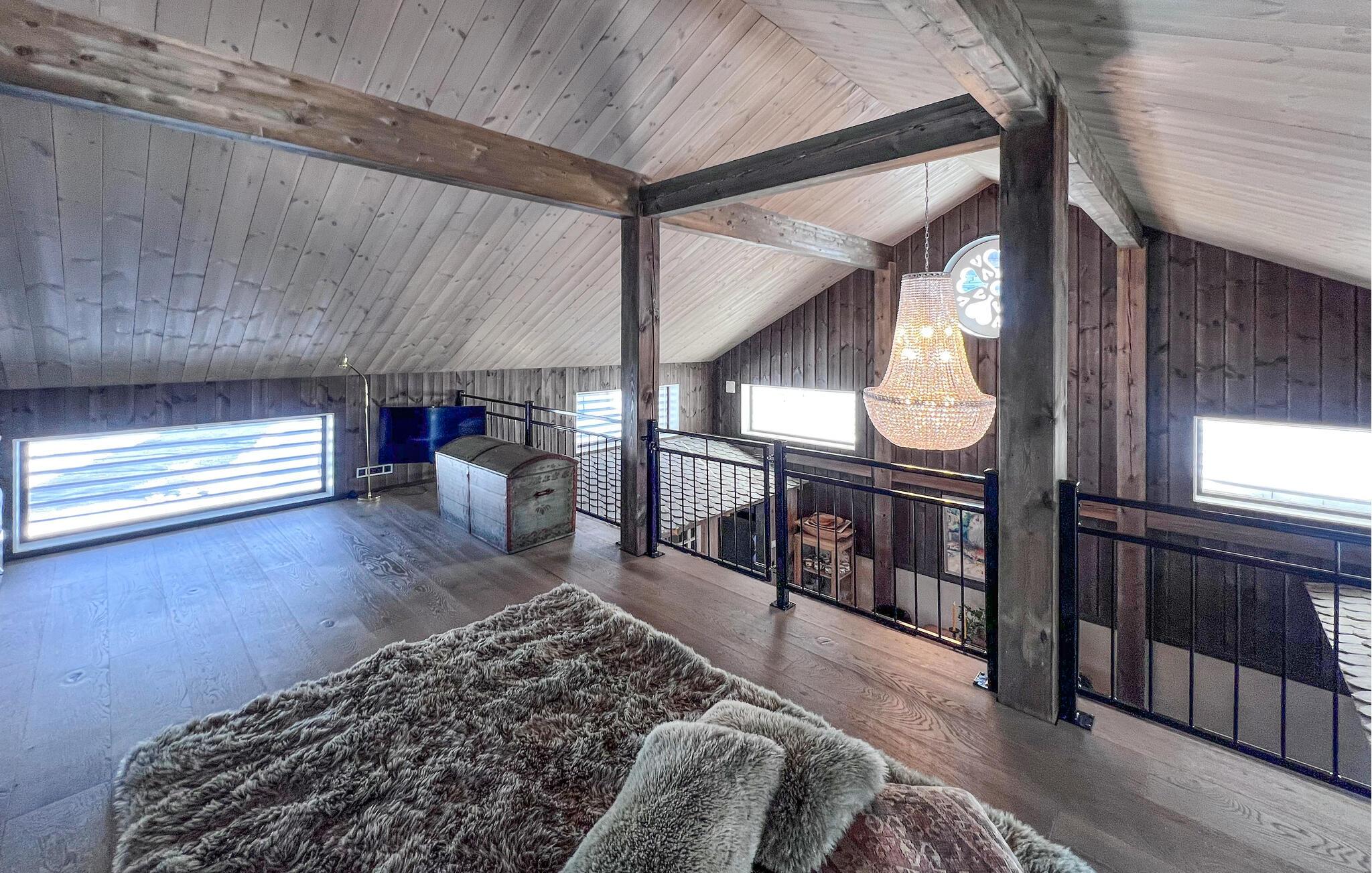 Erleben Sie den weitläufigen Innenbereich mit hohen Decken, sichtbaren Holzbalken und großen Fensterfronten. Lassen Sie sich im lichtdurchfluteten Wohnraum nieder und genießen Sie den Blick auf die Landschaft. Mehrere gemütliche Sitzbereiche mit stilvollen Möbeln schaffen Raum für entspannte Stunden. Nutzen Sie den offenen Essbereich für lange Abende in geselliger Runde. Die schöne Küche bietet Ihnen viel Arbeitsfläche, sodass Sie Ihre Mahlzeiten bequem zubereiten können. Ziehen Sie sich in ruhige Ecken mit bequemen Sesseln zurück oder nutzen Sie den großzügigen Schlafboden unter dem Dach.
