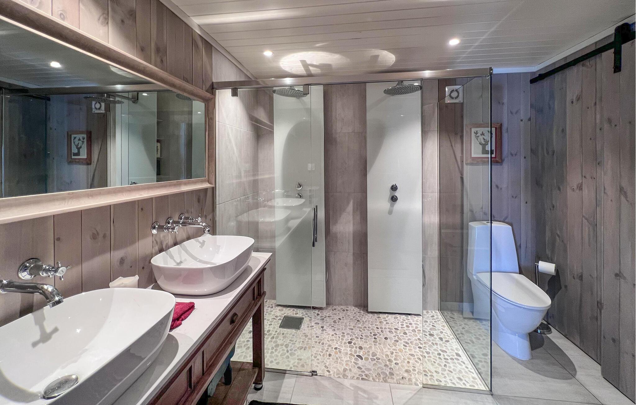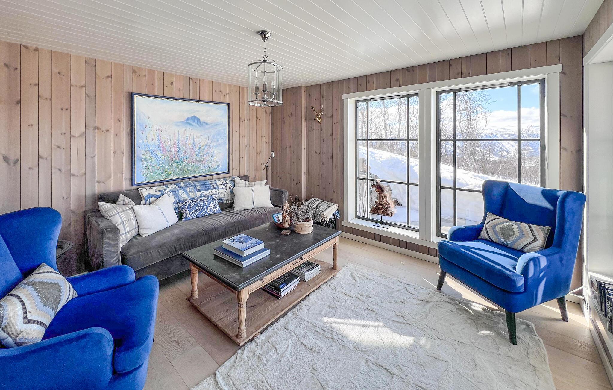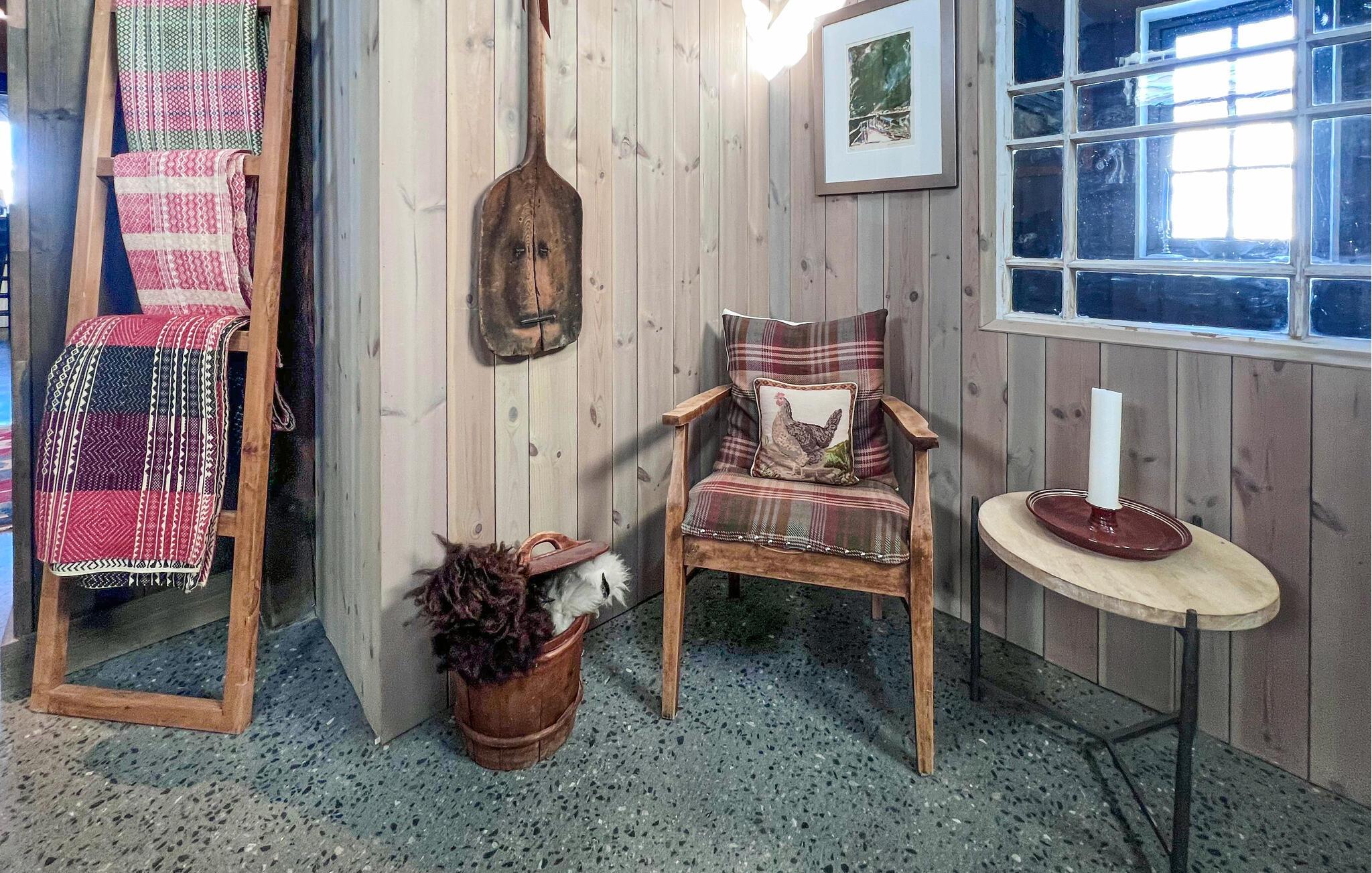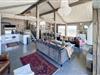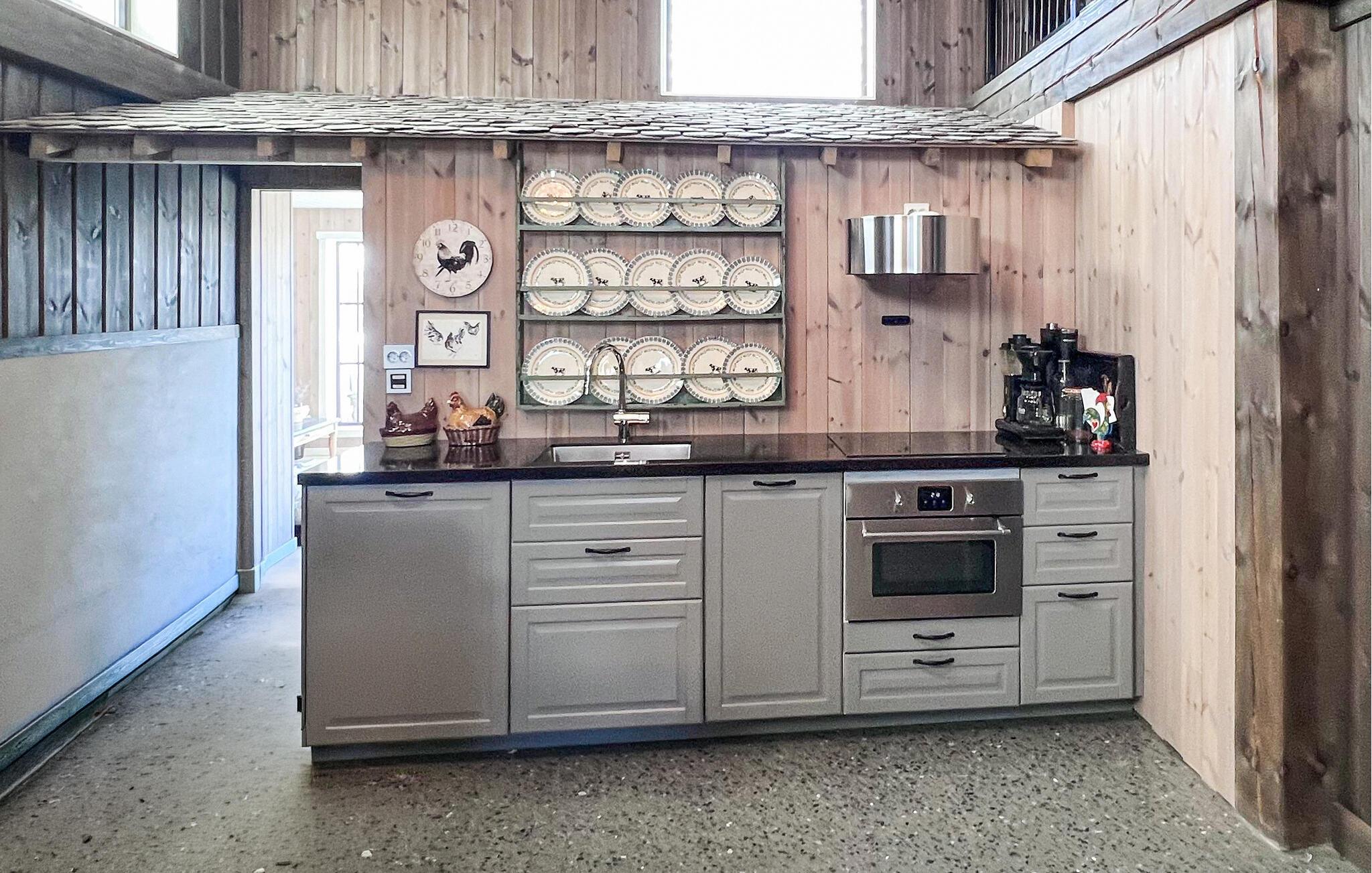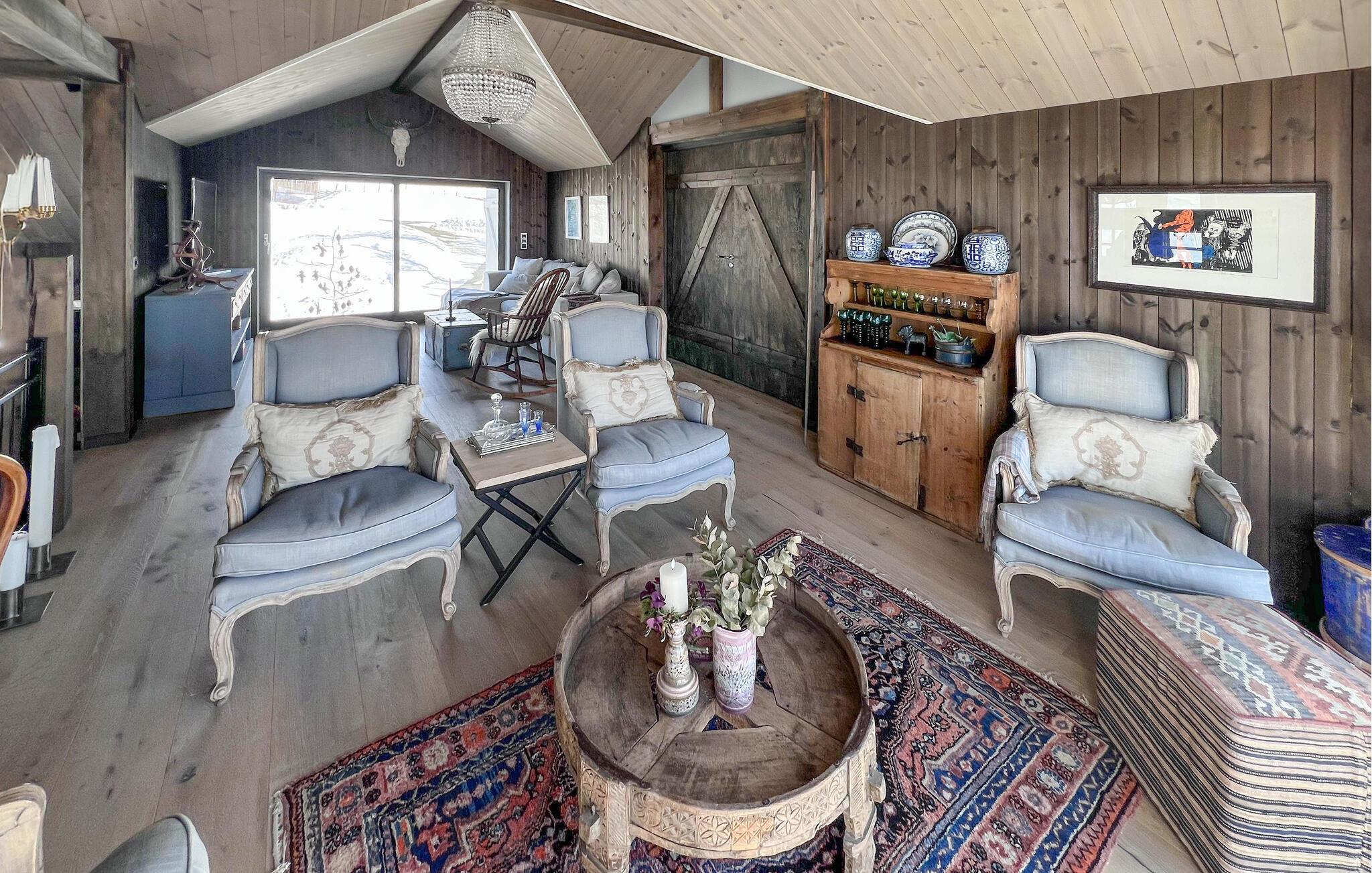 Erleben Sie den weitläufigen Innenbereich mit hohen Decken, sichtbaren Holzbalken und großen Fensterfronten. Lassen Sie sich im lichtdurchfluteten Wohnraum nieder und genießen Sie den Blick auf die Landschaft. Mehrere gemütliche Sitzbereiche mit stilvollen Möbeln schaffen Raum für entspannte Stunden. Nutzen Sie den offenen Essbereich für lange Abende in geselliger Runde. Die schöne Küche bietet Ihnen viel Arbeitsfläche, sodass Sie Ihre Mahlzeiten bequem zubereiten können. Ziehen Sie sich in ruhige Ecken mit bequemen Sesseln zurück oder nutzen Sie den großzügigen Schlafboden unter dem Dach.