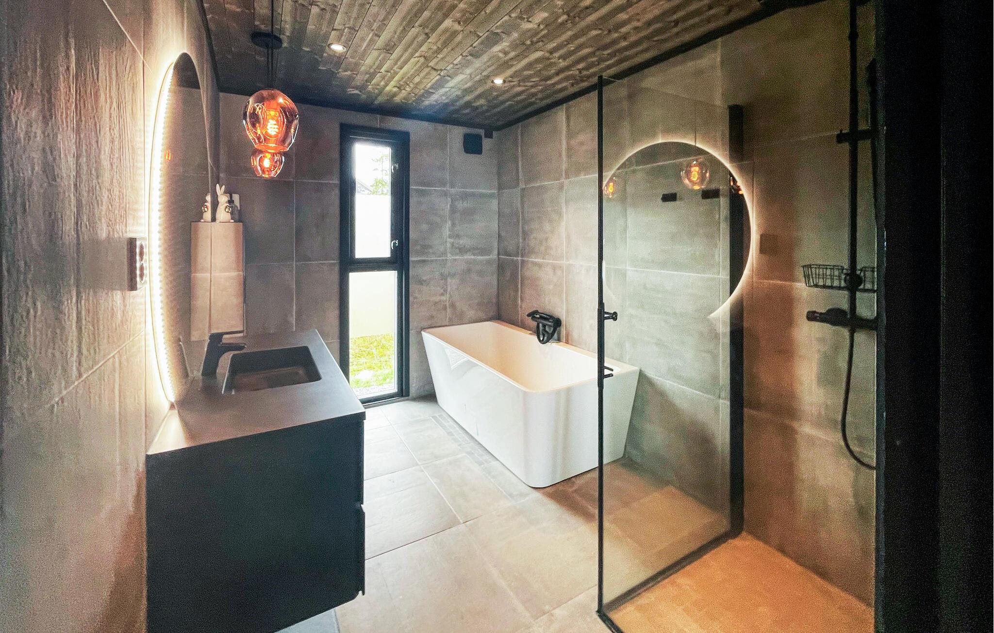 Erleben Sie erholsame Ferientage in Ihrem geschmackvoll gestalteten Ferienhaus, das sich harmonisch in die Landschaft einfügt. Hier wohnen Sie in ruhiger Umgebung mit guter Anbindung an Outdoor-Aktivitäten. Treten Sie ein in das offen und hochwertig eingerichtete Innere des Hauses. Entspannen Sie auf den gemütlichen Sofas im lichtdurchfluteten Wohnbereich und lassen Sie den Blick durch die großen Panoramafenster in die weite Natur schweifen. Genießen Sie gemeinsame Mahlzeiten im stilvollen Essbereich mit Kaminofen oder kochen Sie in der modernen Küche mit elegantem Design und hochwertigen Geräten. Das durchdachte Raumkonzept sorgt für ein angenehmes Wohngefühl mit klaren Linien und warmen Materialien.