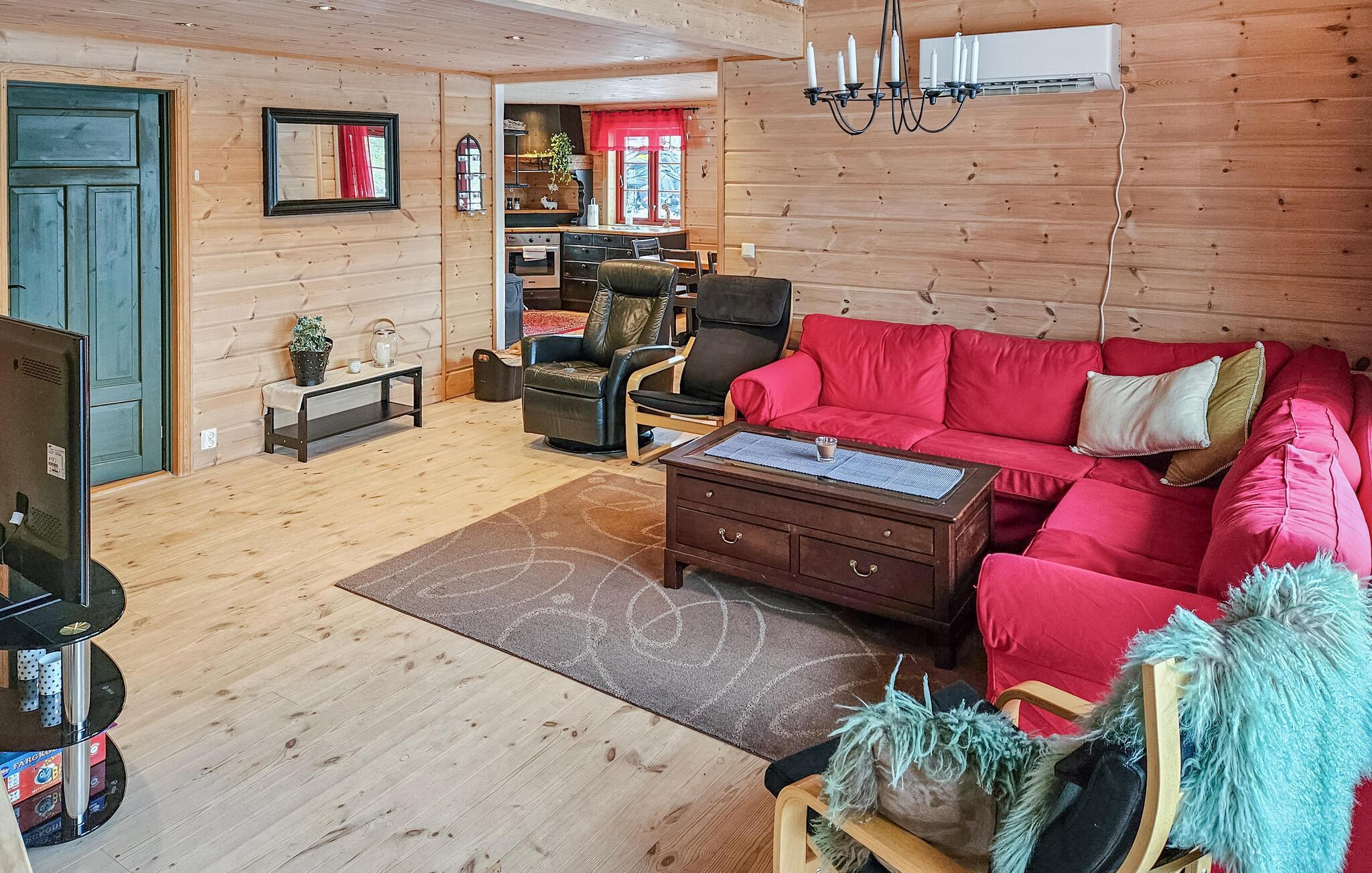 Genießen Sie gleich morgens die schöne Aussicht aus den Fenstern Ihres Ferienhaues. Unweit vom See Sandvatn gelegen, begrüßt Sie Ihr Ferienhaus mit viel Platz für die ganze Familie. Das gemütliche Holzambiente schafft im ganzen Haus eine wohlige Atmosphäre. Genießen Sie nach dem Aufstehen ein wohltuendes Frühstück am schönen Esstisch in der offenen Küche. Das Wohnzimmer lädt zu entspannten Stunden ein. Spielen Sie eine Partie Schach oder ziehen Sie sich in die Sofalandschaft im ersten Stock zurück. Hier oben können Sie sich auch am Billardtisch vergnügen. Der großzügige Außenbereich bietet Platz für einen Snack und ein Erfrischungsgetränk am Nachmittag.
