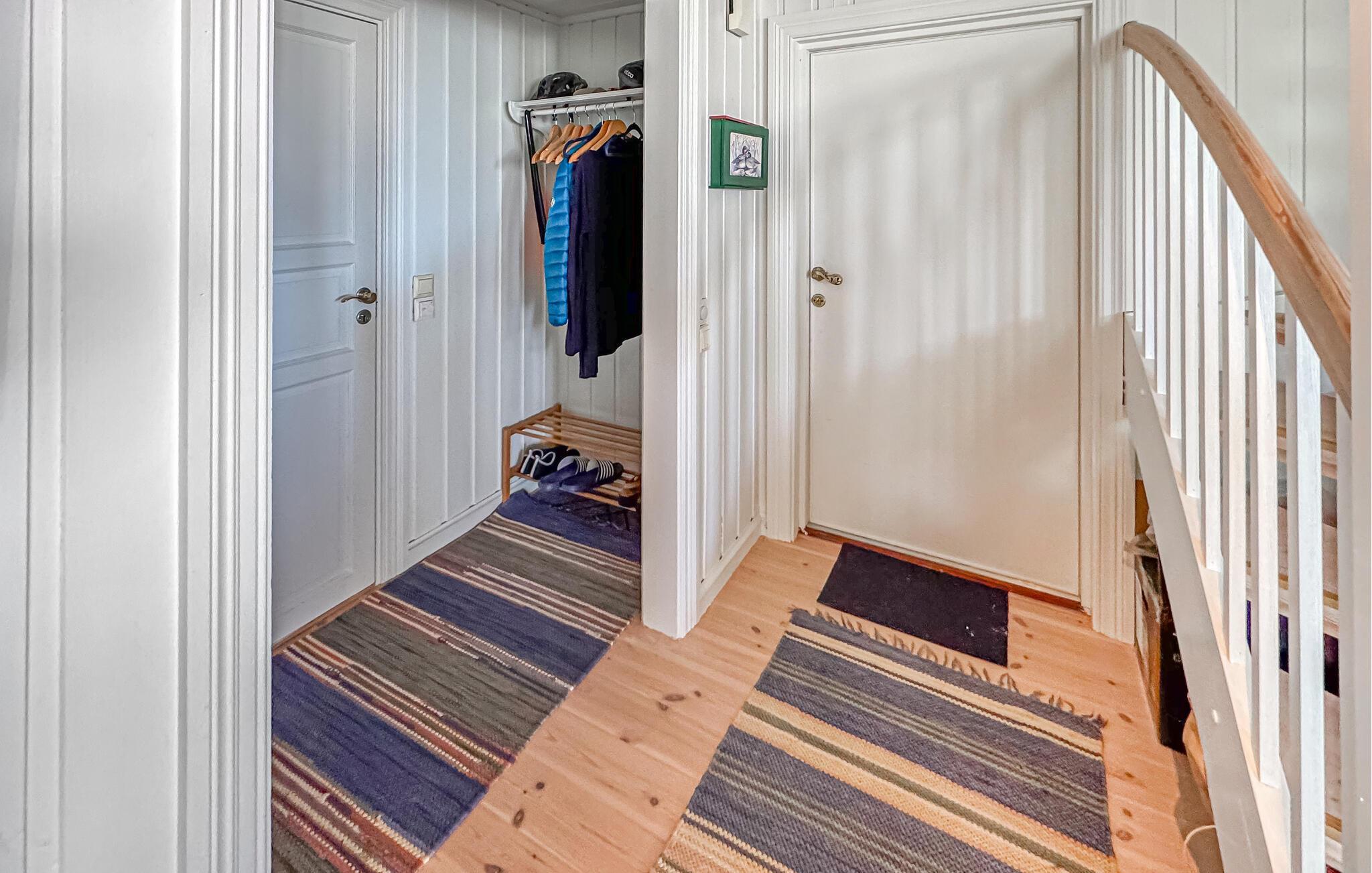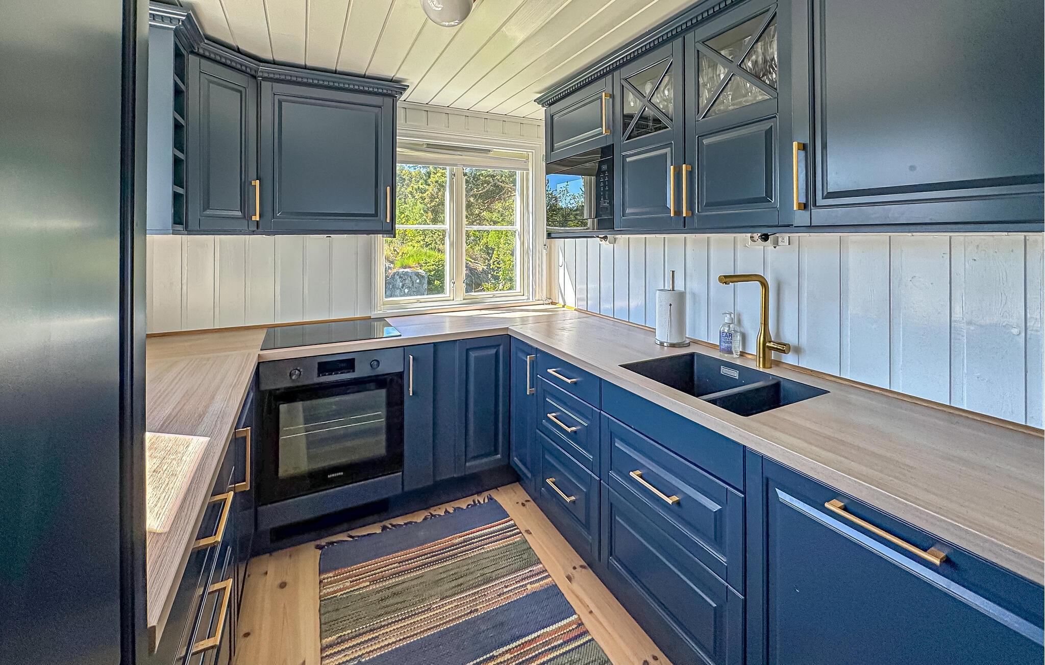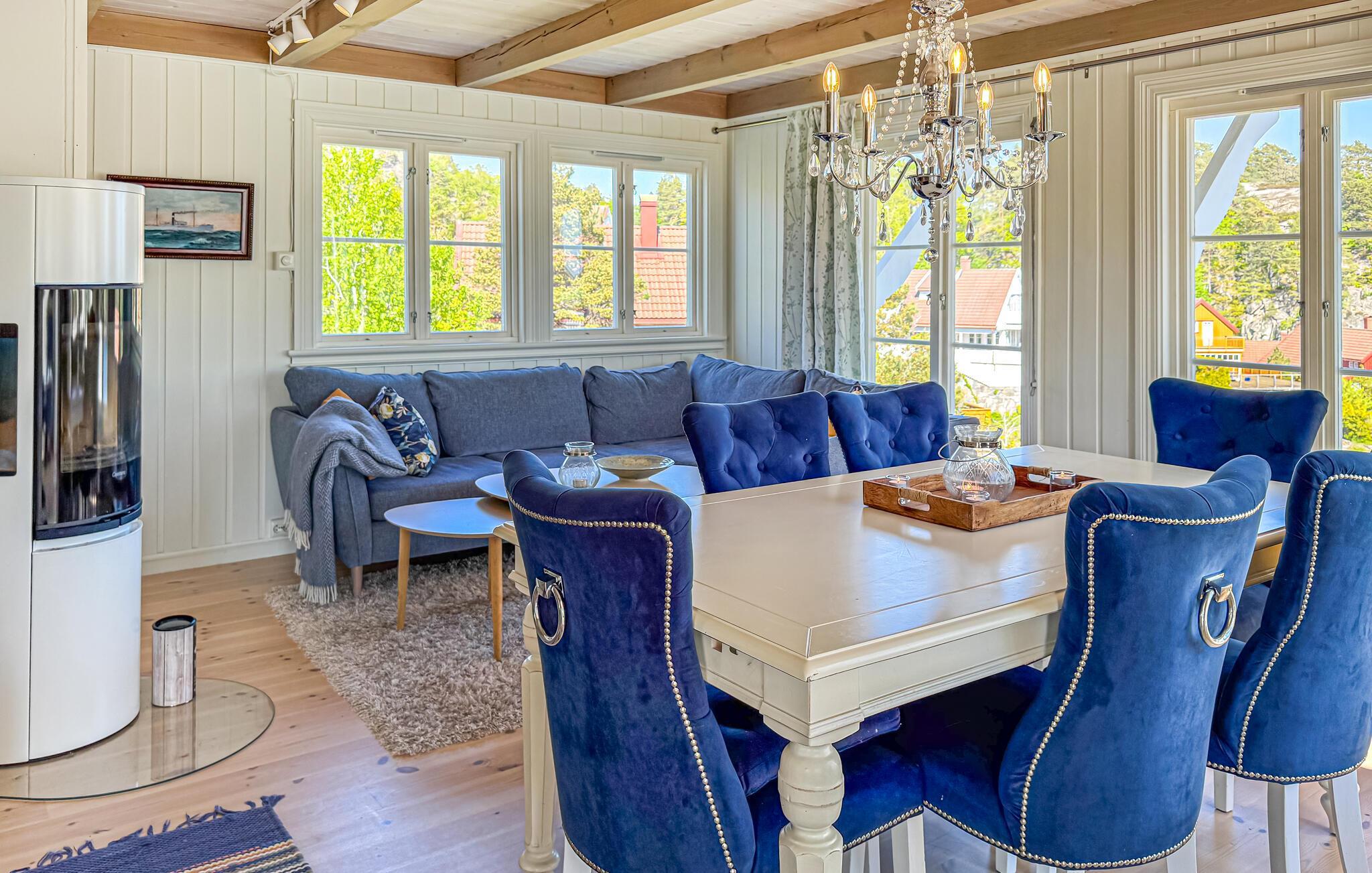 Verbringen Sie erholsame Urlaubstage in diesem hellen und geschmackvoll eingerichteten Ferienhaus in Hanglage mit weitem Blick auf das Wasser. Die erhöhte Lage bietet Ihnen nicht nur Ruhe, sondern auch eindrucksvolle Ausblicke auf die typisch norwegische Küstenlandschaft. Genießen Sie im großzügigen Wohnbereich mit Ecksofa und Kaminofen entspannte Stunden in stilvoller Umgebung mit viel Tageslicht. Kochen Sie gemeinsam in der eleganten Küche mit schönem Ausblick oder nehmen Sie Ihre Mahlzeiten im einladenden Esszimmer mit bequemen Polsterstühlen und Kronleuchter ein. Auch kleine Rückzugsorte mit Lesesesseln und bodentiefen Fenstern laden zum Verweilen ein.