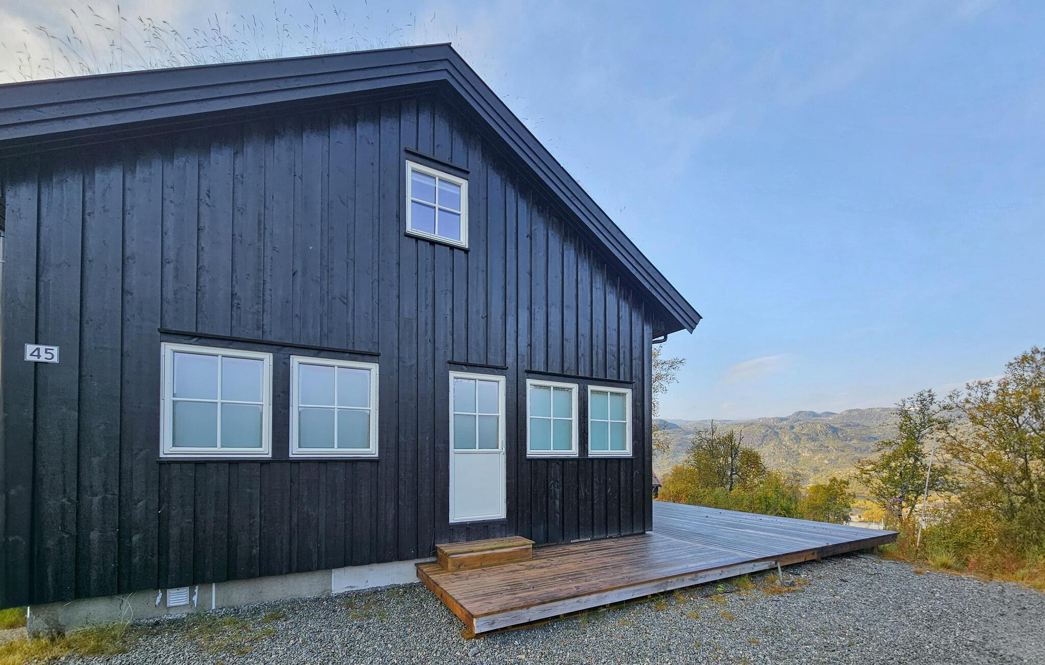 Mit Platz für eine größere Reisegruppe begrüßt Sie Ihr Ferienhaus nahe dem See Eivindbuvatn zu einem erholsamen Urlaub. Das stilvolle Holzhaus mit Naturdach bietet Ihnen nicht nur eine moderne, gemütliche Unterkunft, sondern auch schöne Ausblicke auf die umliegende Natur. Treten Sie ein und lassen Sie sich von der warmen und einladenden Atmosphäre empfangen. Bereiten Sie morgens in der großen Küche ein leckeres Frühstück für alle zu. Das Wohnzimmer, ausgestattet mit einer komfortablen Sofalandschaft und einem Kaminofen, lädt dazu ein, entspannte Abende bei einem Glas Wein oder einem guten Buch zu verbringen. Machen Sie es sich gemütlich und genießen Sie die Ruhe und Geborgenheit, die dieses Haus bietet. Das Ferienhaus bietet Ihnen auch einen separaten Sofabereich im Obergeschoss, ideal für Filmabende oder gesellige Runden. Verbringen Sie hier gemütliche Stunden mit Ihrer Familie und genießen Sie den Panoramablick auf die wunderschöne Landschaft durch die großen Fensterfronten.
