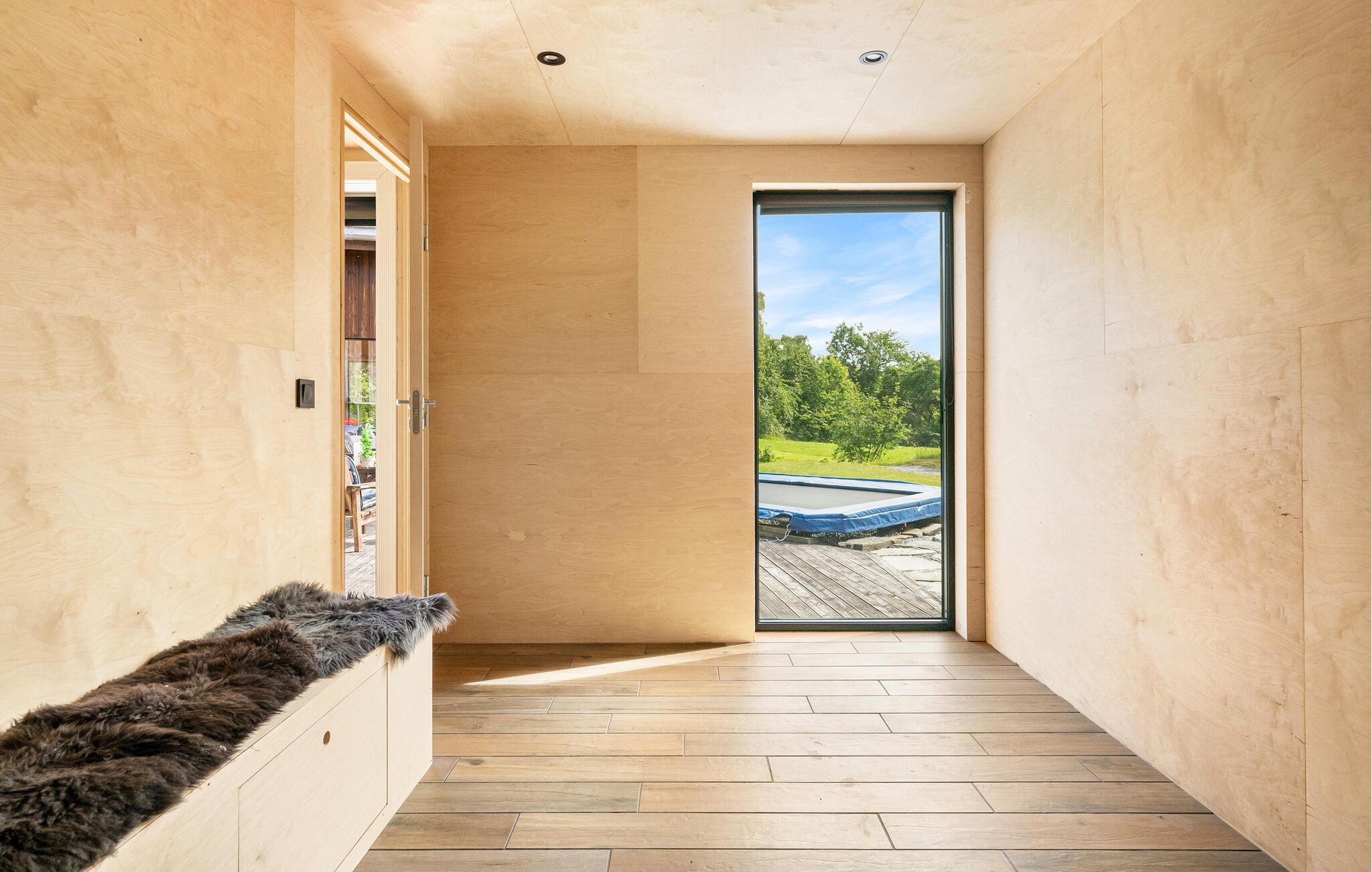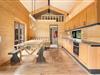Verbringen Sie entspannte Tage in naturnaher Umgebung, ideal für Familien, die Natur, Komfort und Aktivitäten verbinden möchten. Dieses geschmackvoll gestaltete Holzhaus bietet ideale Bedingungen für einen gelungenen Aufenthalt direkt am Fjord. Genießen Sie den großzügigen Wohnraum mit hohen Decken, viel Holz und großen Fenstern, die den Blick ins Grüne freigeben. Machen Sie es sich in der Sofaecke gemütlich oder decken Sie den Esstisch für gemeinsame Mahlzeiten. Kochen Sie in der modernen Küche, in der auch mehrere Personen bequem zusammen die Kochlöffel schwingen können. Die offene Raumgestaltung lädt zu entspannten Stunden in freundlicher Atmosphäre ein.