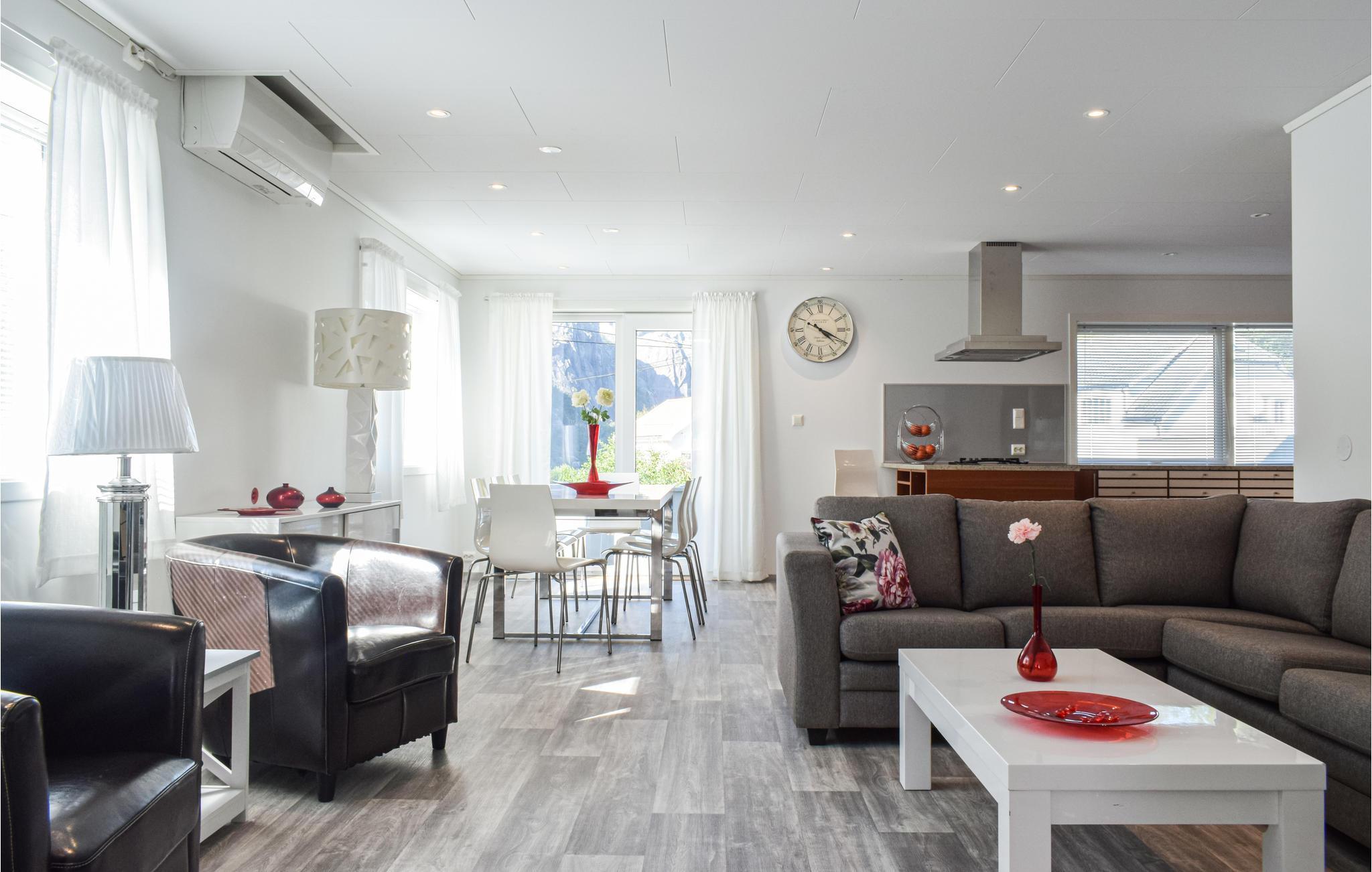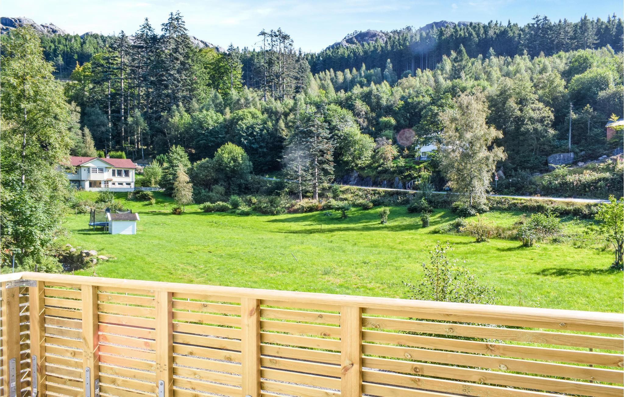 Vom Wohnzimmer aus gelangen Sie auf die offene Terrasse, wo Sie einen schönen Blick auf die Felsen und den Wald haben. Vom Haus aus haben Sie außerdem teilweise einen Blick auf den naheligenden Fjord. Zum Haus gehören ein Grill und ein offenes Grundstück, die Sie gerne benutzen können.