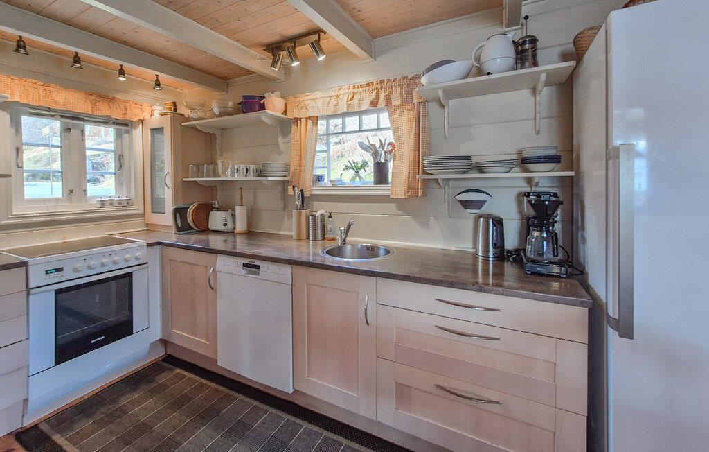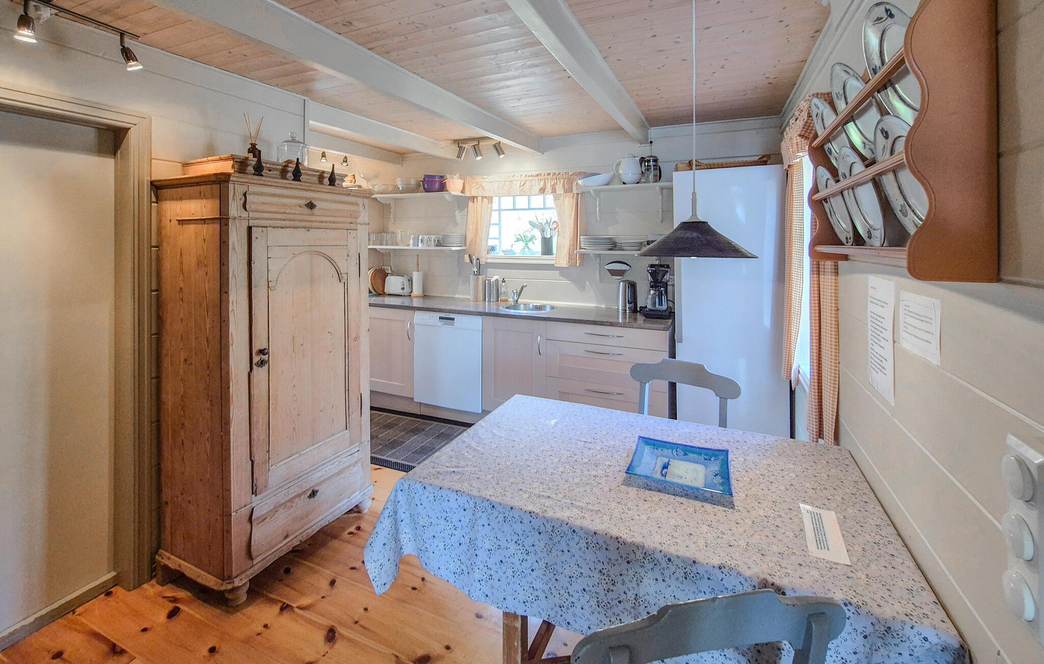 Genießen Sie erholsame Tage in Ihrem modernisierten, aber dennoch authentischen Ferienhaus mit Blick auf den Høylandssundet. Lassen Sie sich von der idyllischen Umgebung verzaubern und genießen Sie die Ruhe und Natur direkt am Fjord. Betreten Sie das gemütliche Wohnzimmer mit seinen warmen Holzwänden und der liebevoll ausgewählten Einrichtung. Machen Sie es sich in der behaglichen Sitzecke bequem oder genießen Sie entspannte Abende bei einem leckeren Dinner vor dem Kamin. Die angrenzende Küche bietet die Möglichkeit, gemeinsam zu kochen.