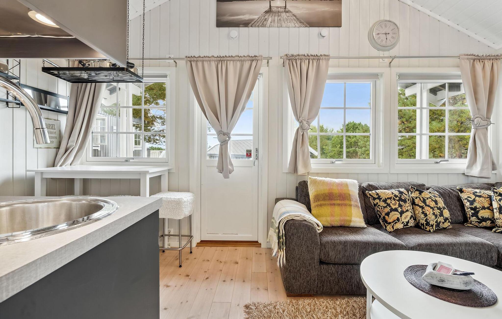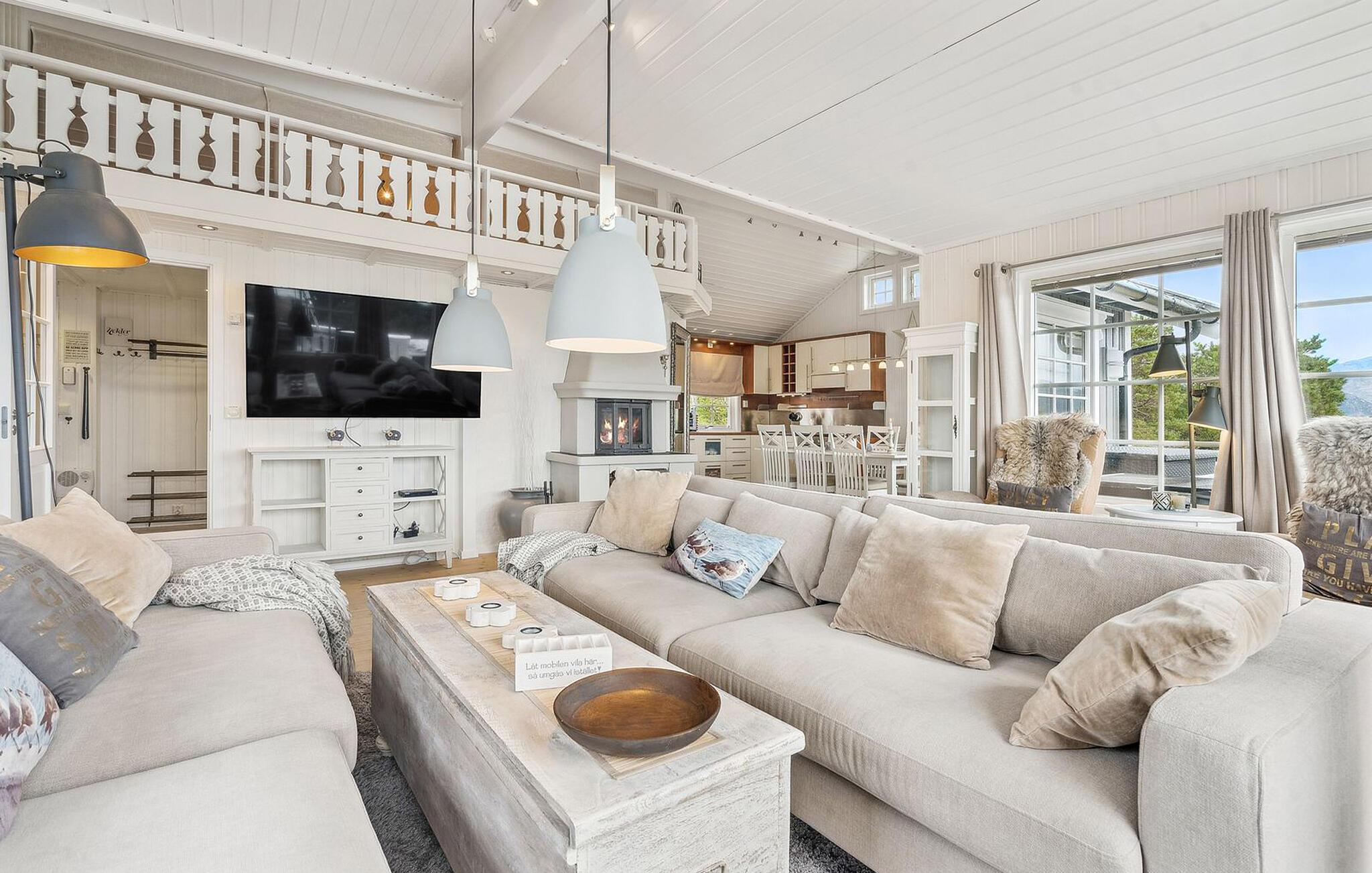 Dieses einmalige Haus empfängt Sie in fantastischer Lage direkt am Meer. Die weitläufigen Räume sind modern eingerichtet und erzeugen mit ihren komfortablen Sitzmöglichkeiten ein ruhiges Ambiente. Finden Sie Ihren Platz auf dem weichen Sofa, am Esstisch oder in einer ruhigen Ecke des Hauses und genießen Sie einen traumhaften Blick auf die Natur. Entzünden Sie an kühlen Tagen den Kamin im Wohnzimmer und verbringen Sie lustige Abende mit Brettspielen oder einem Film.