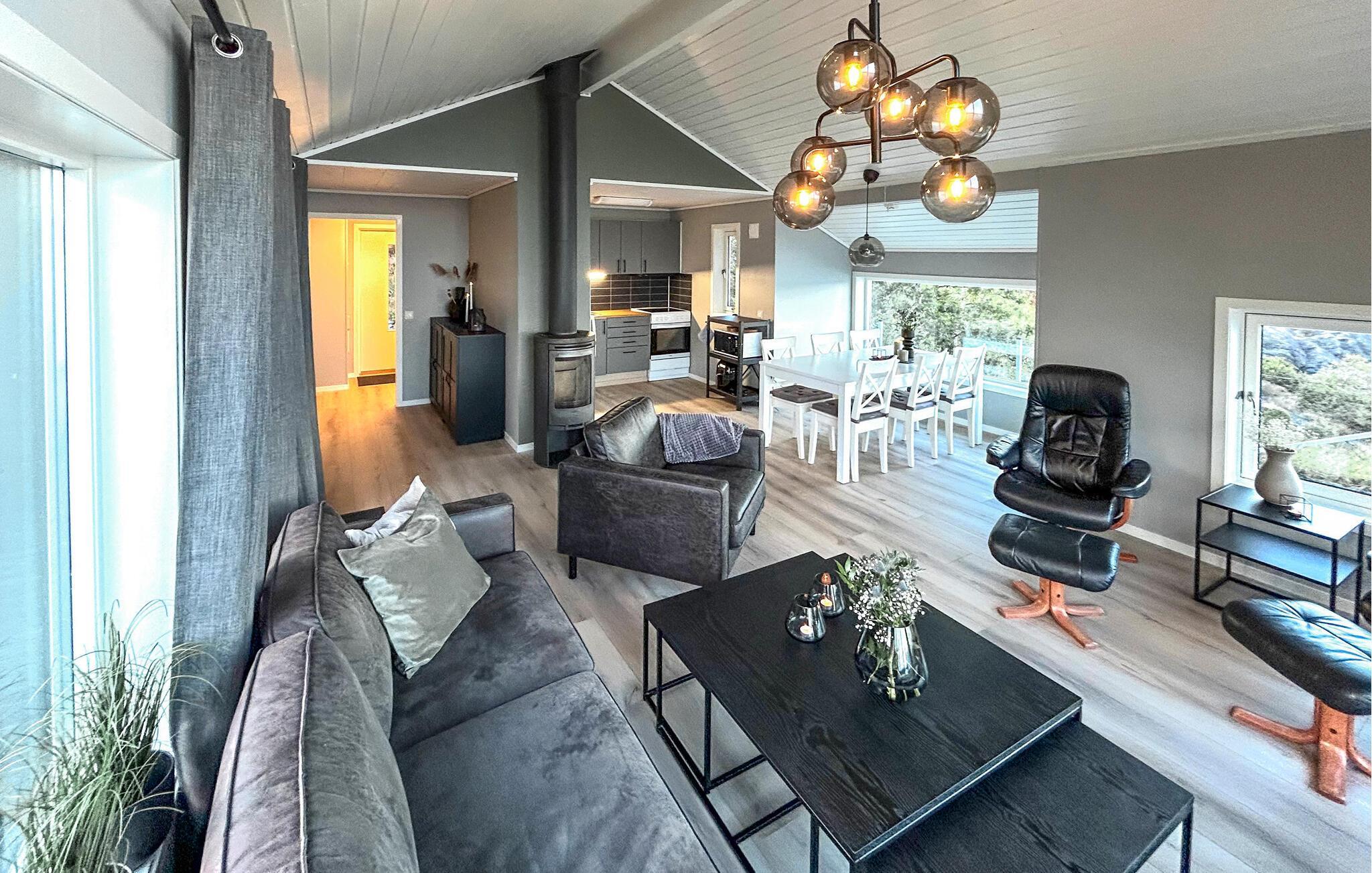 Dieses idyllisch gelegene Haus am Fjord ist der ideale Rückzugsort für eine entspannte Auszeit vom Alltag. Genießen Sie jederzeit den Ausblick durch die großen Panoramafenster, während Sie gemeinsam auf dem komfortablen Sofa entspannen. An kühleren Tagen können Sie im Holzofen ein Feuer entfachen oder sich in der gemütlichen Wärme der Sauna erholen.